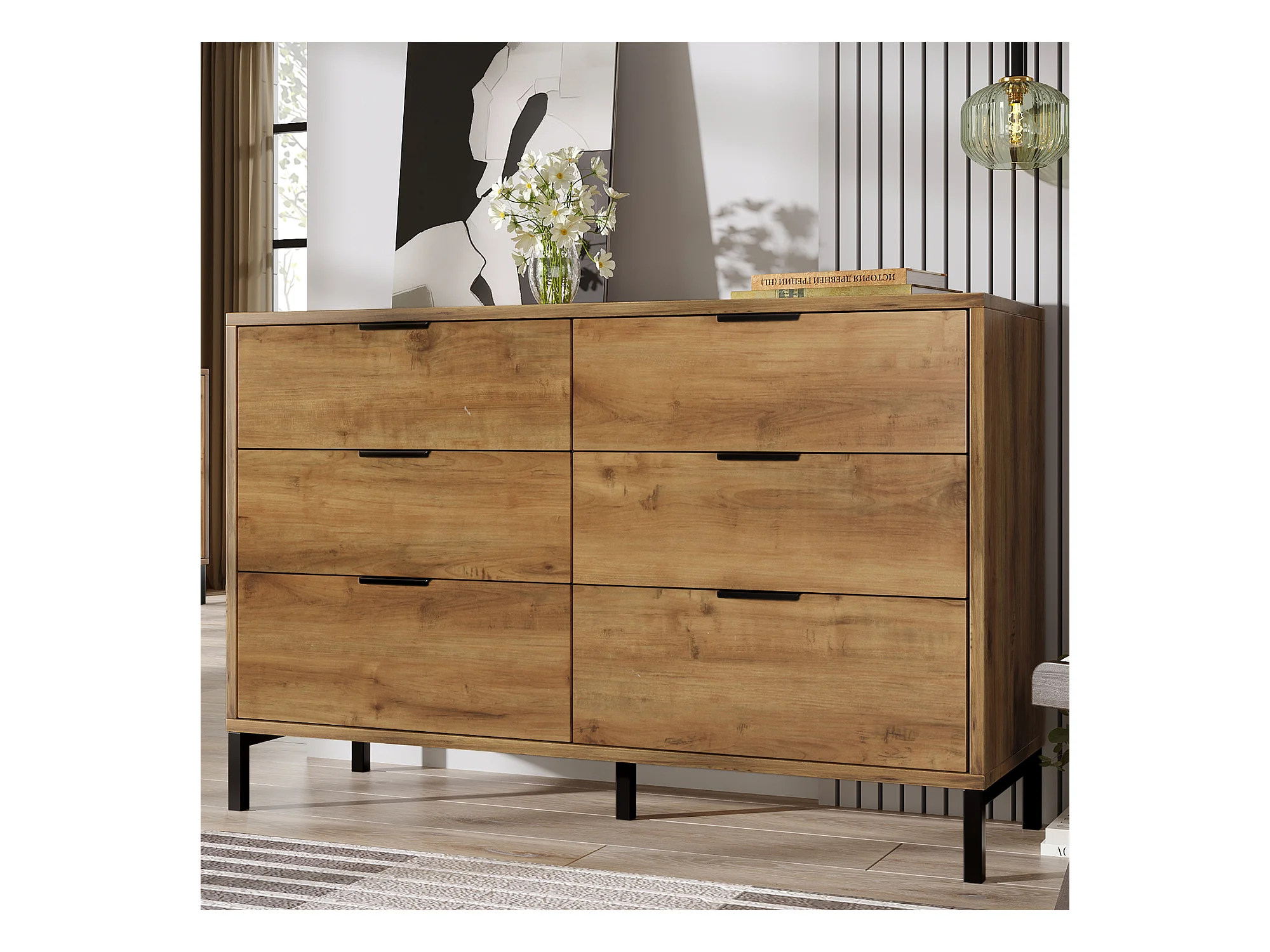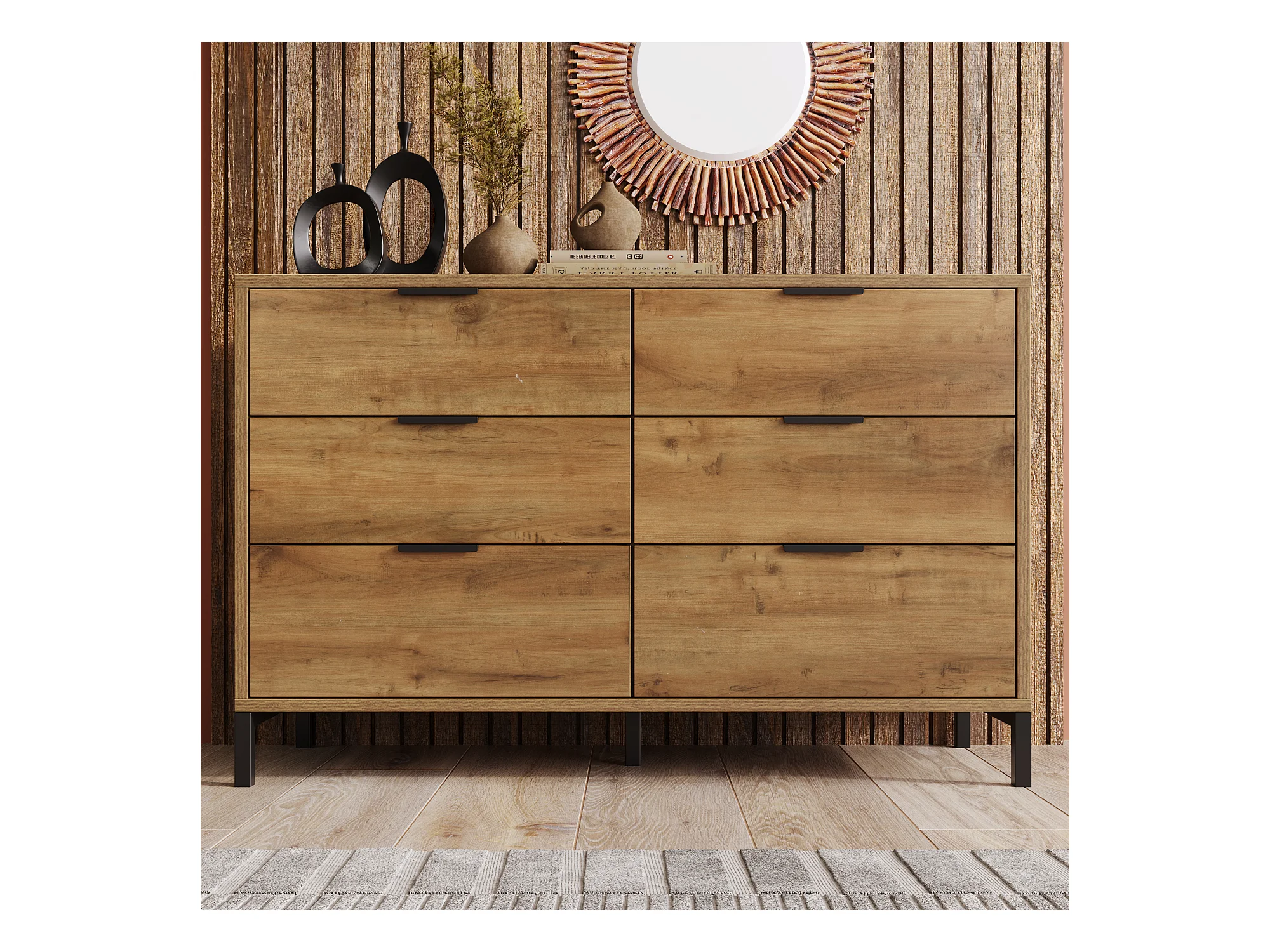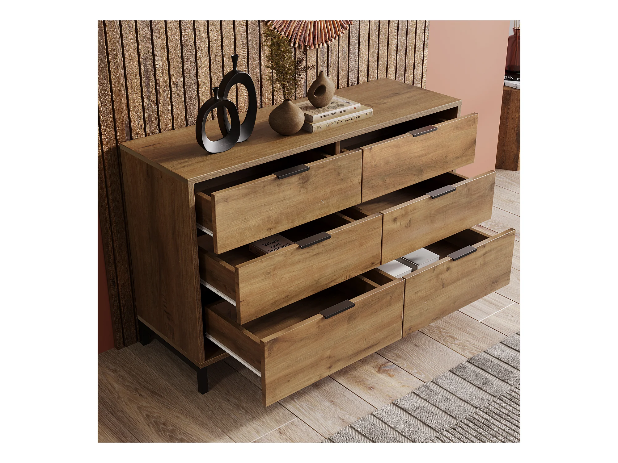 Commode, buffet avec 6 tiroirs, 120 x 40 x 76 cm, Panneaux de particules + métal, Chêne foncé