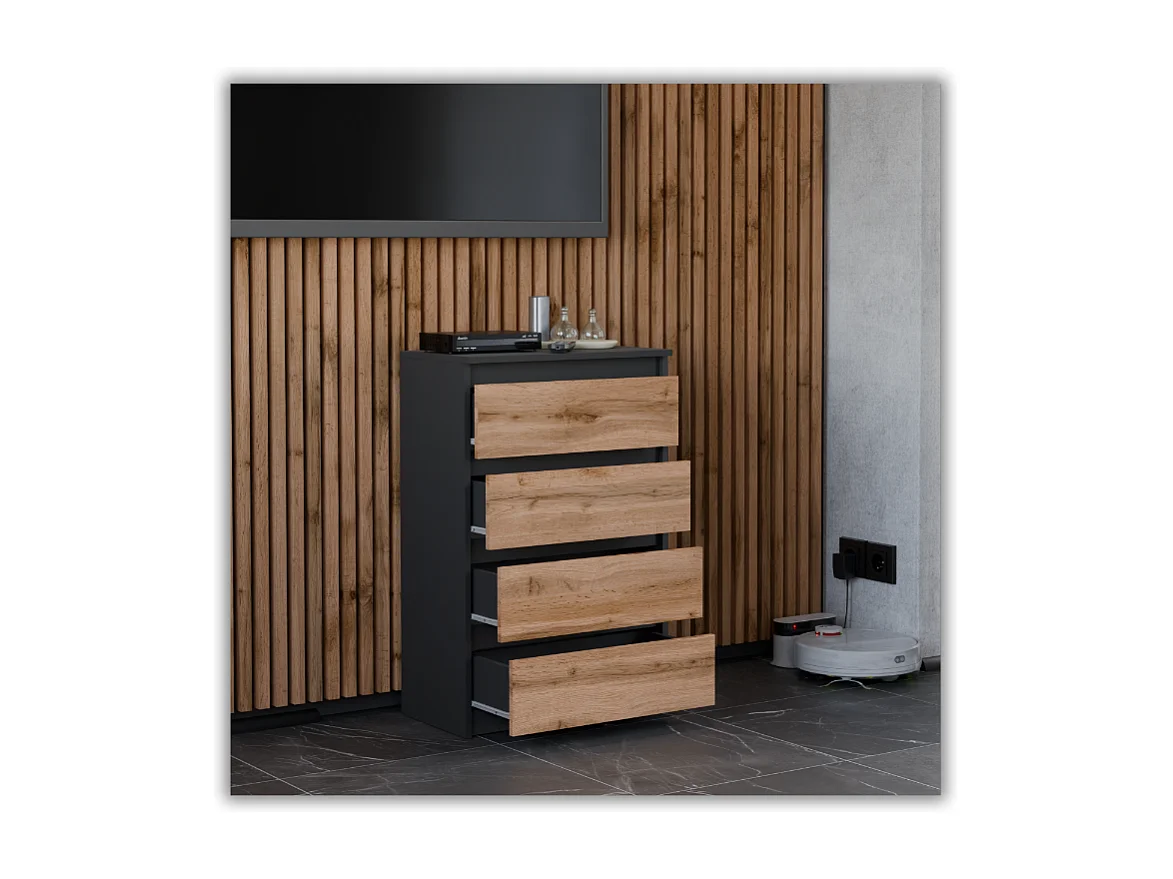 Commode à Tiroirs Noire Chêne Wotan 60 cm Meuble TV Spacieux 4 Tiroirs Style Loft