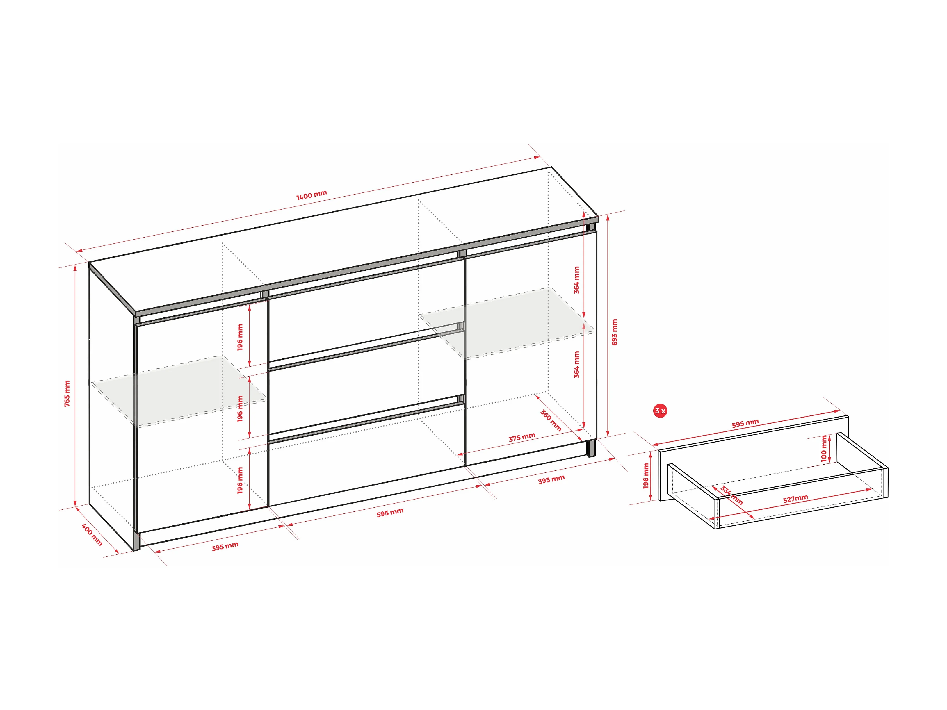 Commode : Chêne Sonoma / Blanc Mat, 140 x 39 x 79 cm, 3 tiroirs, 2 portes