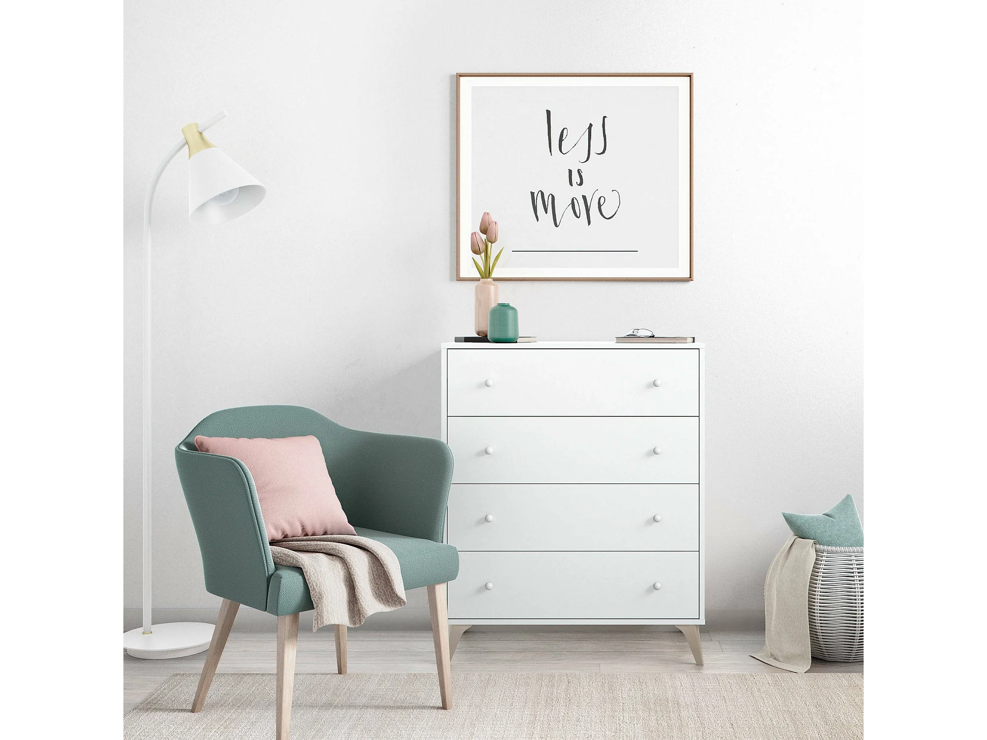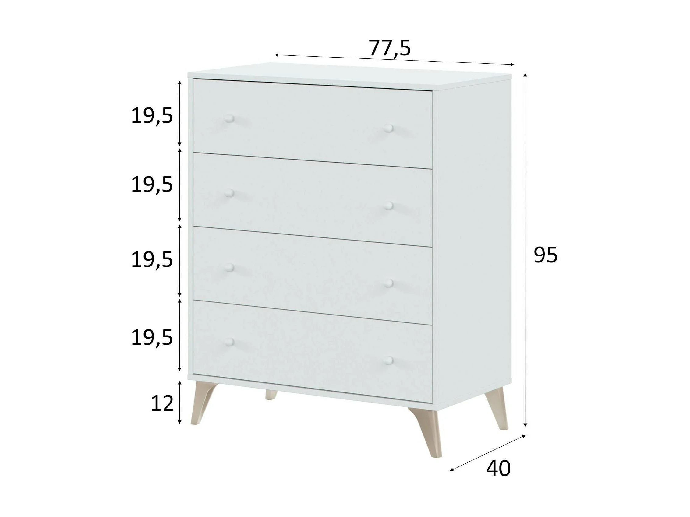 Commode Denver, commode 4 tiroirs, Commode pour la chambre, Commode moderne, 78x40h95 cm, Blanc