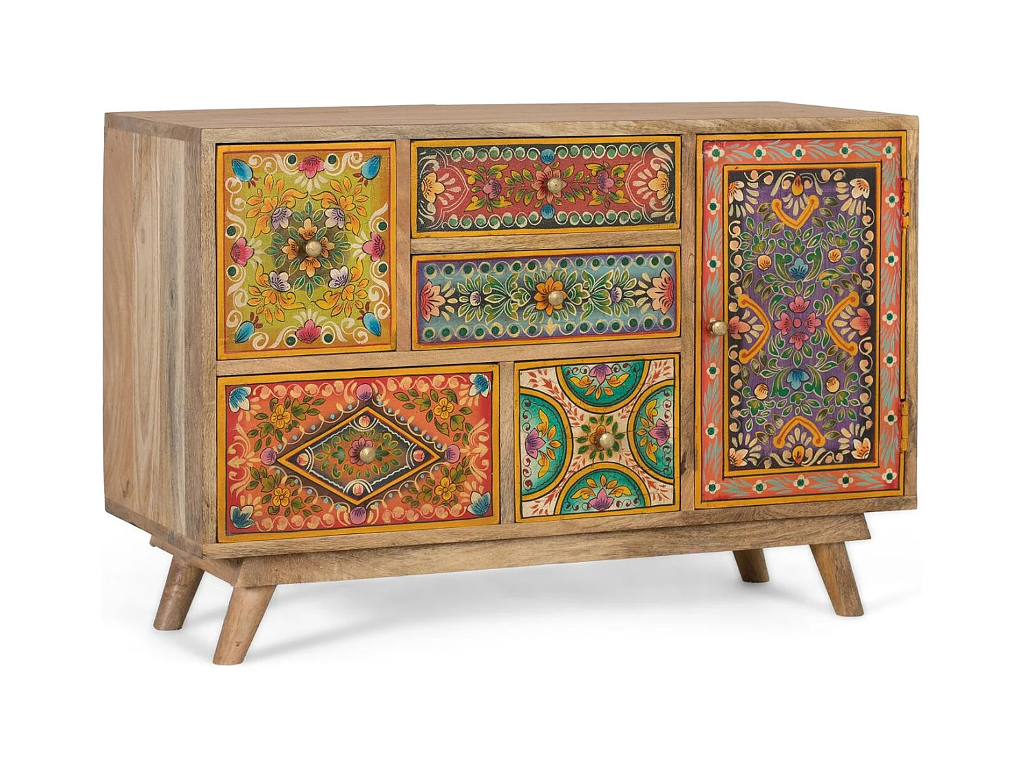Commode en bois de manguier avec détails multicolores peints à la main