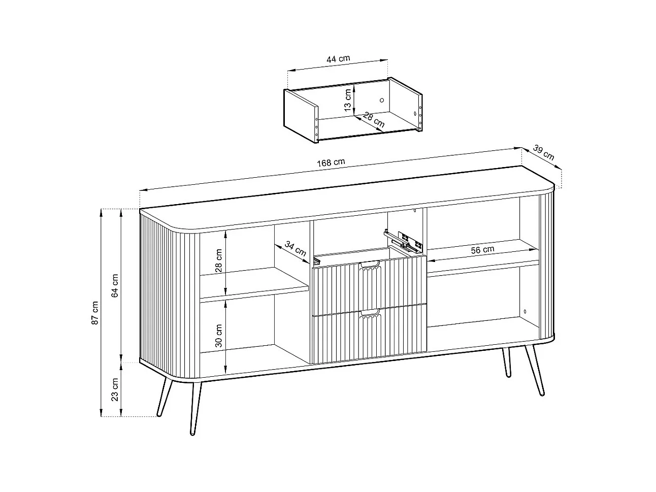 Commode ORO K-160 Moderne 160 cm Large Beige, 2 Portes, 2 Tiroirs, Push-to-Open, Pieds Métal Noir 23 cm, Panneau Stratifié 16 mm