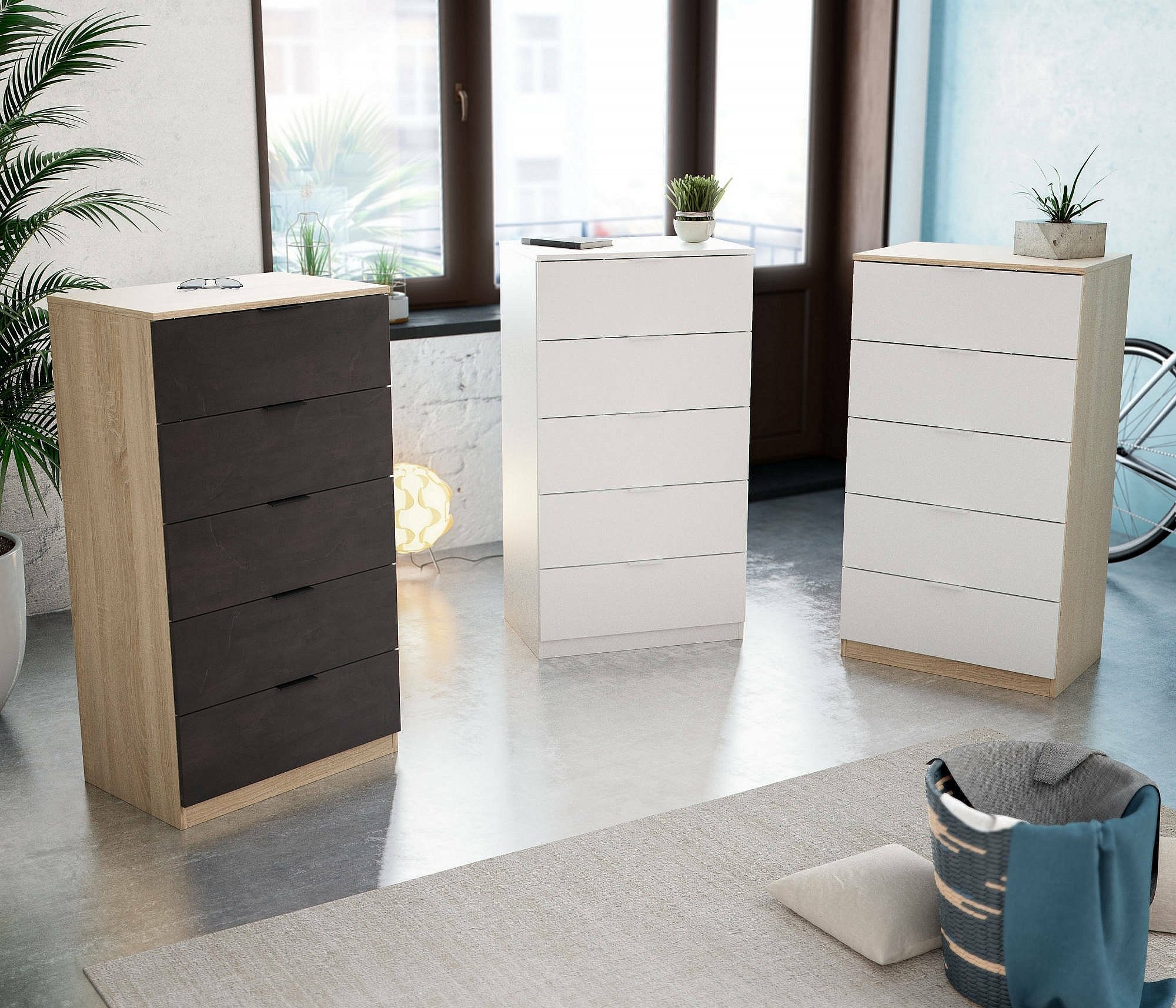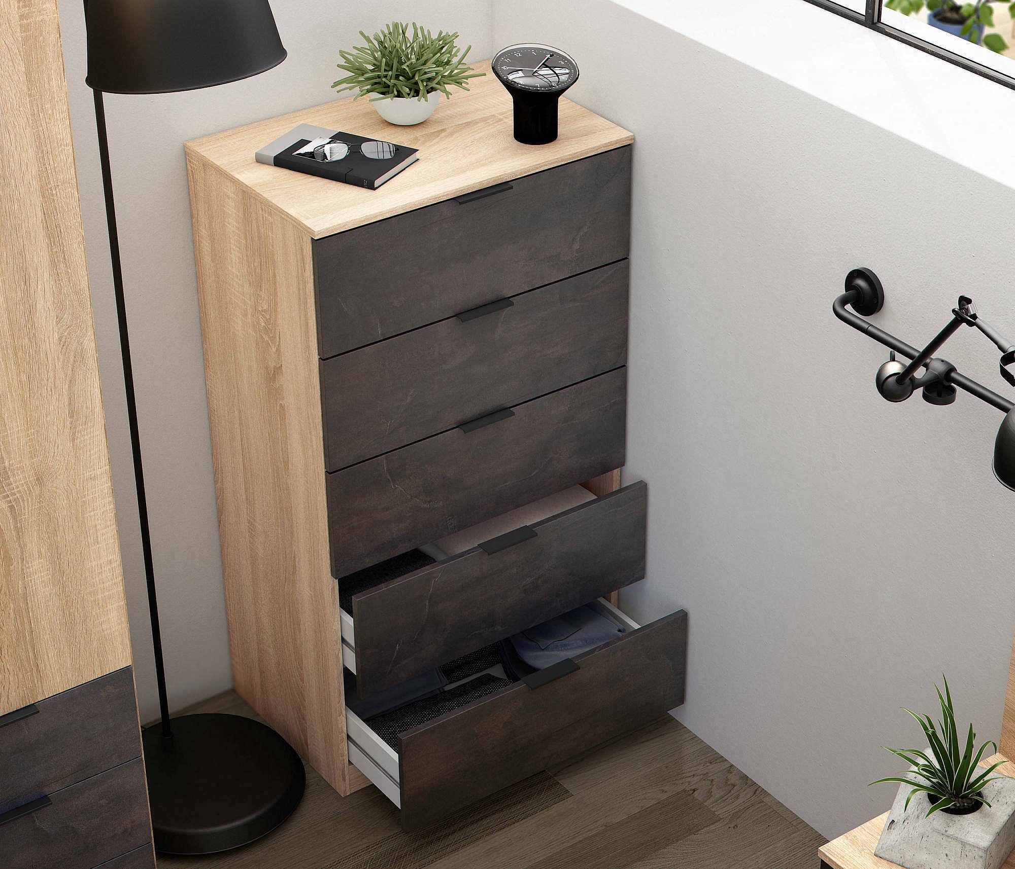 Commode Mesquite, commode à 5 tiroirs, commode pour la chambre, commode moderne, 60x40h110 cm, chêne et anthracite