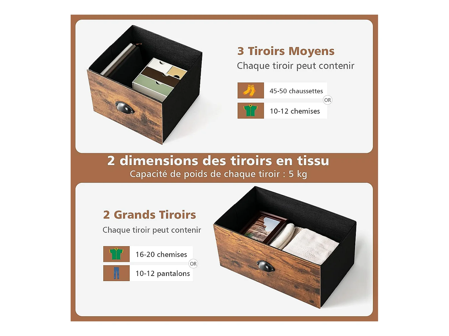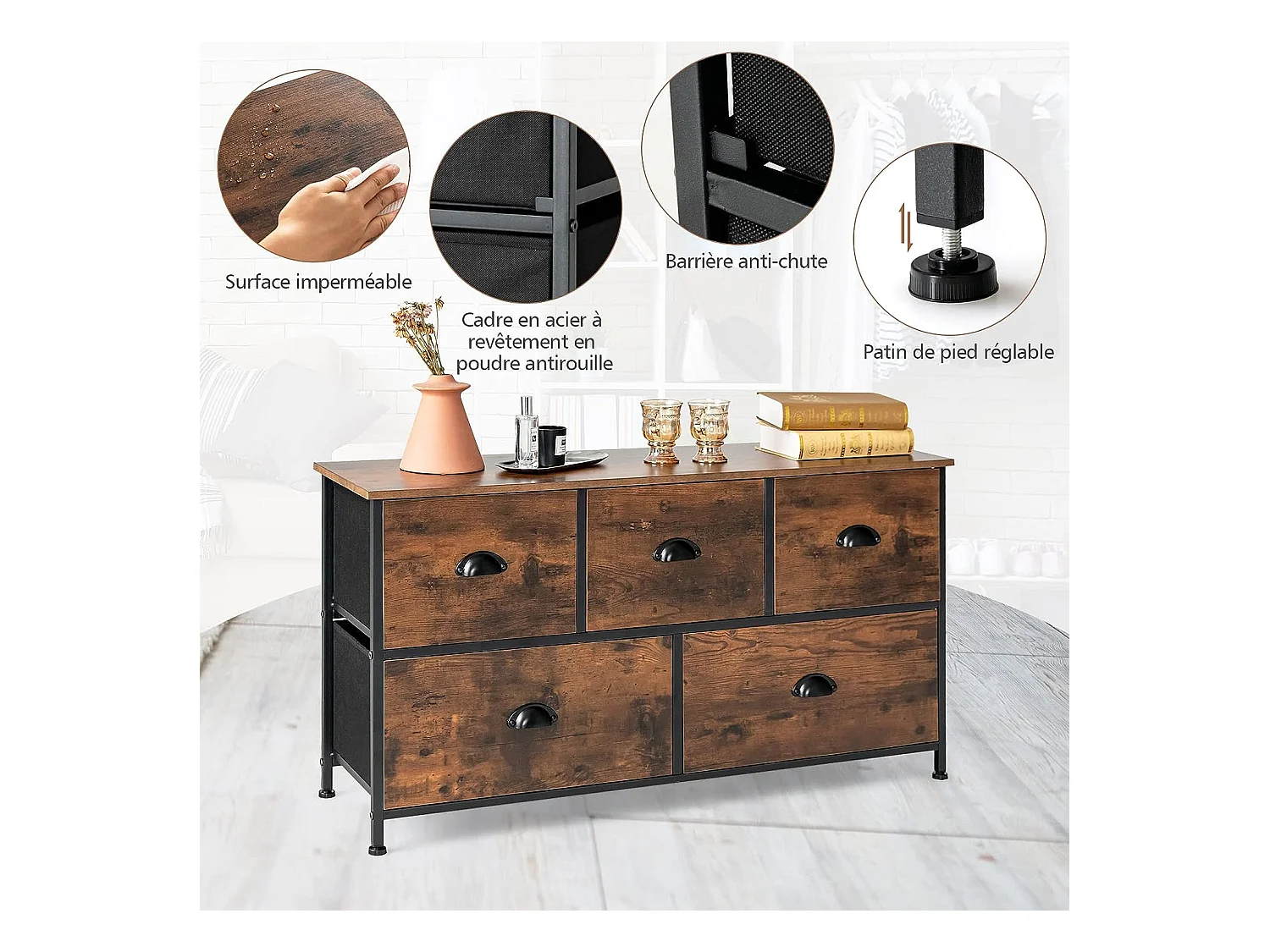 Commode Meuble de Rangement avec 5 Tiroirs Non-Tissés 100 x 30 x 54 cm Cadre en Métal Surface en MDF Marron Rustique&Noir