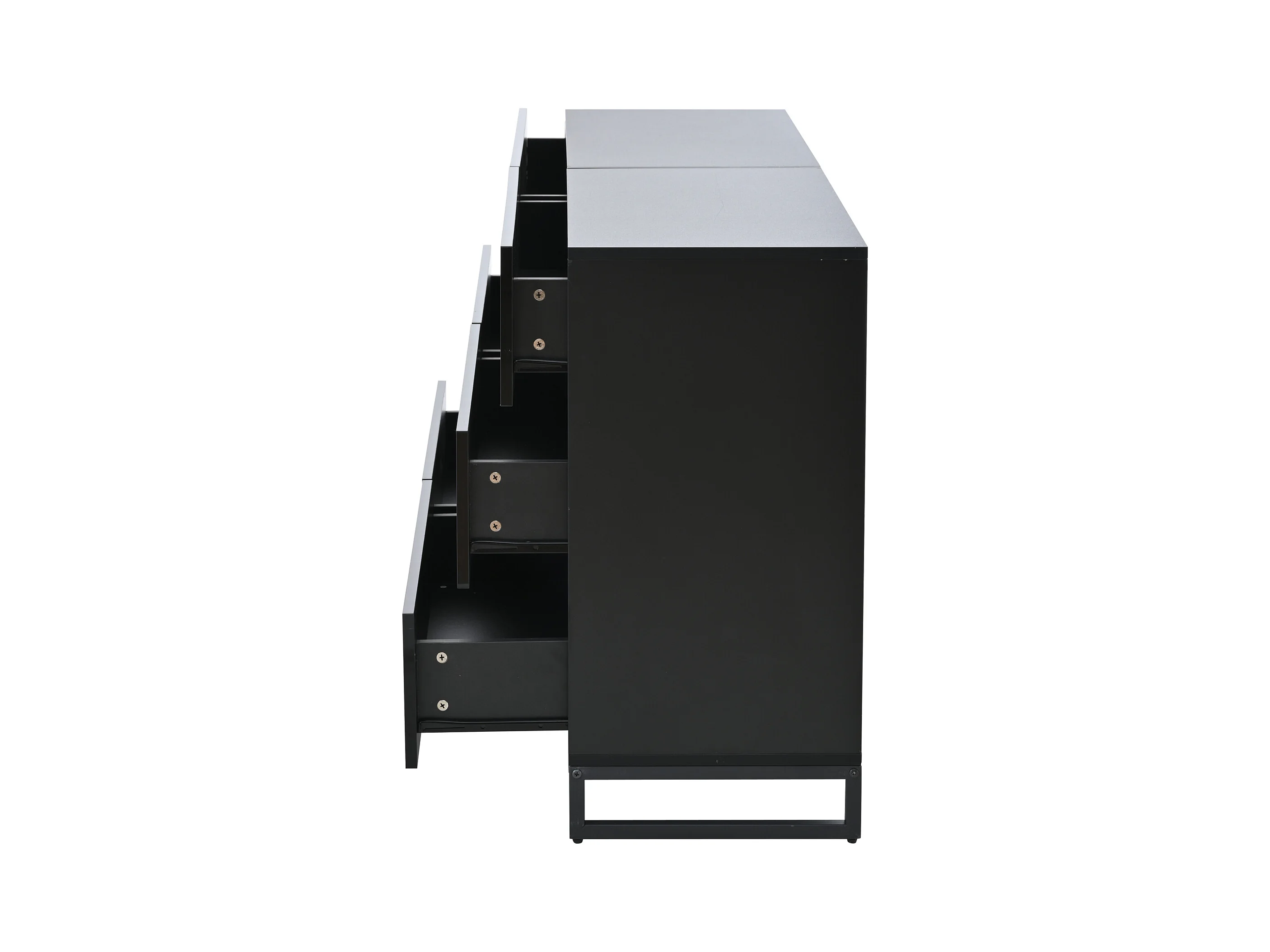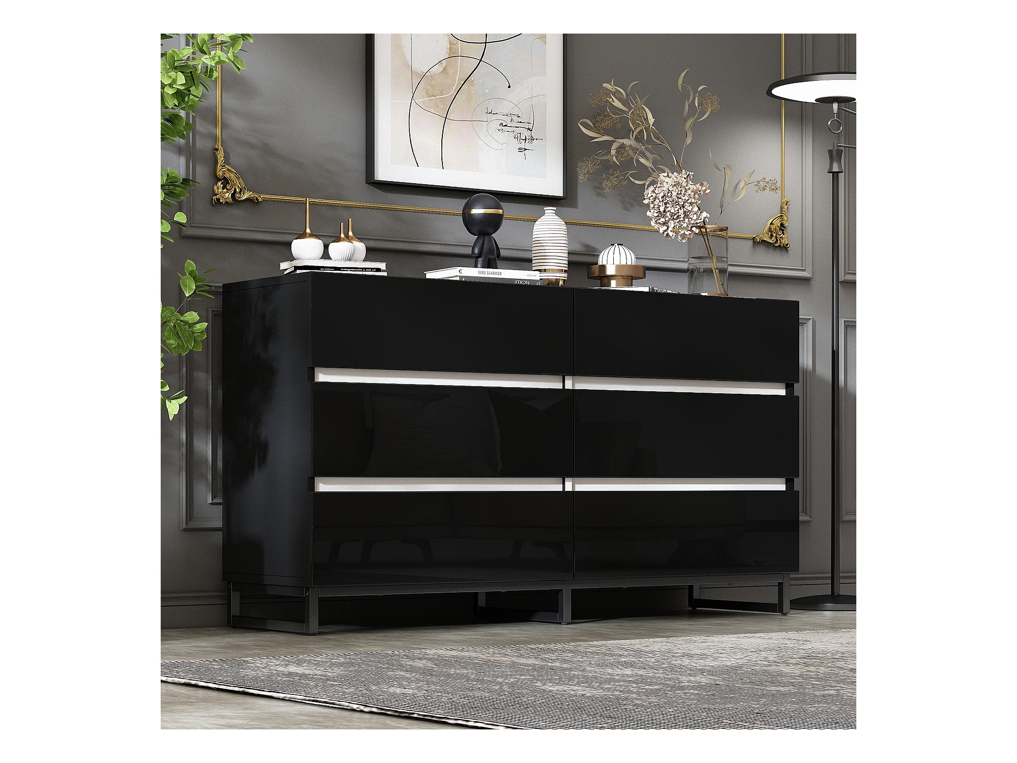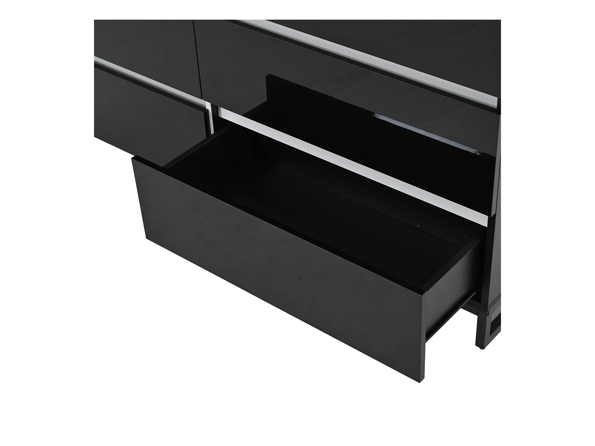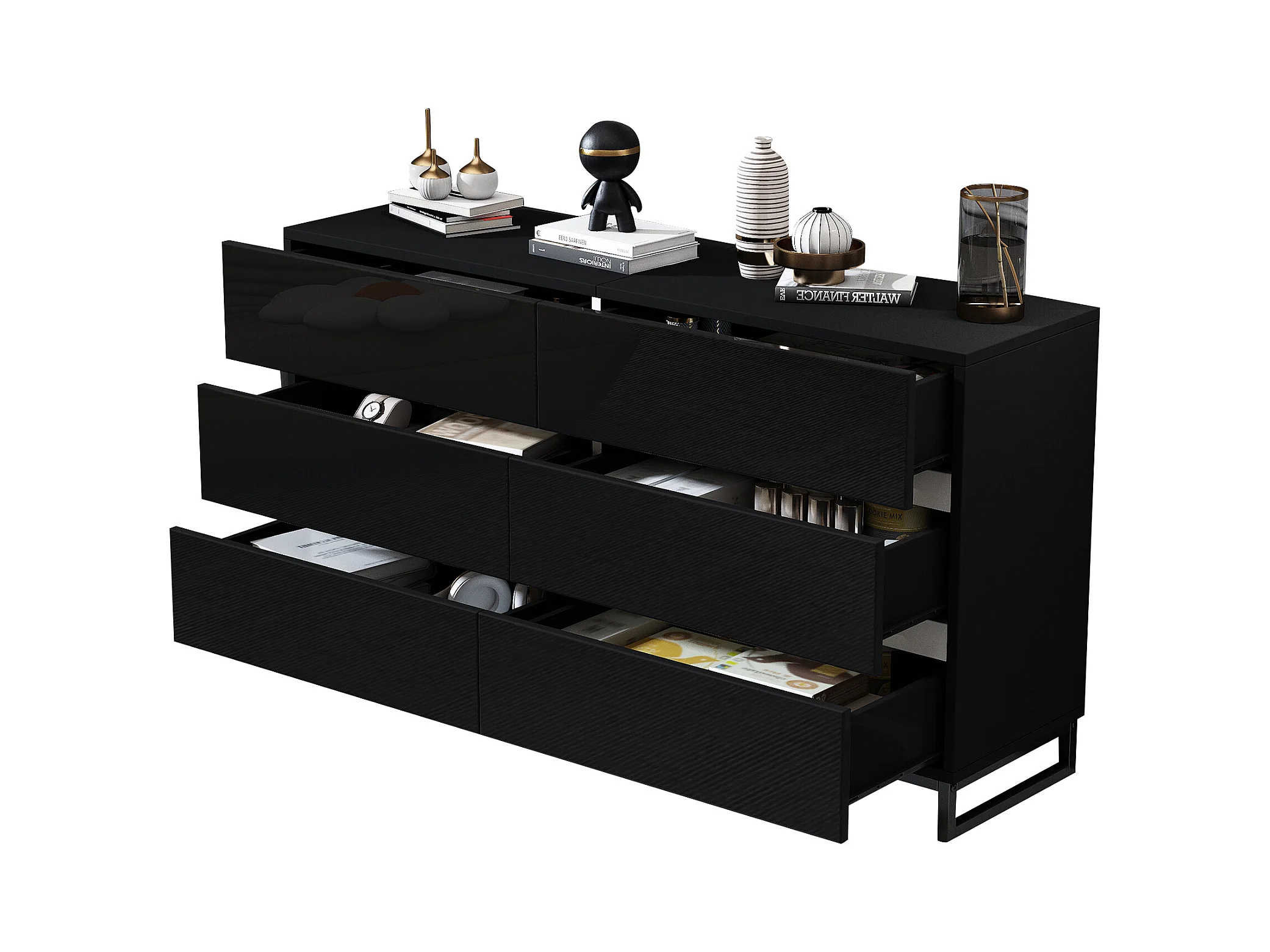 Commode Noir brillante avec 6 tiroirs Poignées en métal Commode moderne Chambre Salon Bureau 140x40x80cm Noir