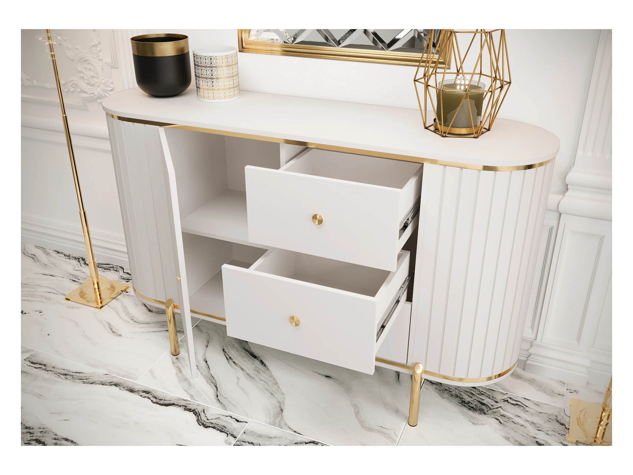 Commode 4 tiroirs blanche avec façade à motif ondulé, poignées dorées et pieds en métal, style moderne, grand espace de rangement