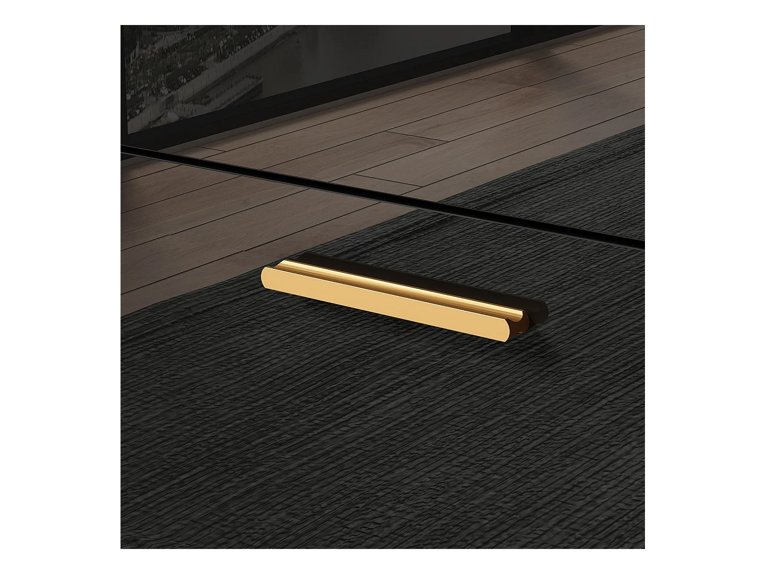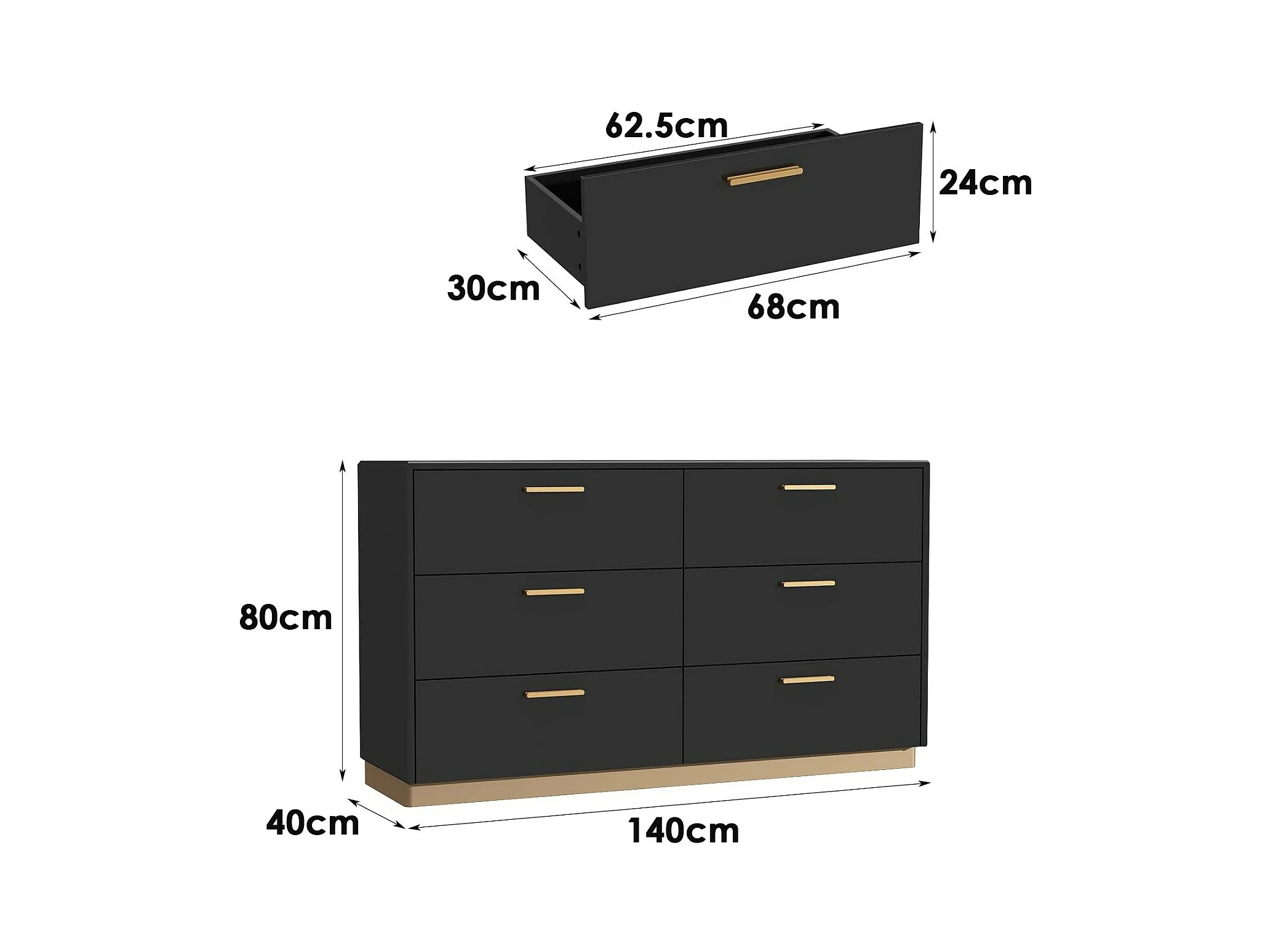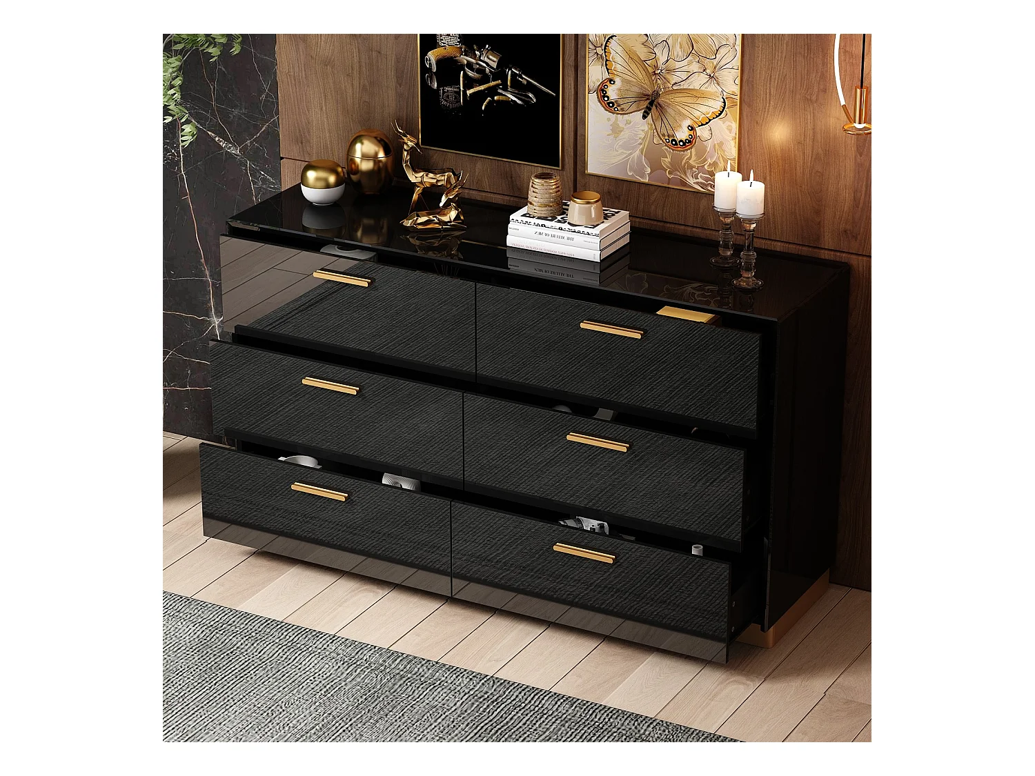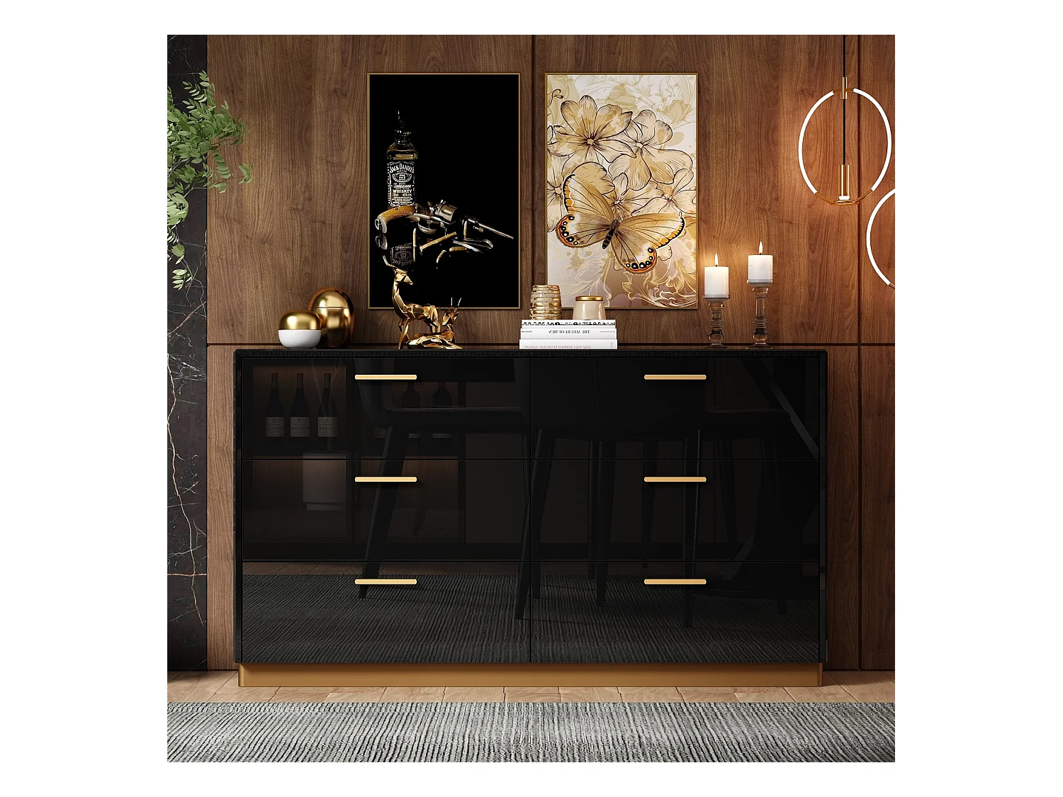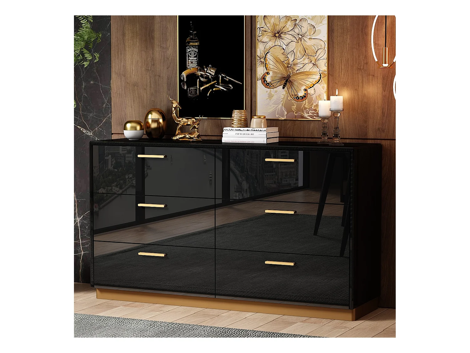 Commode Noir brillante avec 6 tiroirs Poignées en métal Commode moderne Chambre Salon Bureau 140x40x80cm Noir