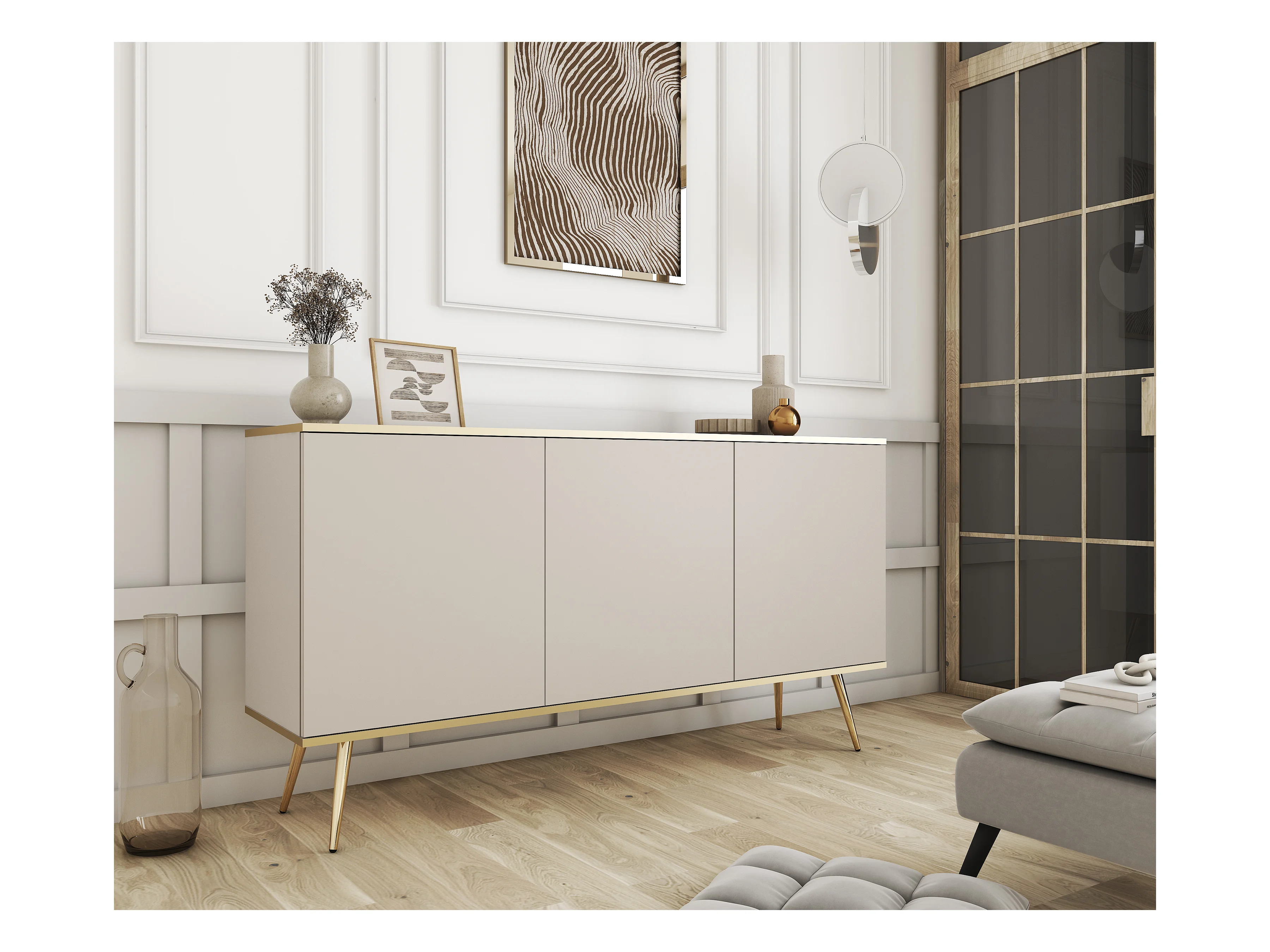 Commode ORO K-160 Moderne 160 cm Large Beige, 2 Portes, 2 Tiroirs, Push-to-Open, Pieds Métal Or 23 cm, Panneau Stratifié 16 mm