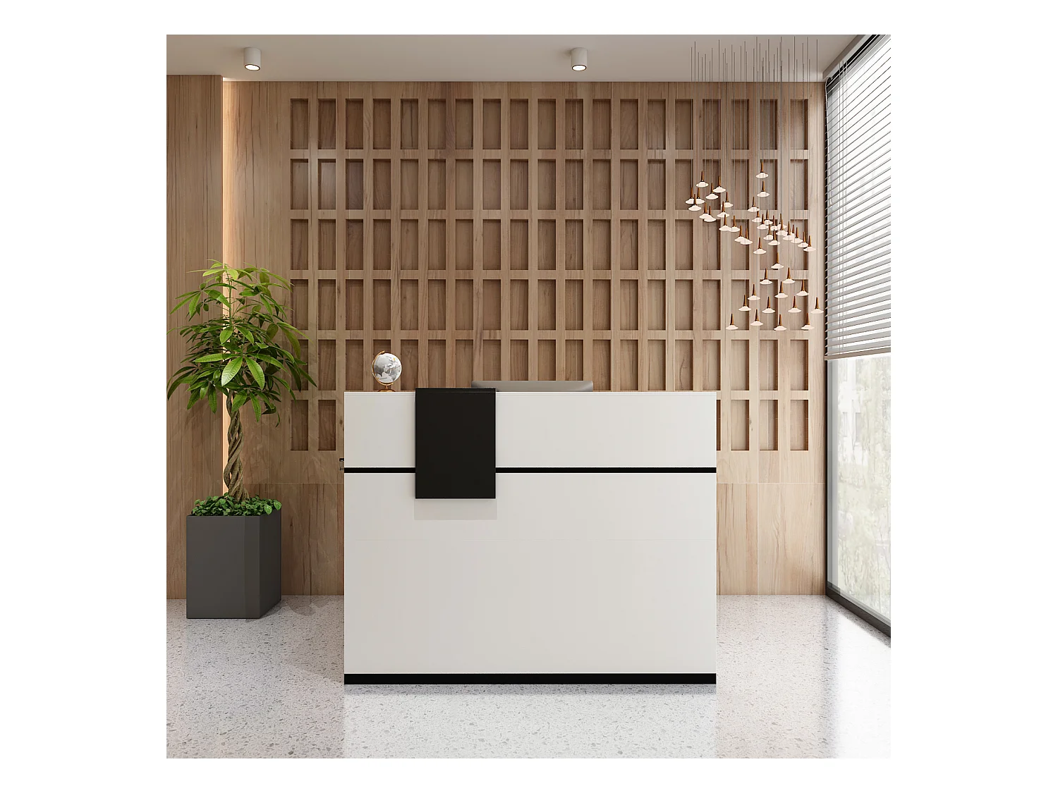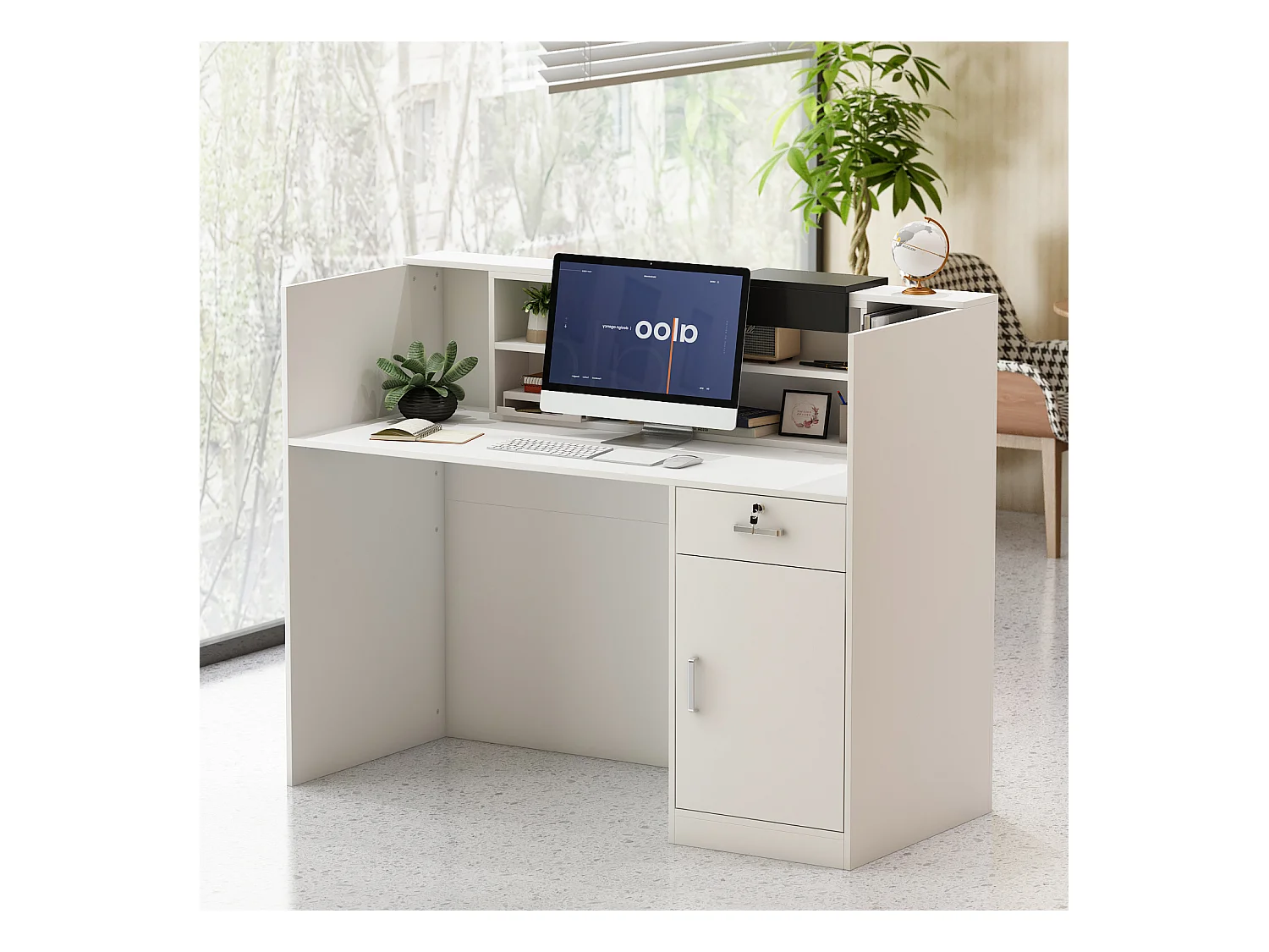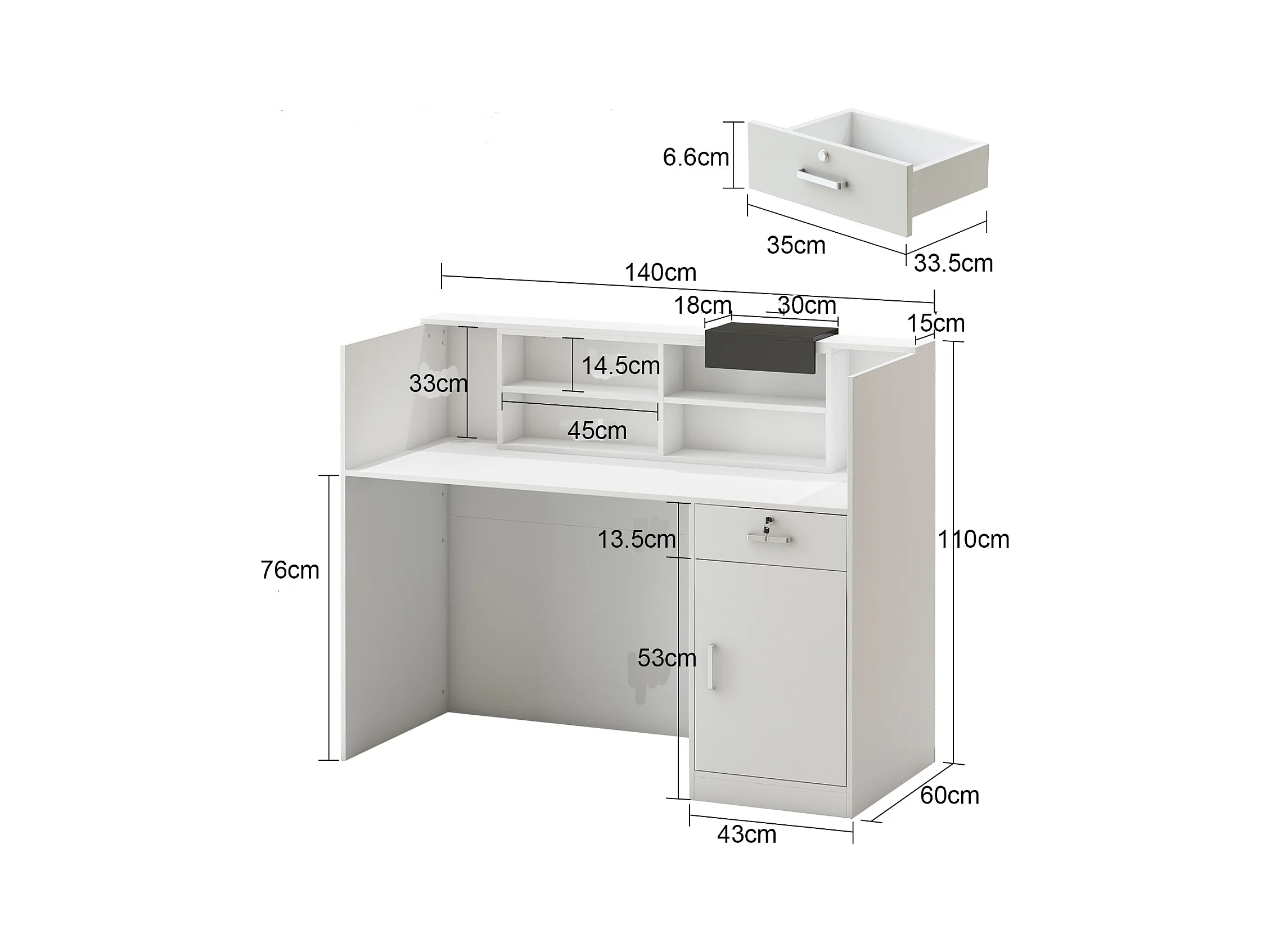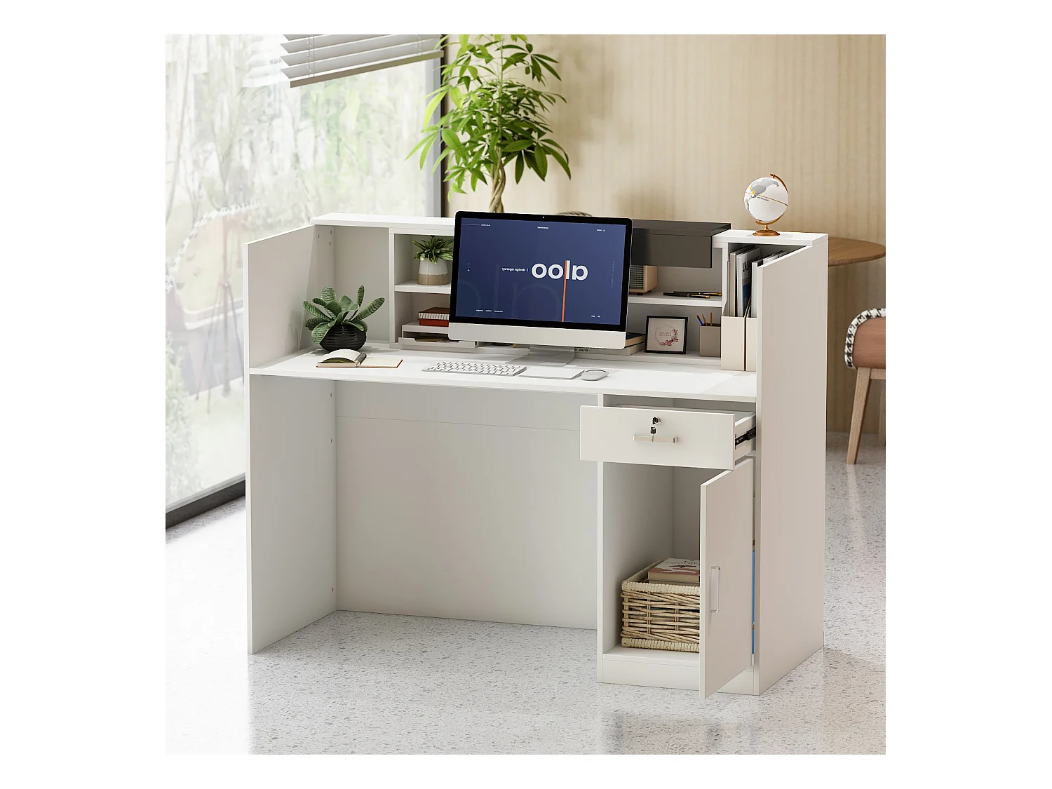 Comptoirs d'accueil réception avec compartiments ouverts étagères Tiroir verrouillable Salon Bureau 140x60x110cm Blanc