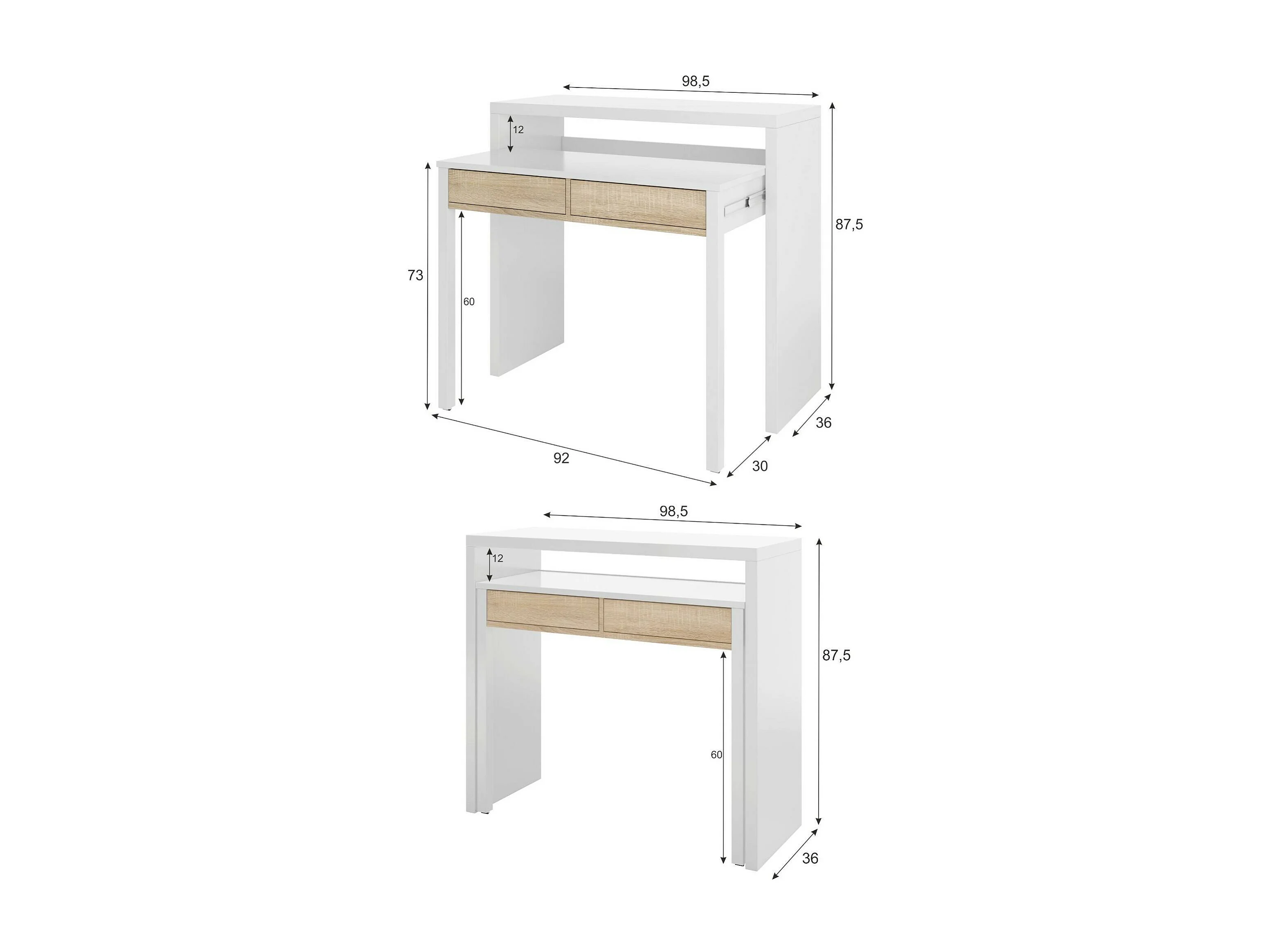 Bureau Billings, Bureau avec plateau extensible, Bureau PC avec 2 tiroirs, 99x36h88 cm, Blanc et Chêne