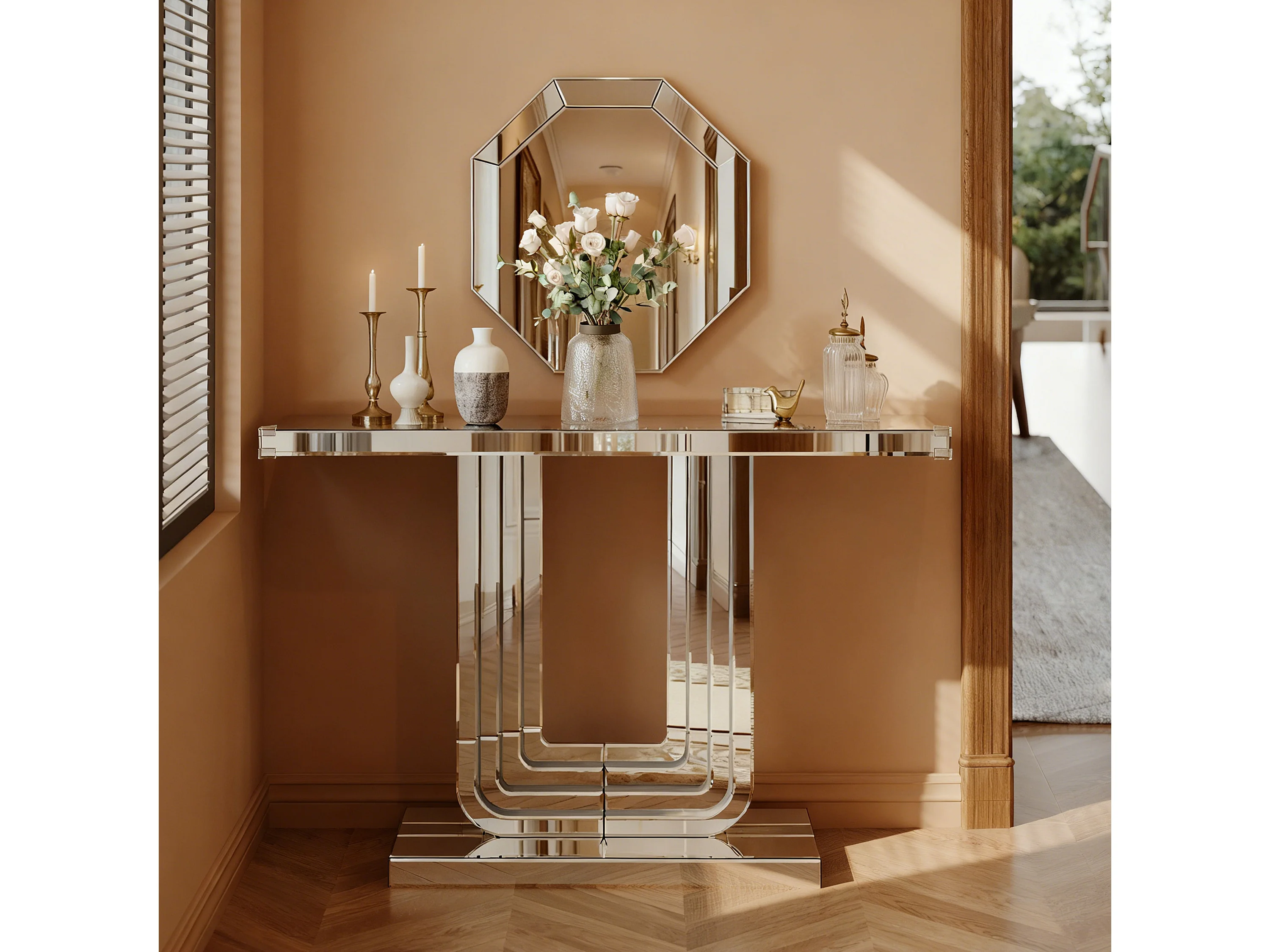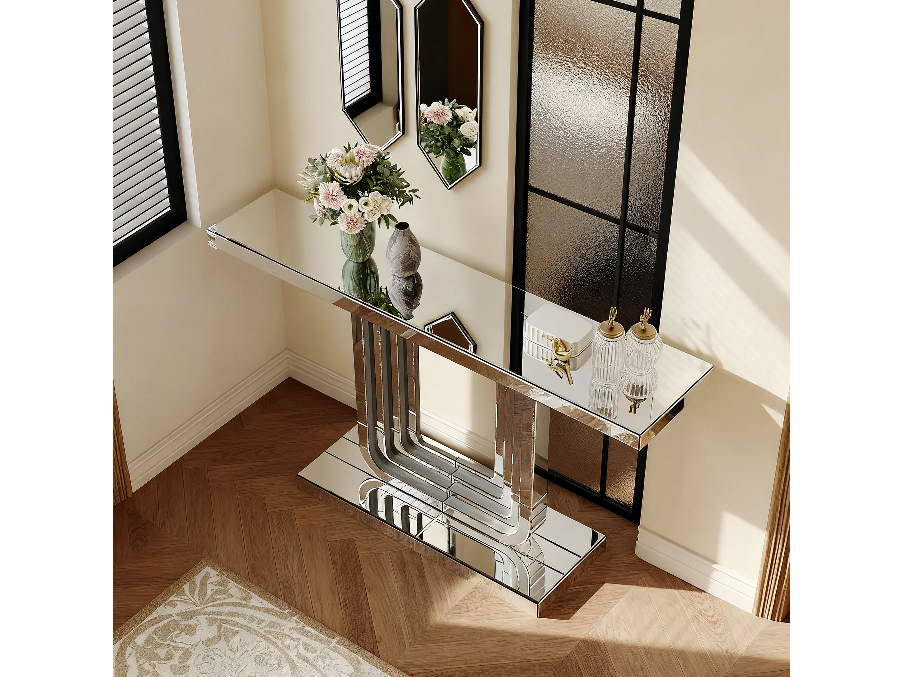 Console d'entrée 120 cm en verre argenté et MDF - Socle de forme en U