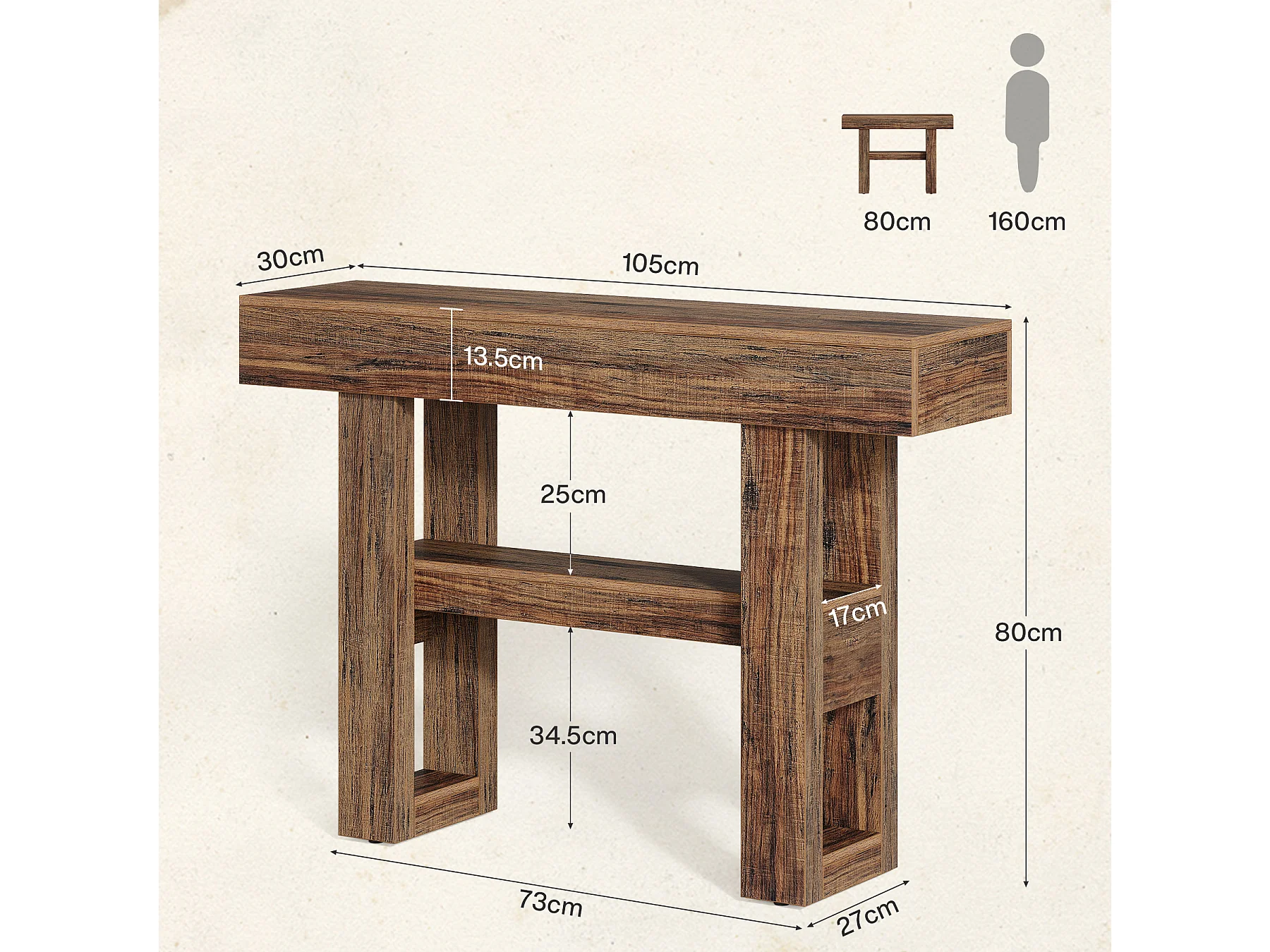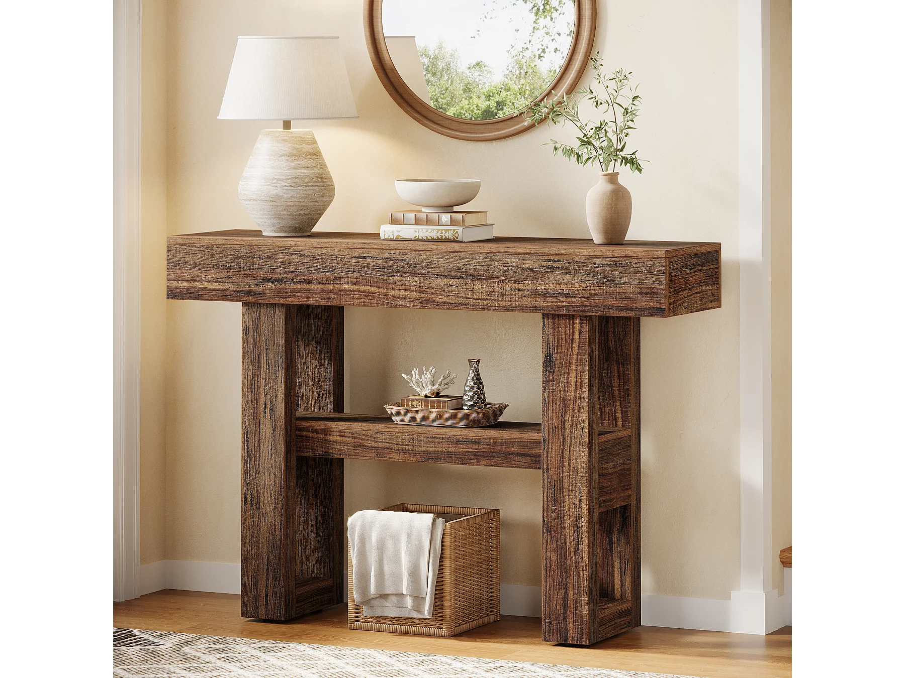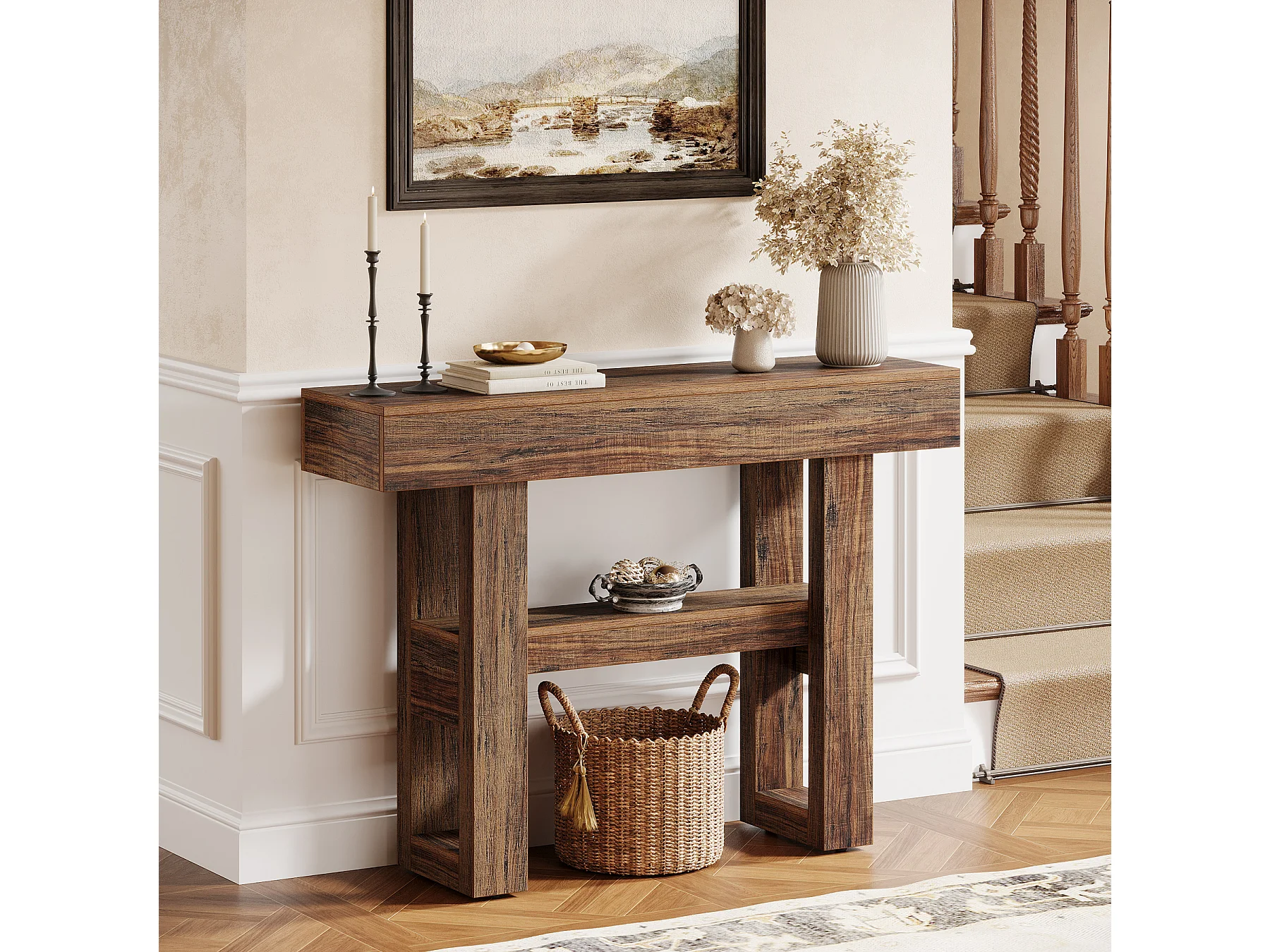 Petite table console de 105 cm pour entrée, table de canapé rustique à 3 niveaux