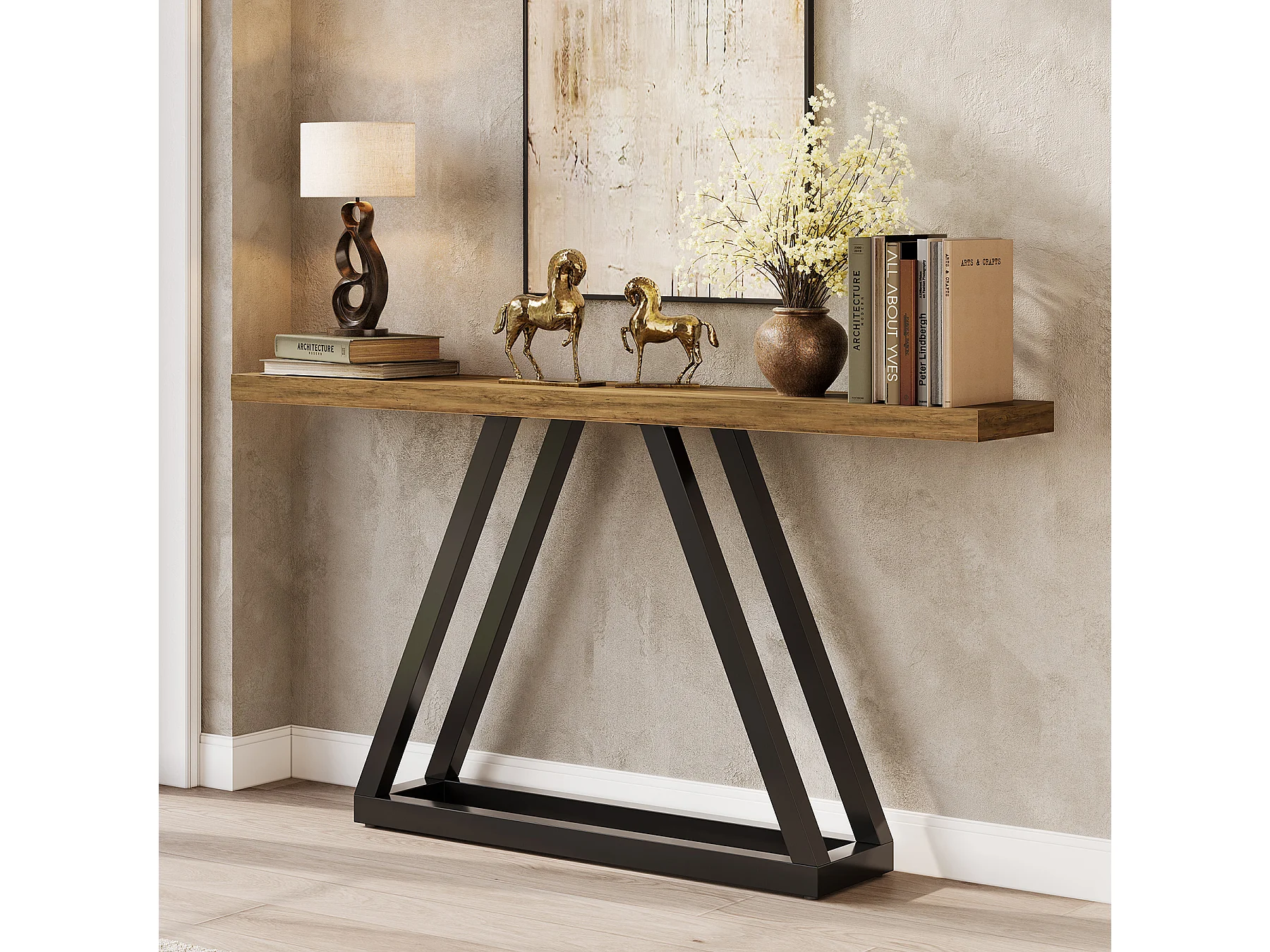 Console extra longue de 160 cm, table basse en bois de style campagnard à placer derrière le canapé