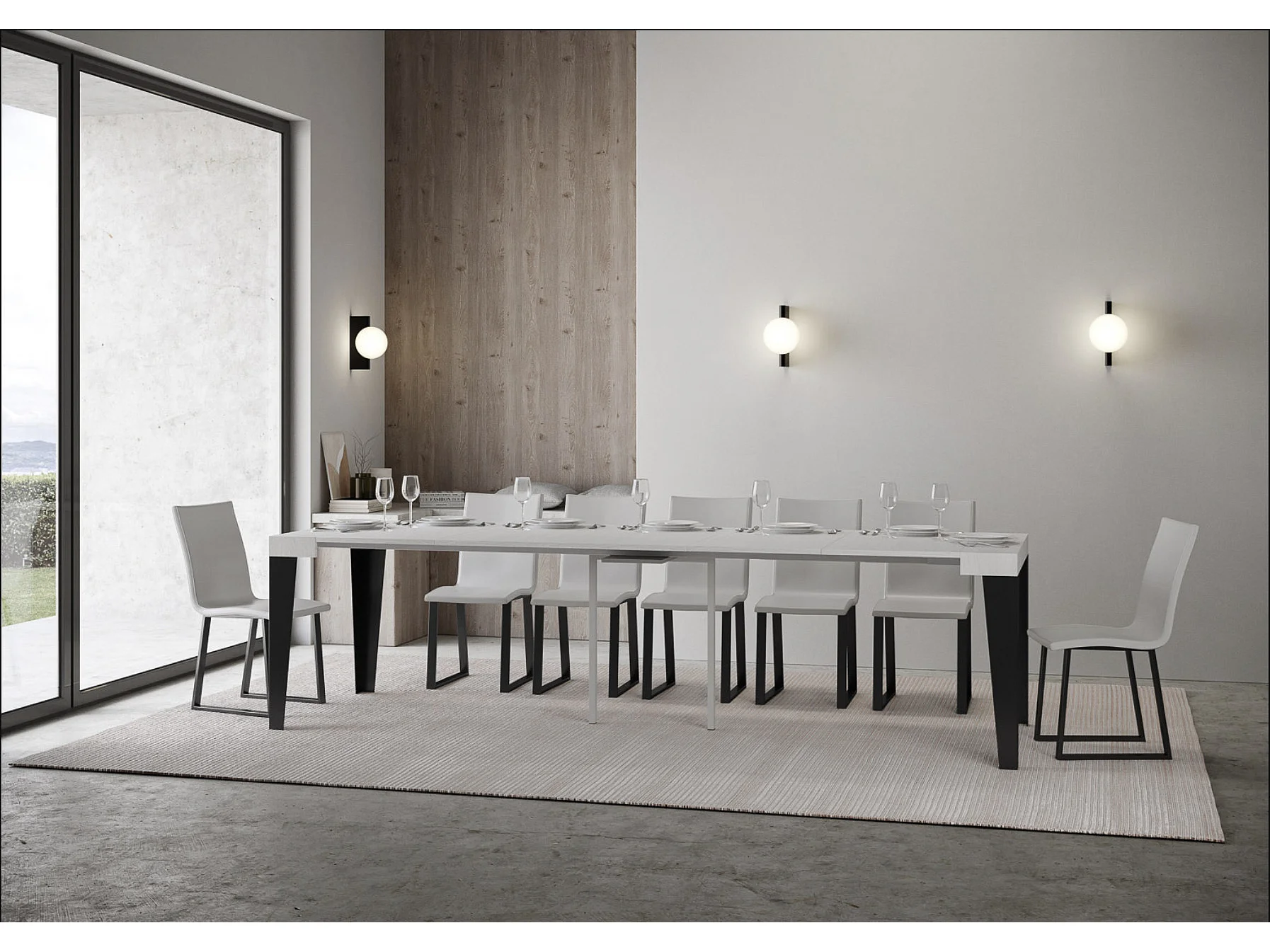 Console extensible design bois et acier mat Flavio-Couleur Blanc-4 pieds-5 rallonges fines