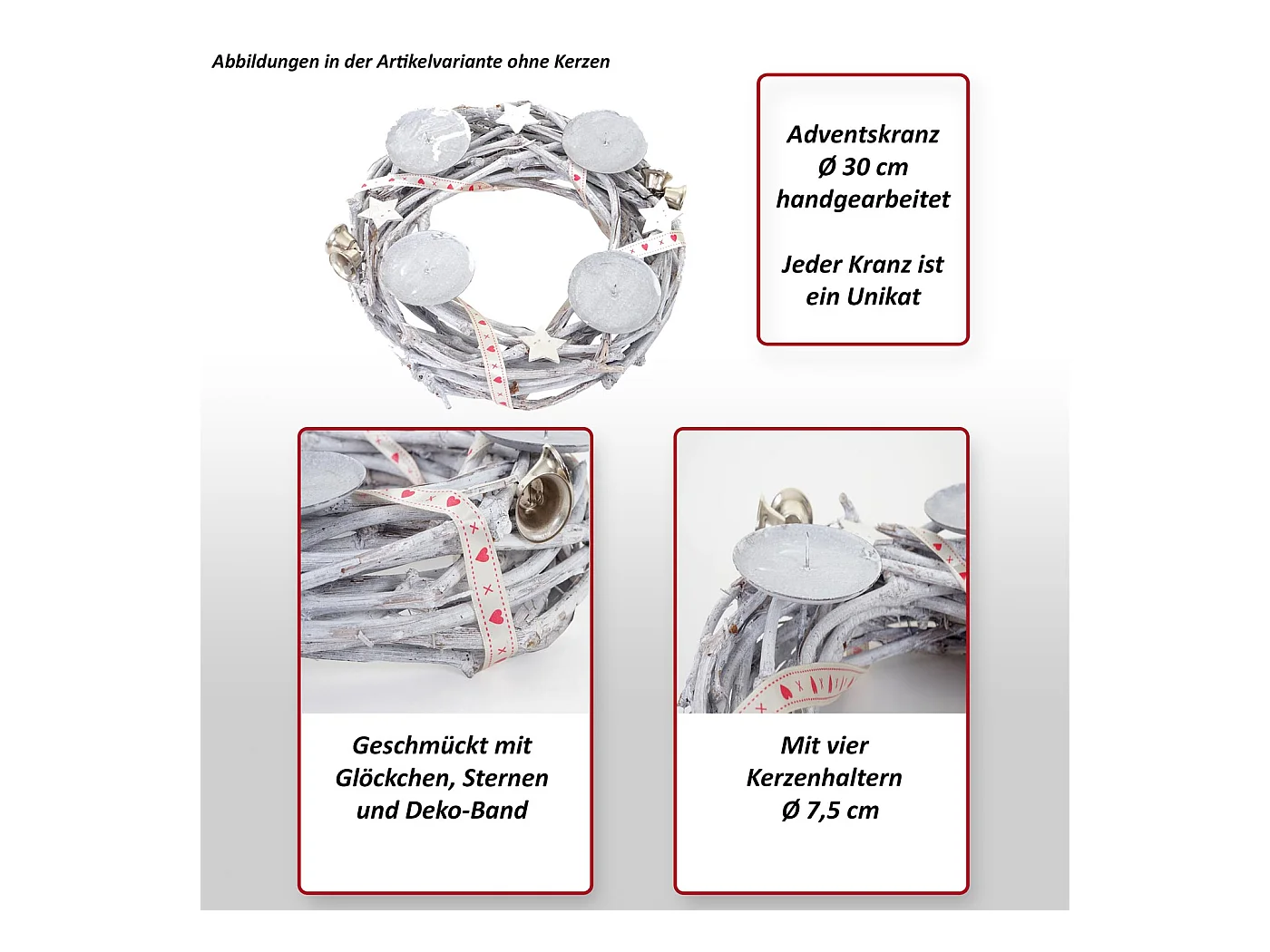 Couronne de l'avent en bois Ø 30cm avec bougies rouge, bougies blanches