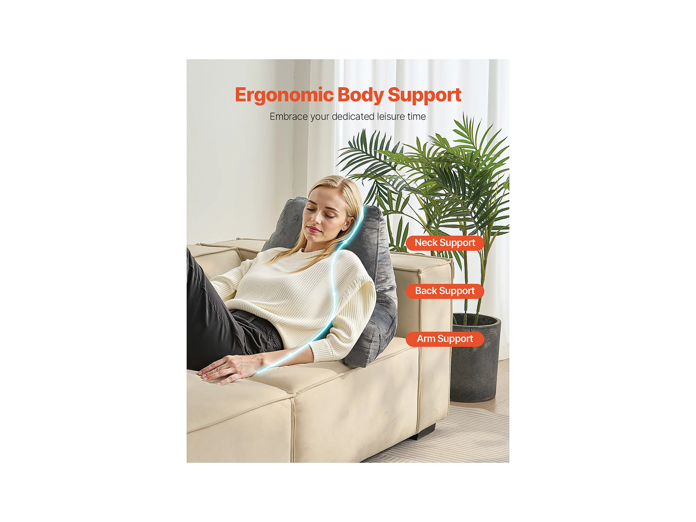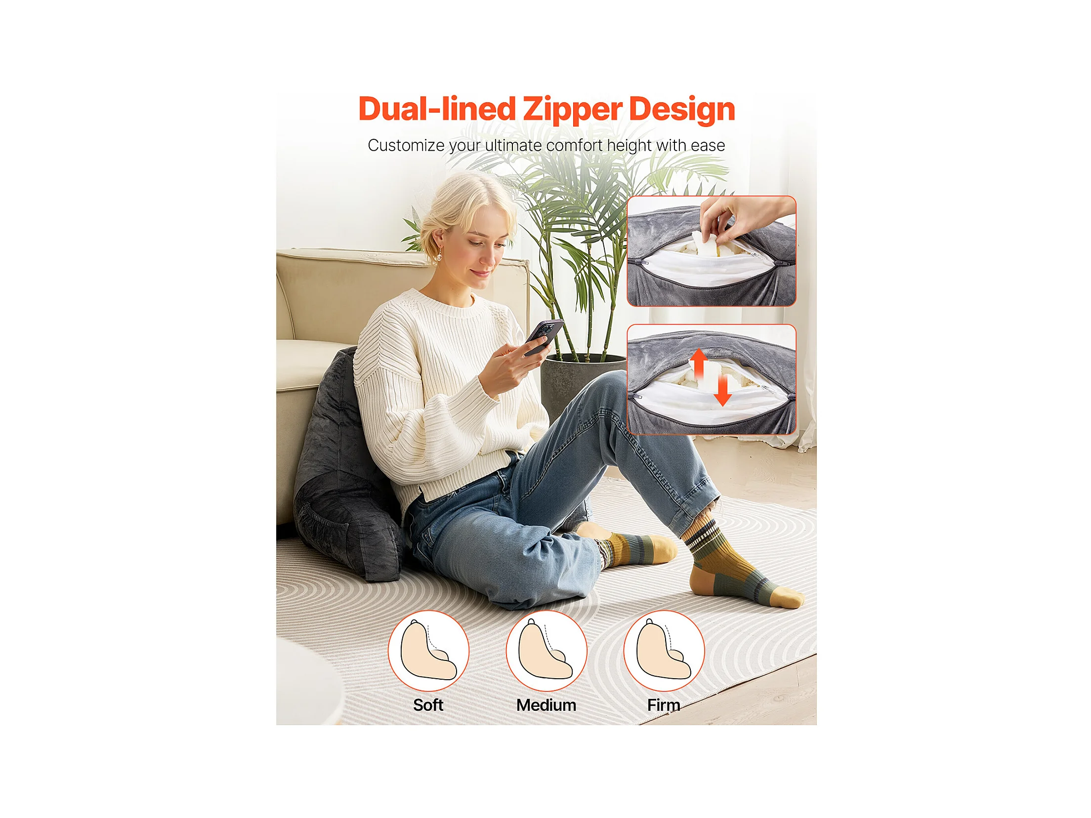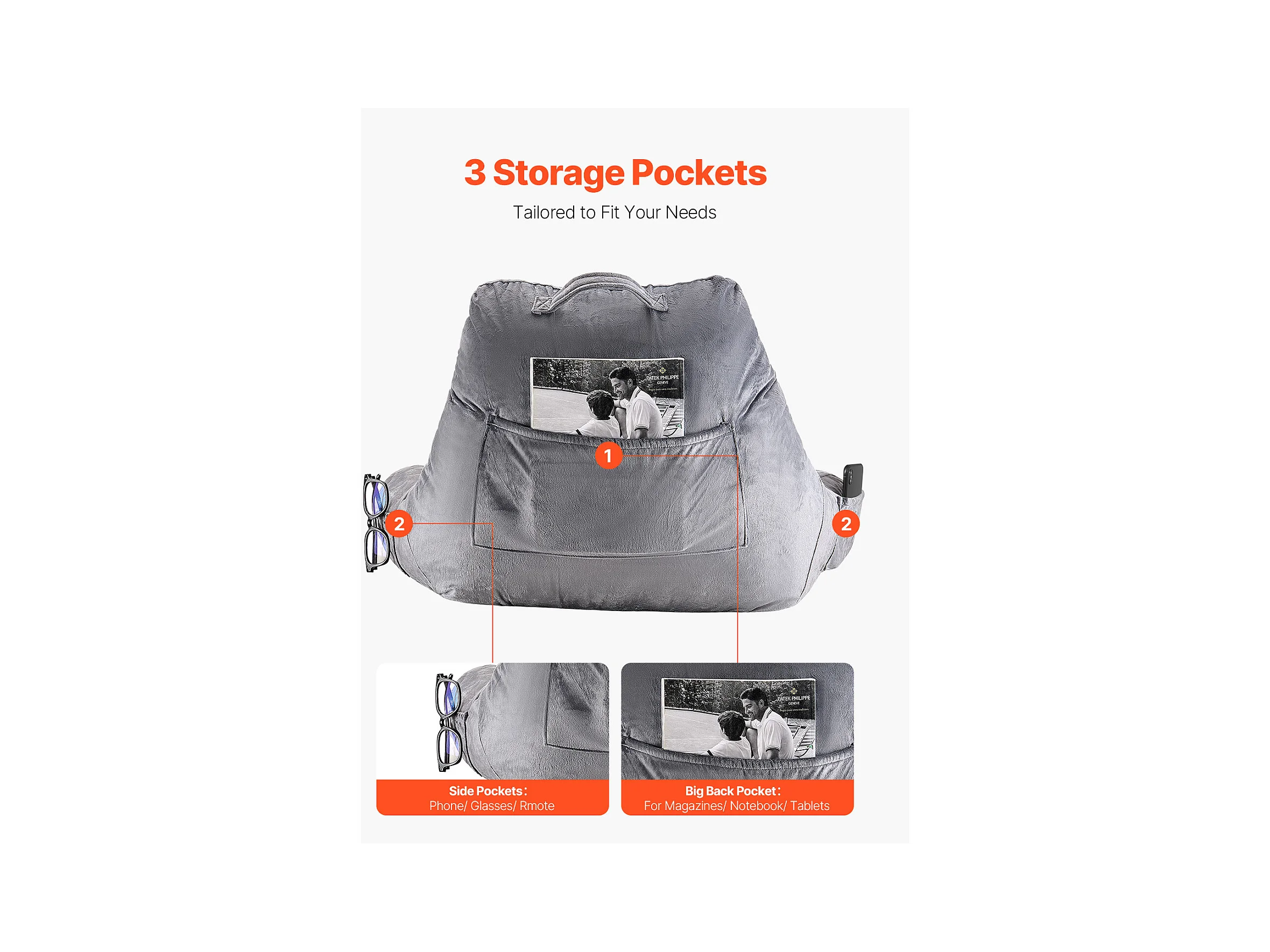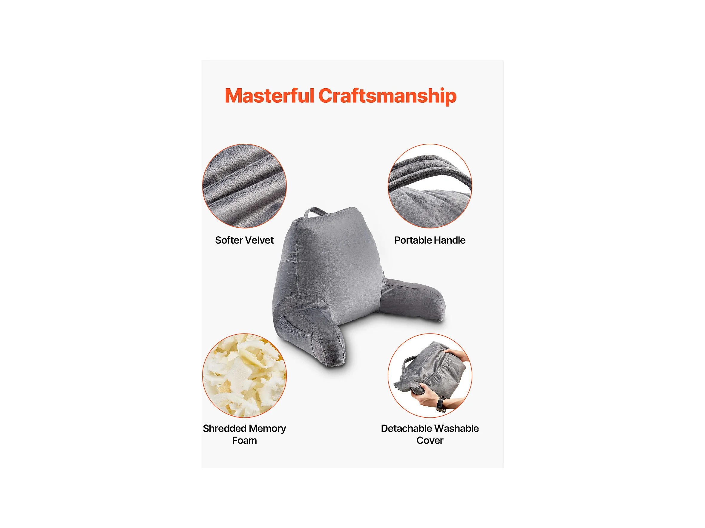 Grand Coussin de Lecture SucceBuy avec Appui-Tête Amovible, Coussin de Dossier avec 3 Poches, Housse en Velours Doux, Mousse à Mémoire de Forme Déchiquetée