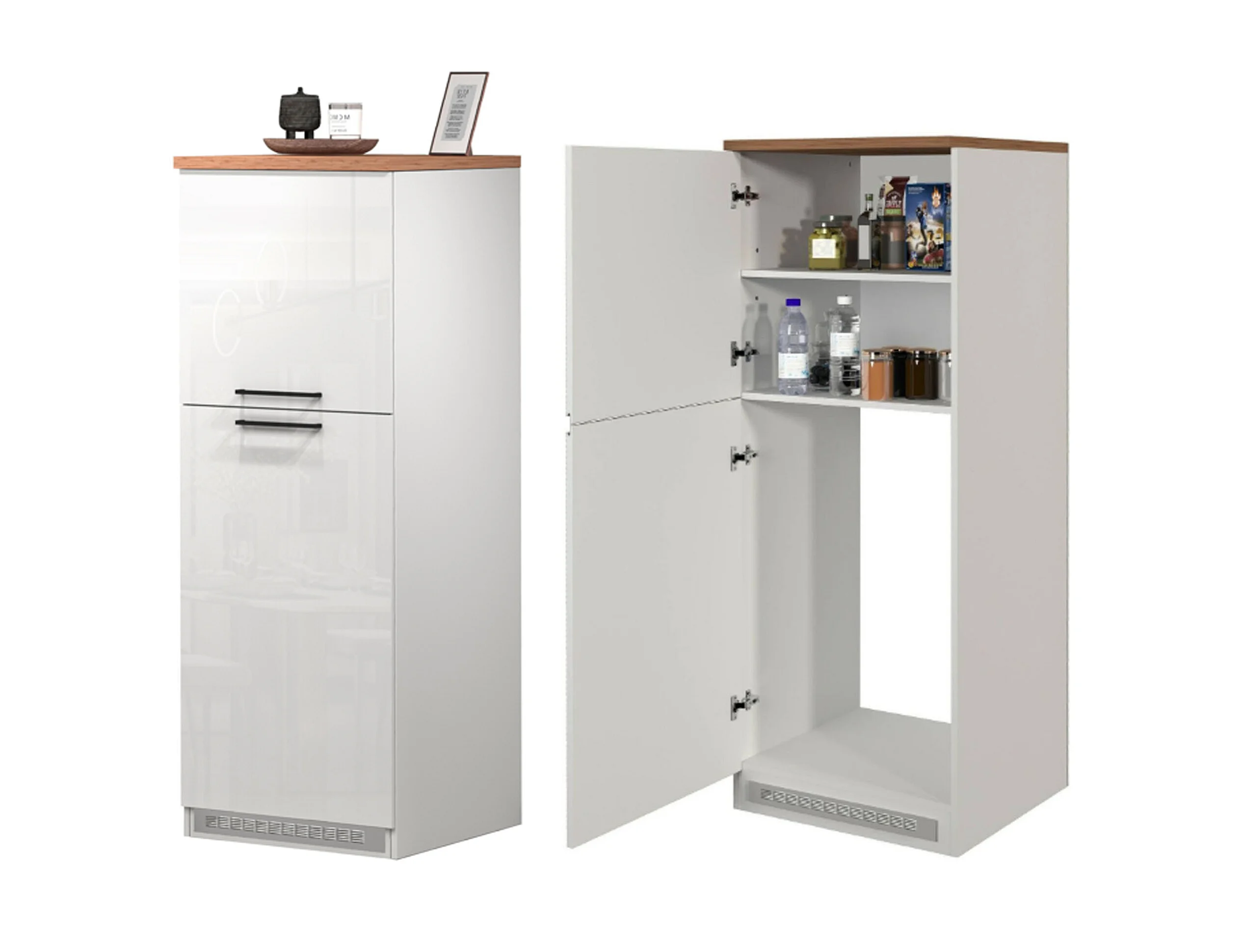 Cuisine complète Daquilant, Ensemble avec garde-manger, Meuble de kitchenette, Kit bloc avec îlot et porte-frigo, 100% Made in Italy, Blanc brillant et chêne