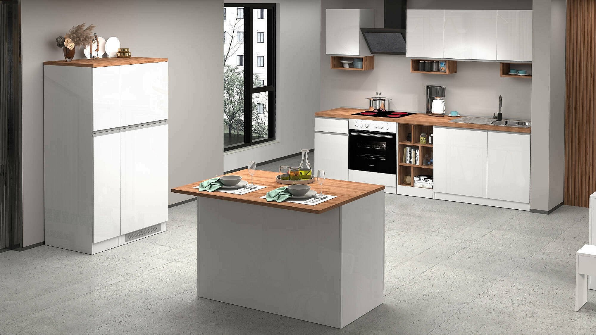 Cuisine complète Daquilant, Ensemble avec garde-manger, Meuble de kitchenette, Kit bloc avec îlot et porte-frigo, 100% Made in Italy, Blanc brillant et chêne