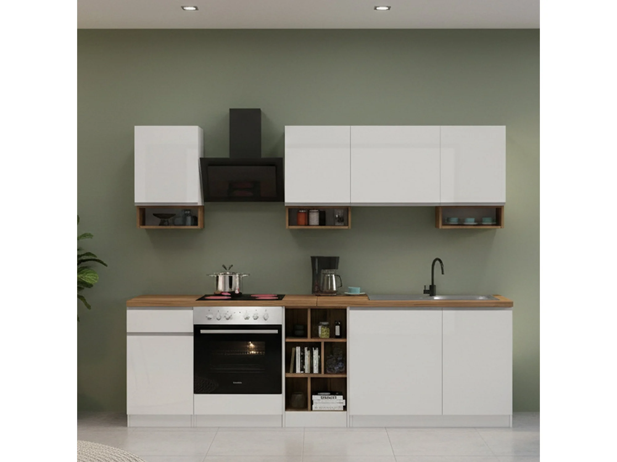 Cuisine complète Dcelient, Ensemble avec garde-manger, Meuble de kitchenette, Kit bloc linéaire, 100% Made in Italy, 255x60h85 cm, Blanc brillant et chêne