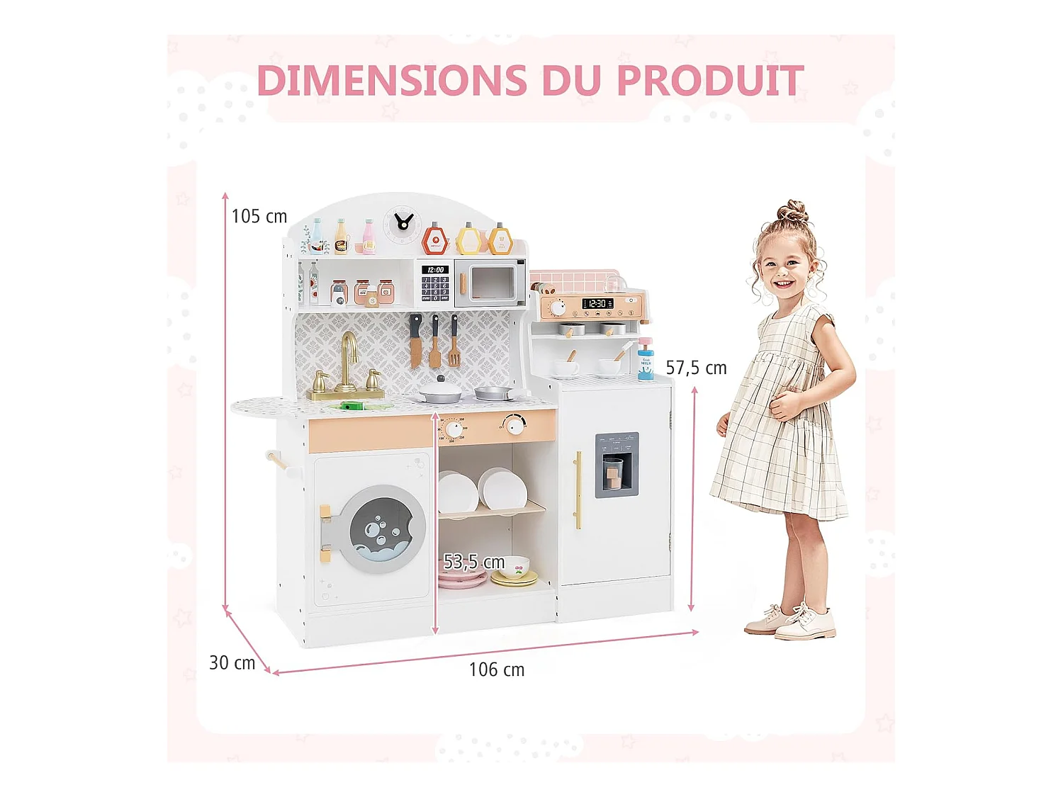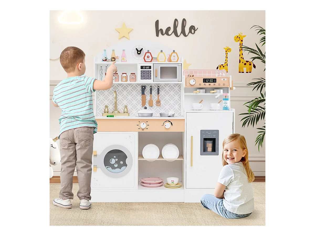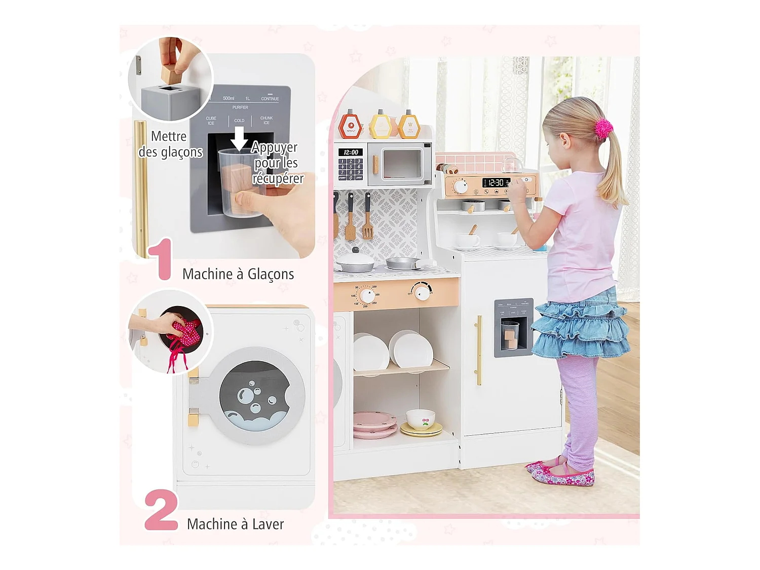 Cuisine Enfant en Bois avec Effets Sonores et Lumières, avec Machine à Laver et Micro-Ondes, Machine à Glaçons, Jouet de Simulation pour Enfant de 3 Ans+