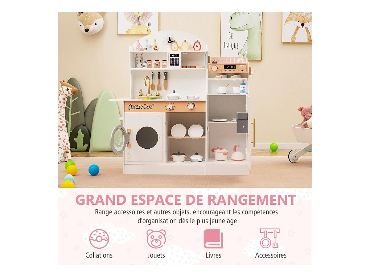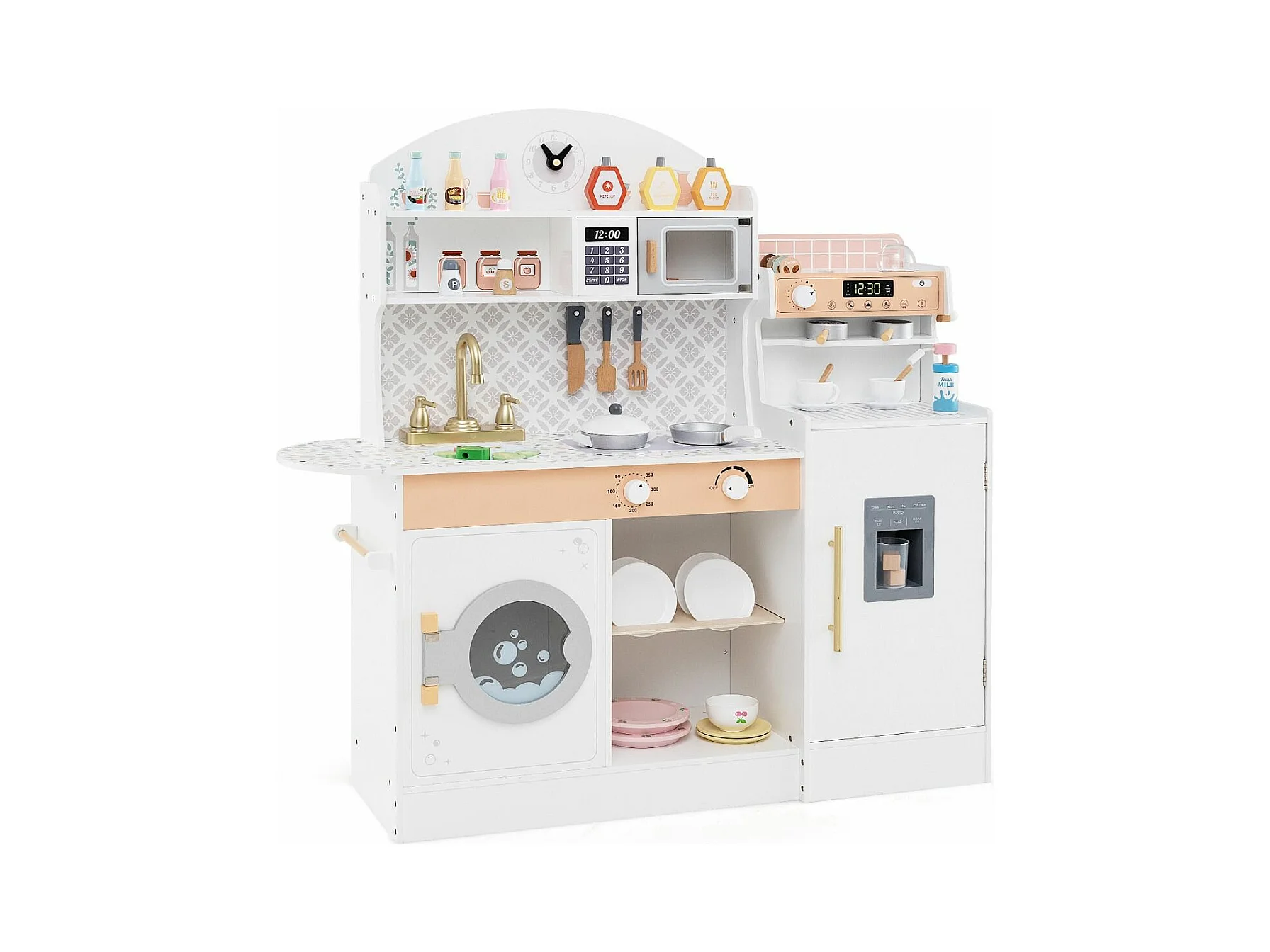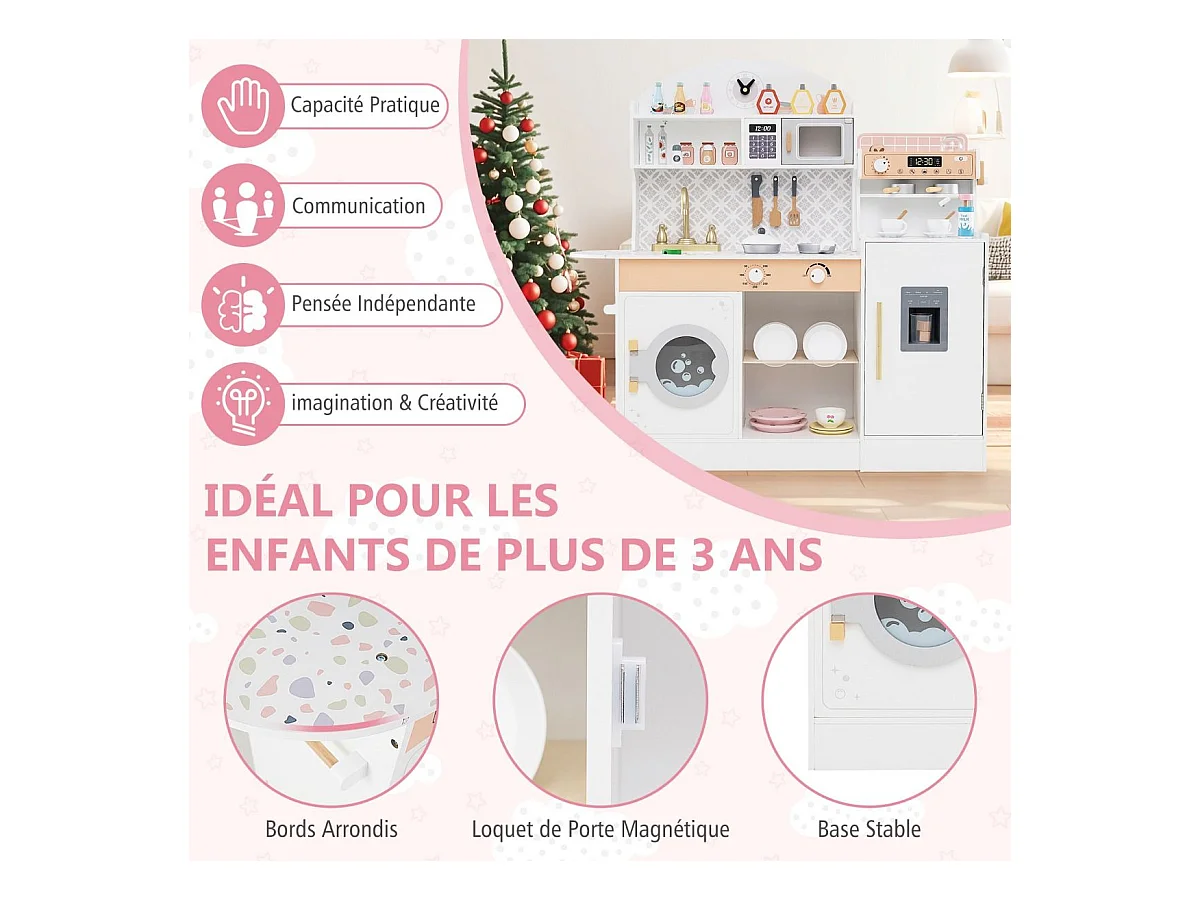 Cuisine Enfant en Bois avec Effets Sonores et Lumières, avec Machine à Laver et Micro-Ondes, Machine à Glaçons, Jouet de Simulation pour Enfant de 3 Ans+