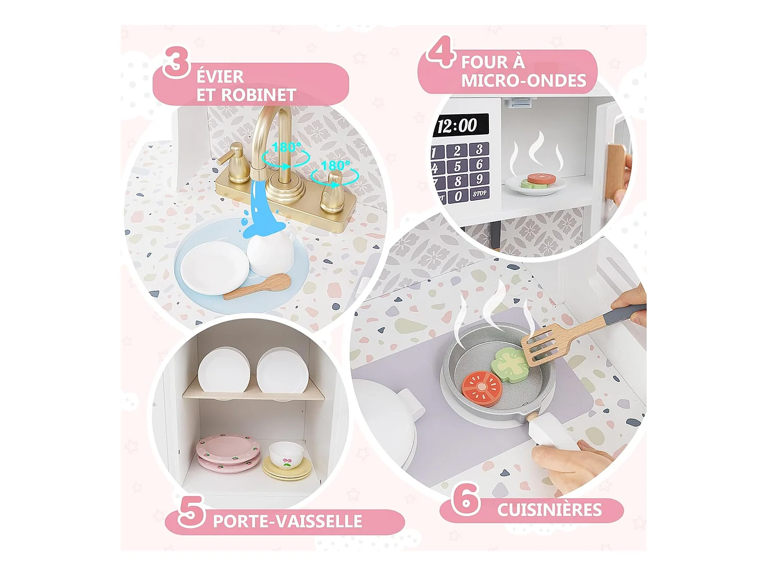 Ensemble de Cuisine SucceBuy pour Enfants, Cuisine de Jeu en Bois avec Lumières et Sons, Jouet de Cuisine avec 24 Pièces, Blanc