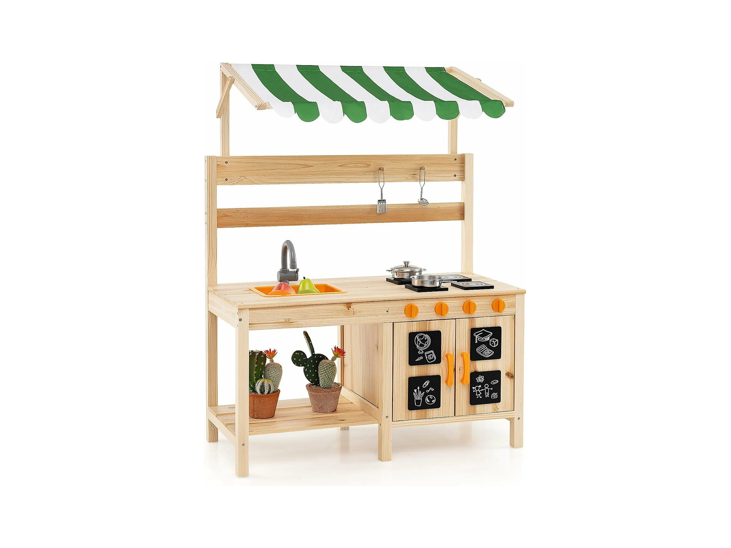 Cuisine Enfant Extérieure avec Tableau Noir & Auvent, Jeu de Cuisine en Bois de Sapin avec 4 Accessoires, Boutons Rotatifs & Étagère, Cuisine de Boue pour 3 Ans+