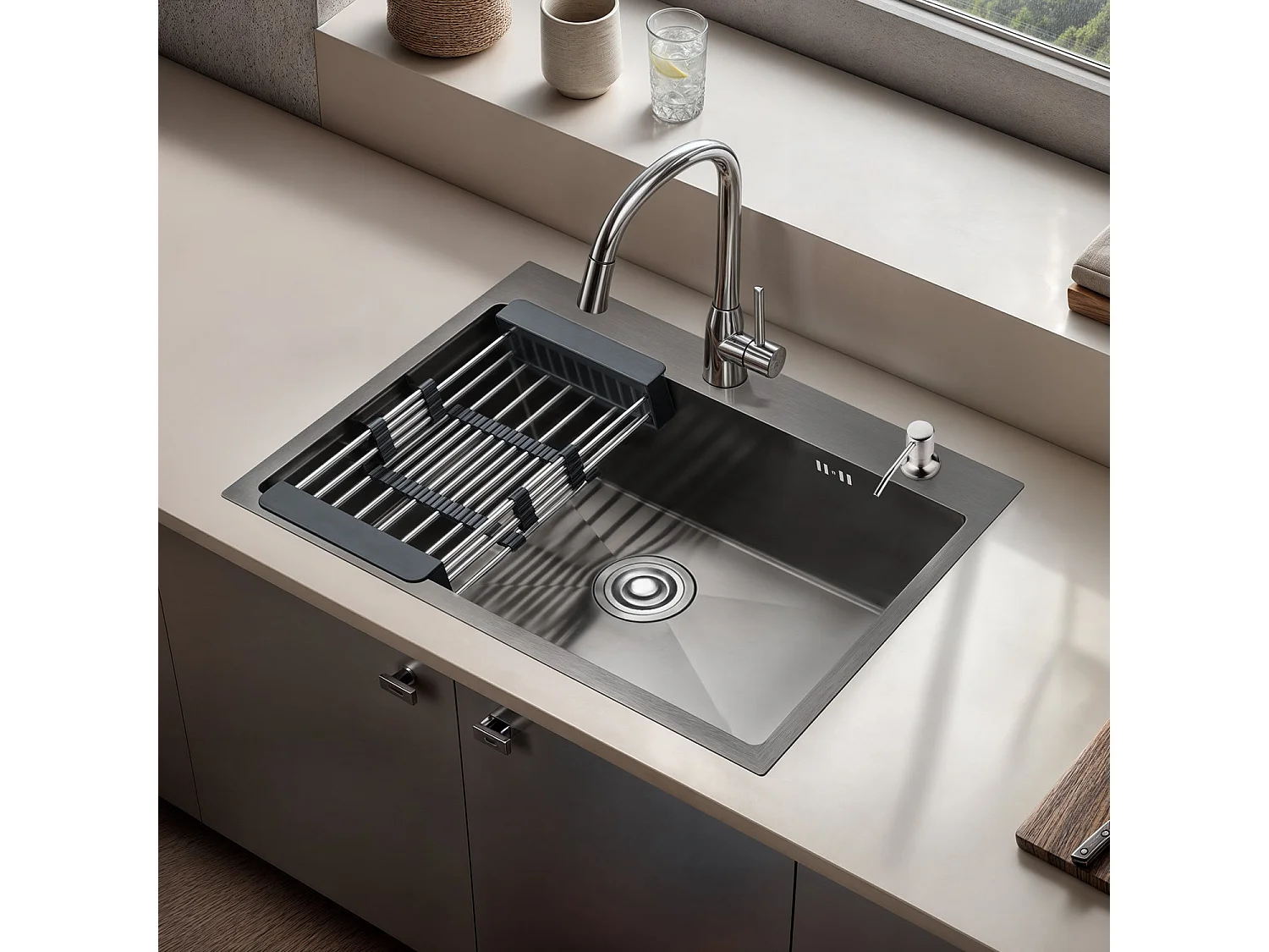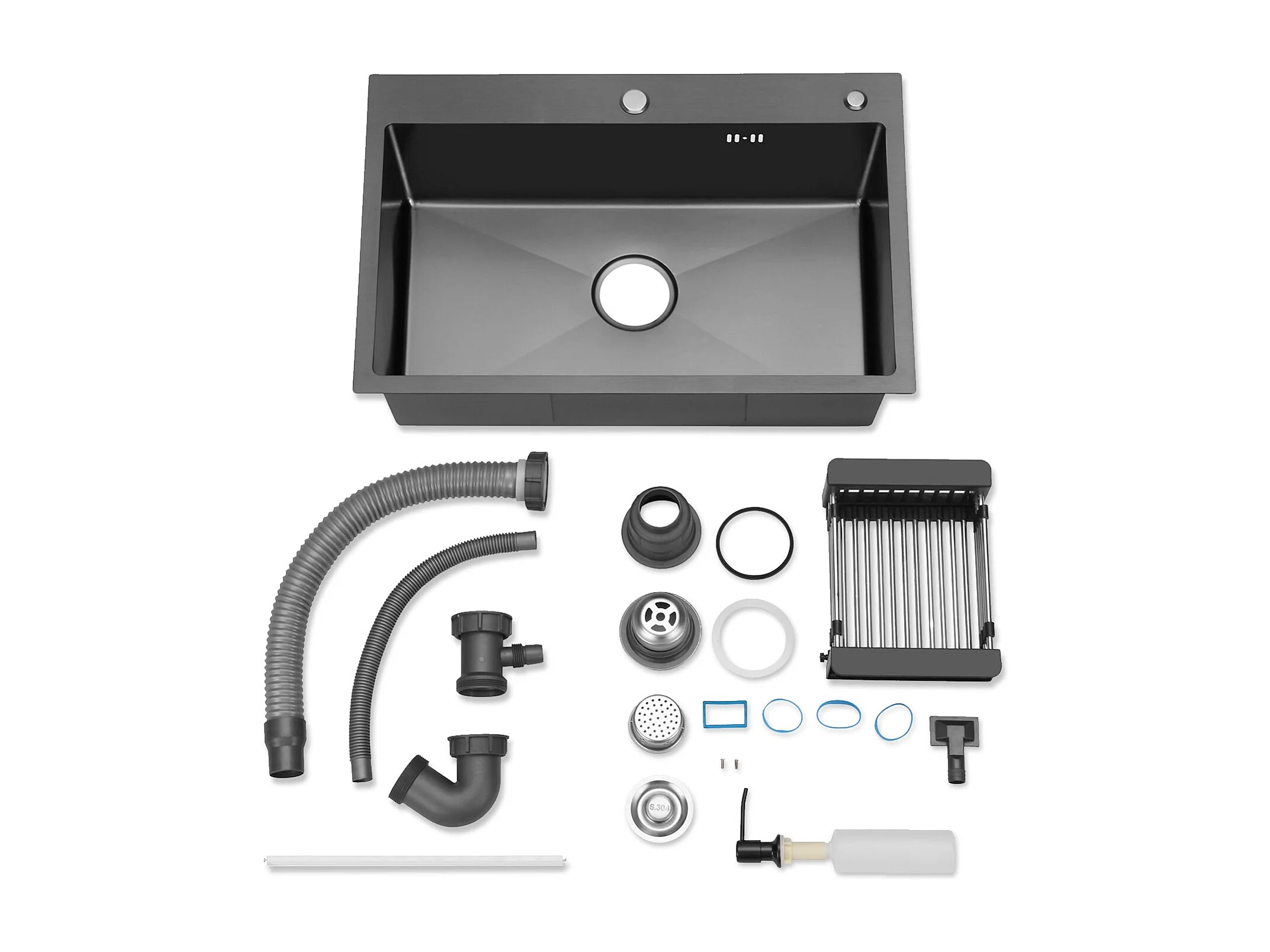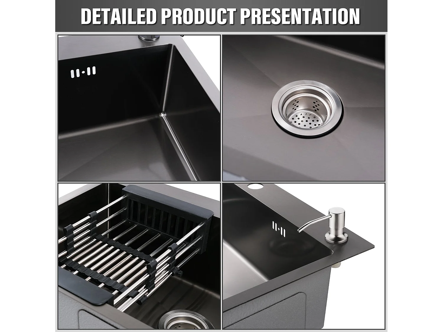 Évier Cuisine 1 Bac 68*45*19CM INOX Trop Plein Évier à Encastrer, avec Distrubuteur Savon et Égouttoir Panier Noir,EU Modèle