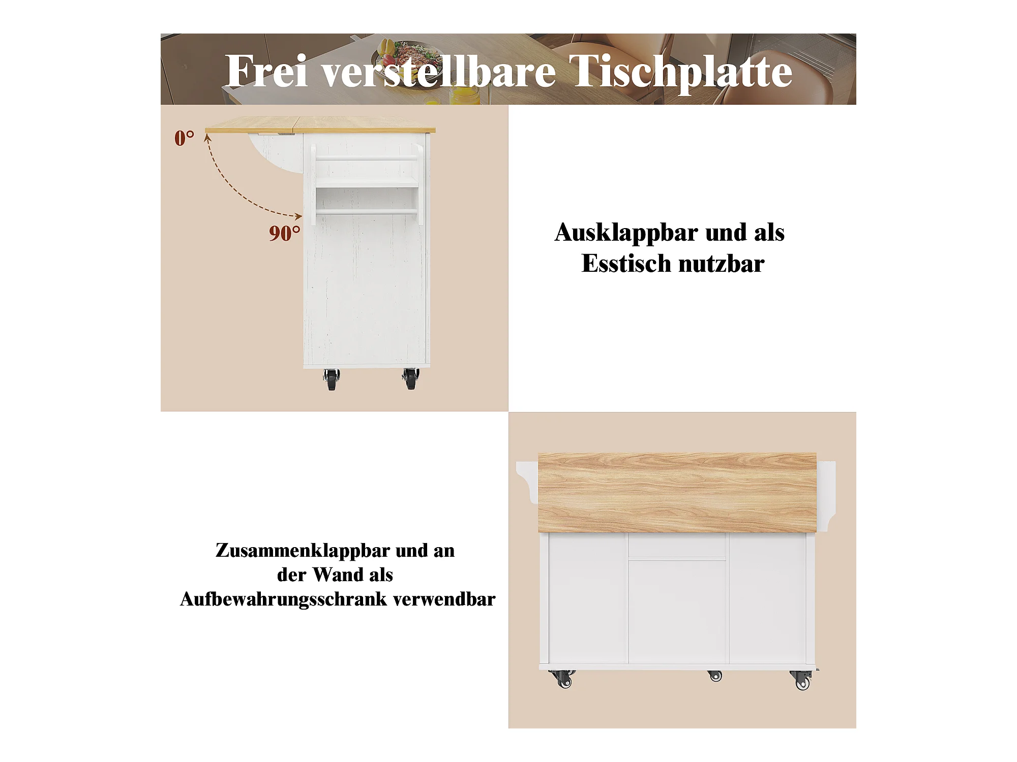 Table de cuisine mobile avec surface rabattable, style campagne, avec rangement multifonction, étagères à épices et prise intégrée (132x70x87 cm)