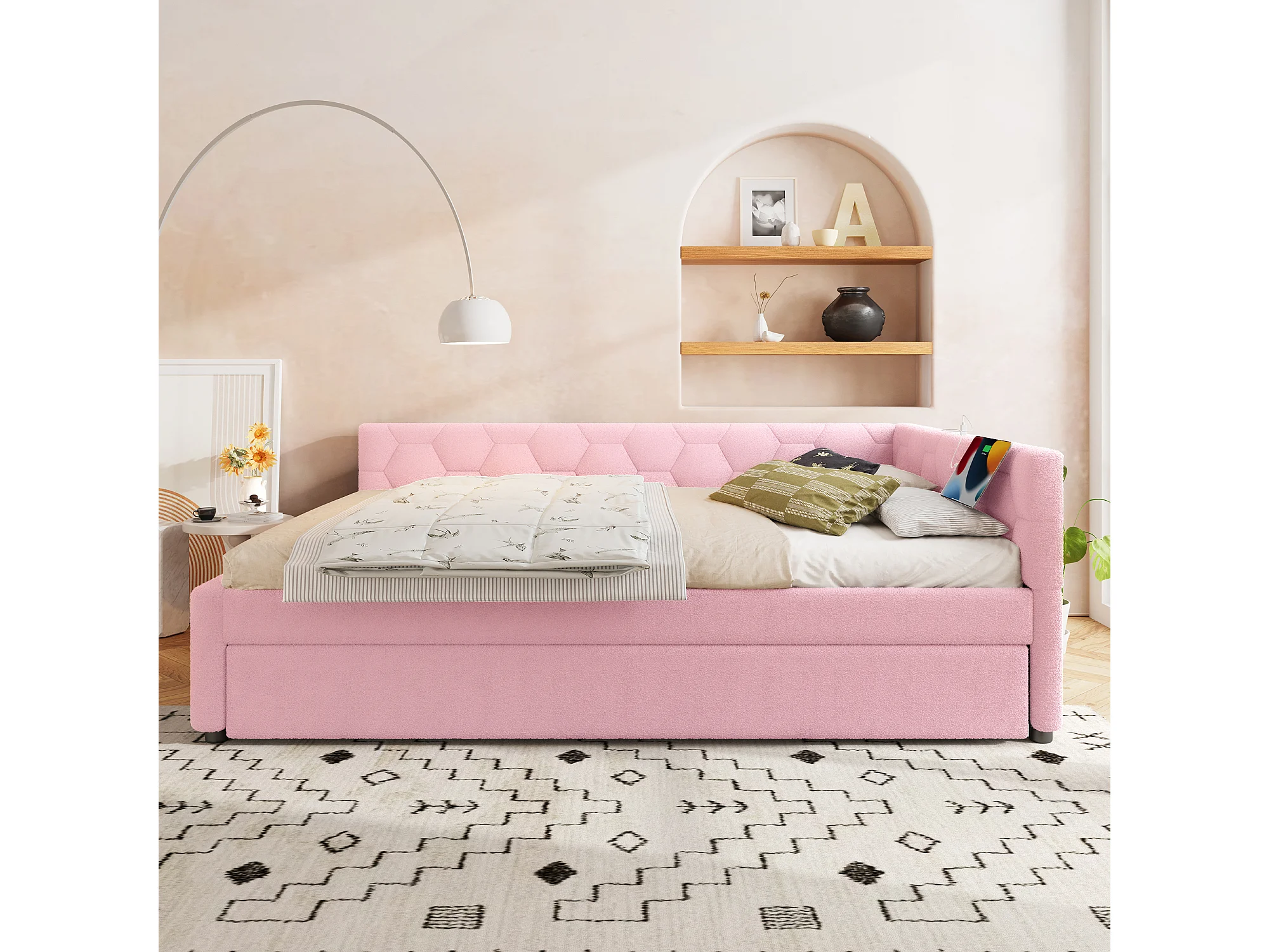 Lit banquette 140x200 cm, peluche rose, lit gigogne avec lampe de chevet et port USB - sans matelas