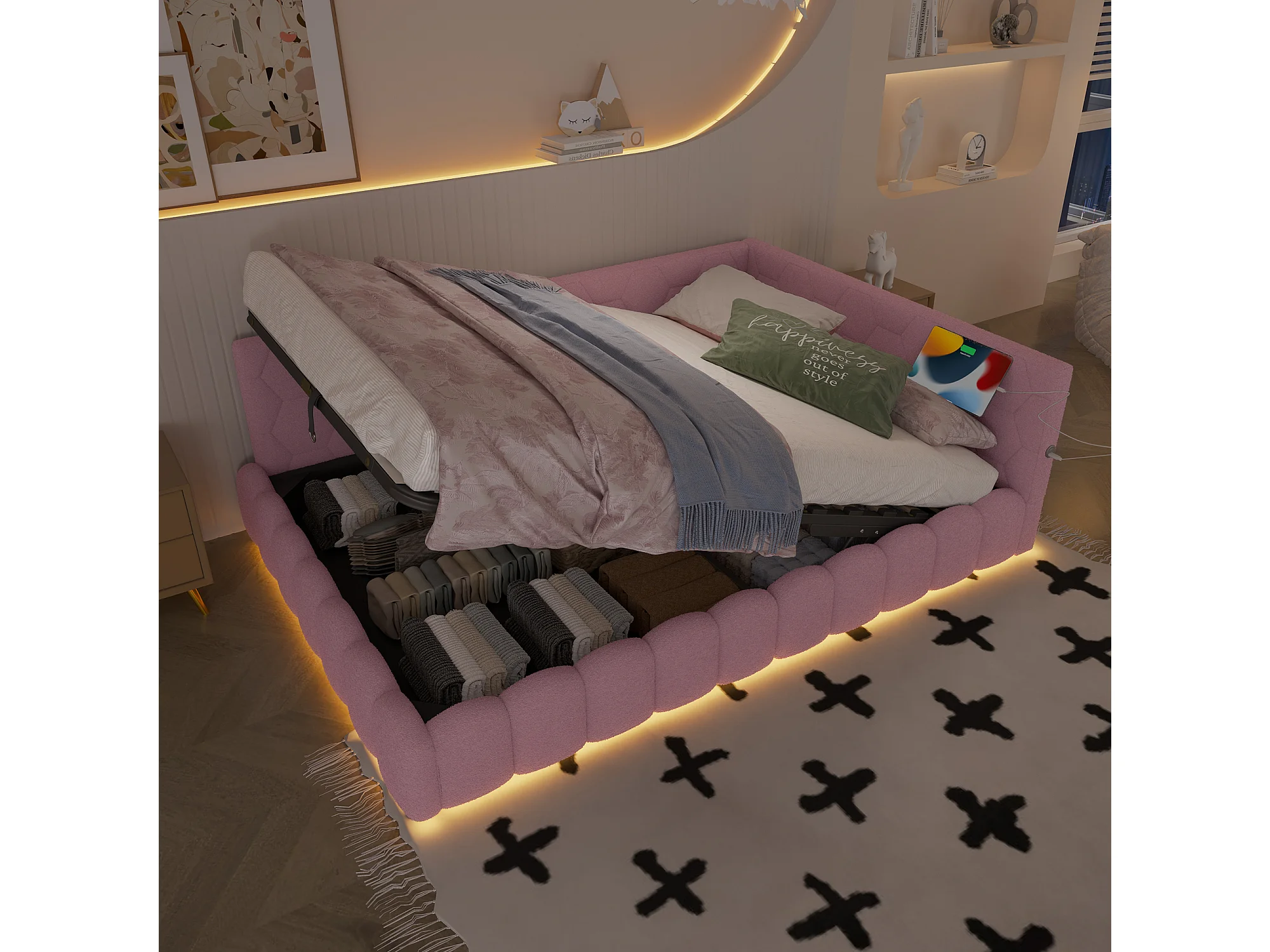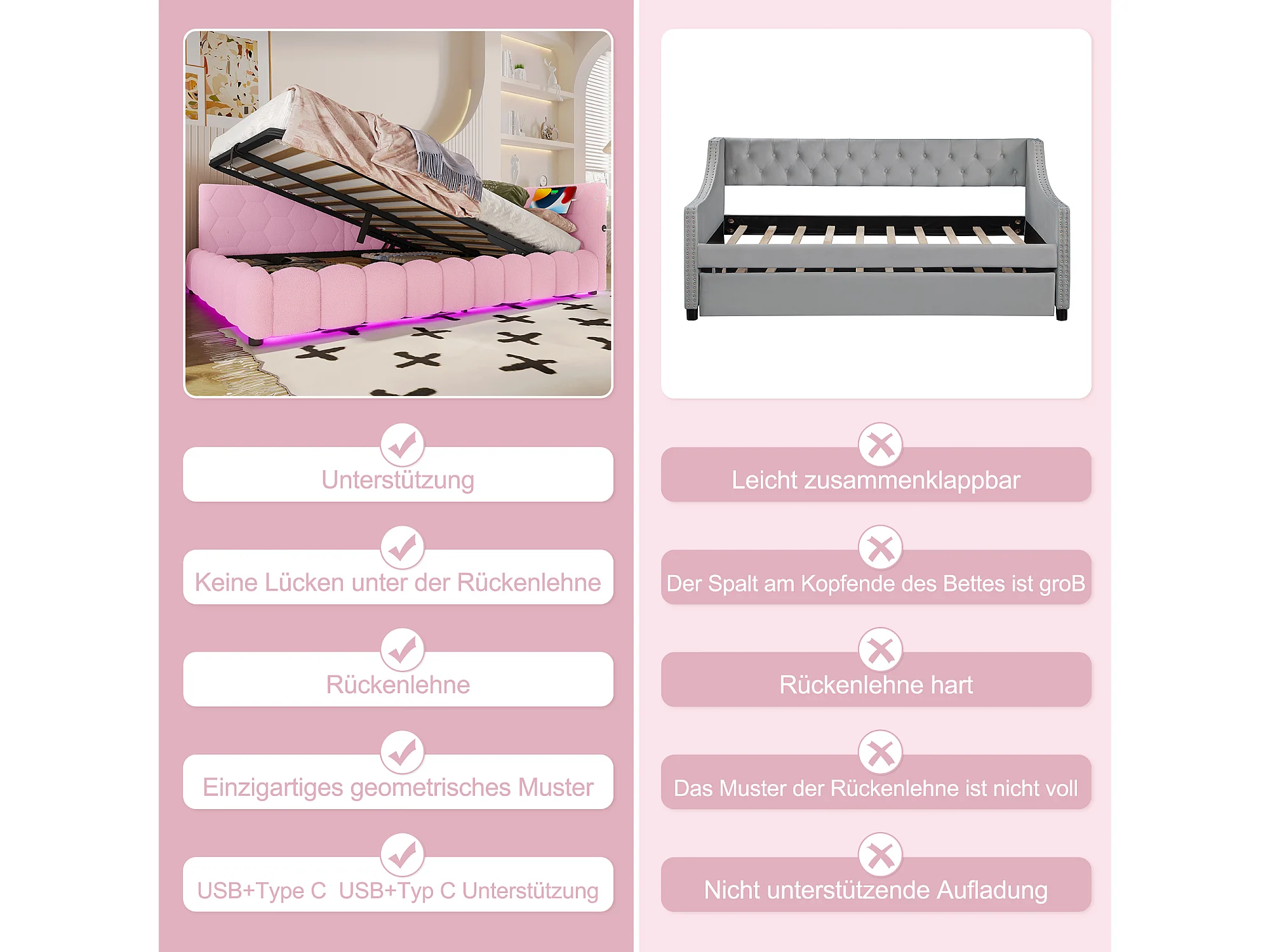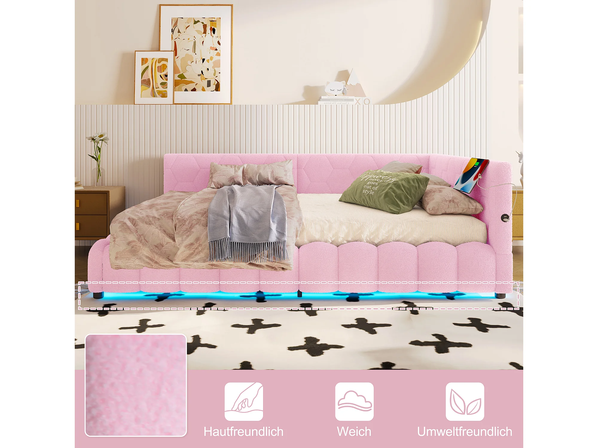 Daybed, 140x200 cm, canapé-lit, avec éclairage ambiant à 16 couleurs, USB, Type-C, tissu velours, Rose (214x152x64.5 cm)