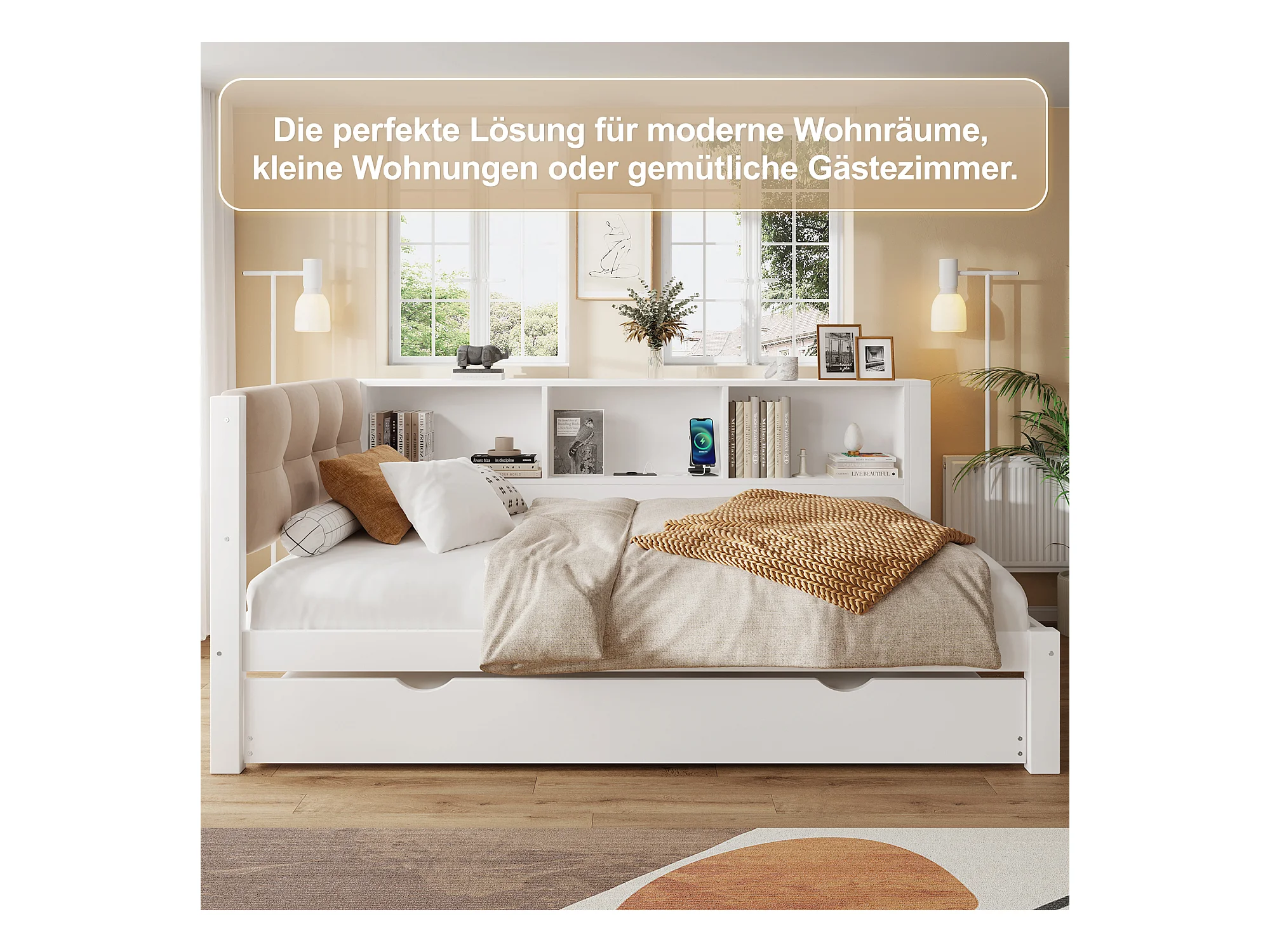 Schlafsofa, Daybett, mit LED-Fernbedienung, 3 Schubladen, Nachttischablage, Multifunktionales Ausziehbett, Weiß (210x260x115 cm)