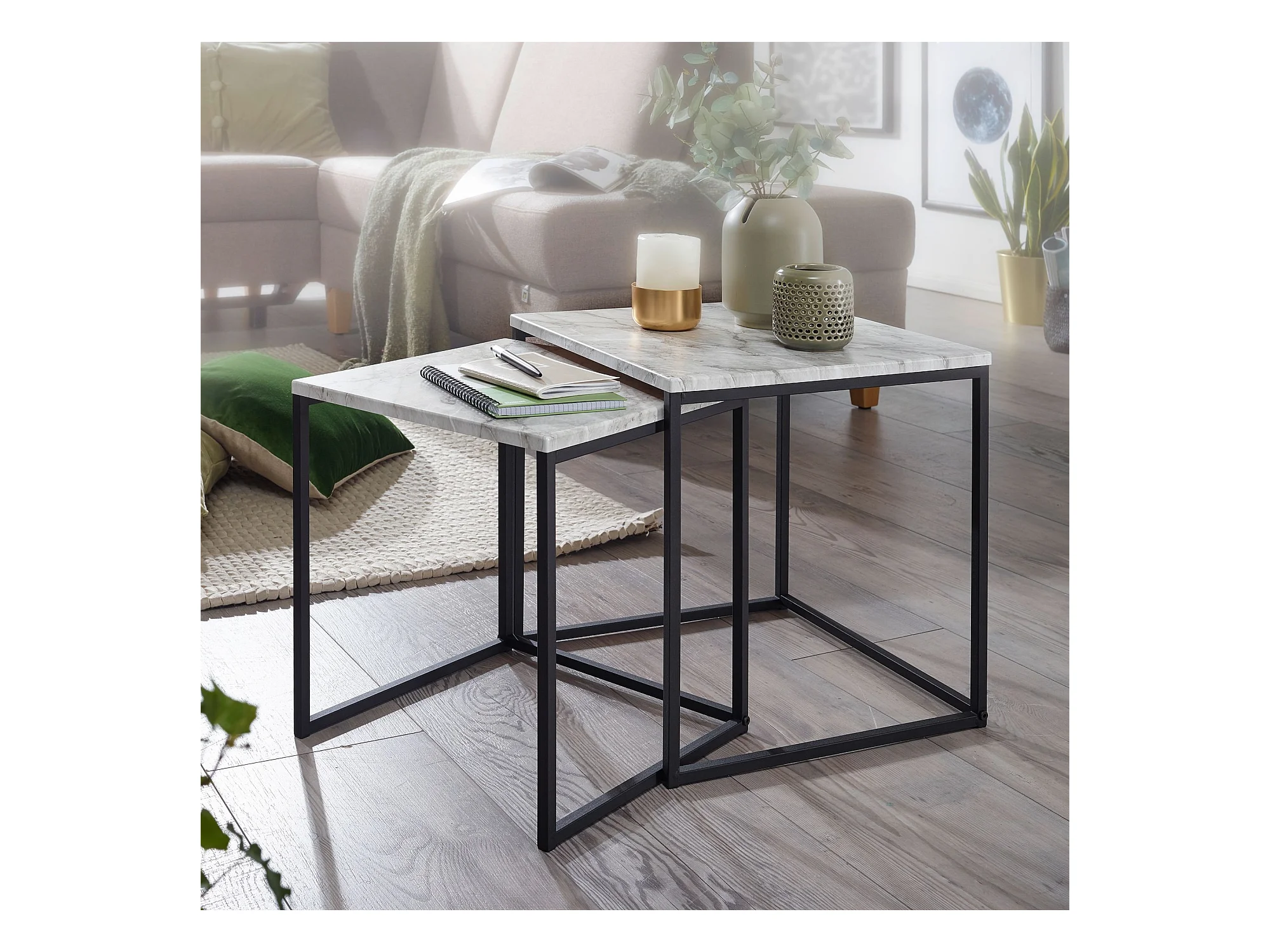 design set de 2 aspect marbre blanc | Table basse 2 parties structure de table noir | Petites tables de salon Tables gigognes modernes