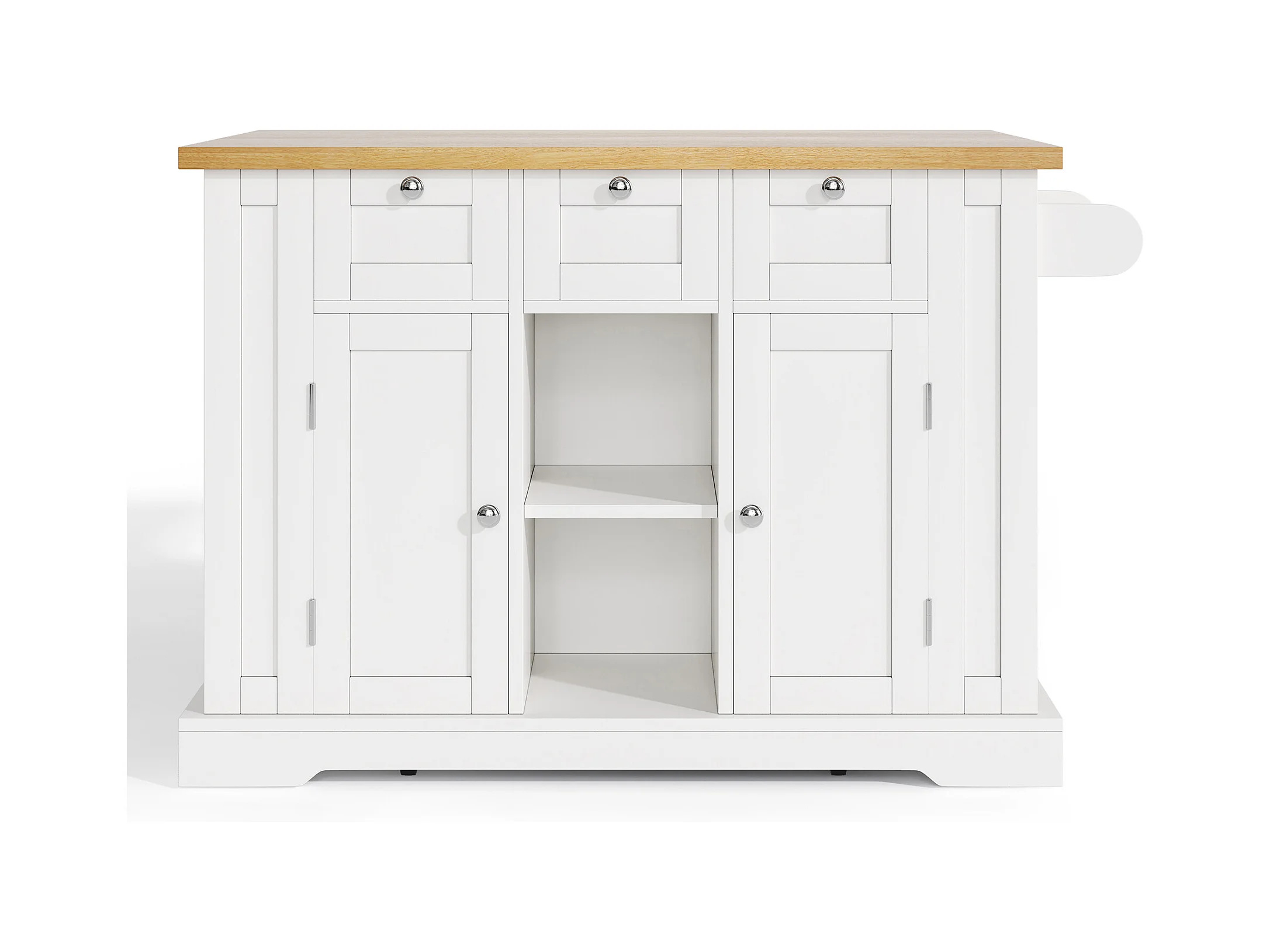 Îlot central mobile avec plateau en bois, 3 portes texturées et étagère à épices - blanc