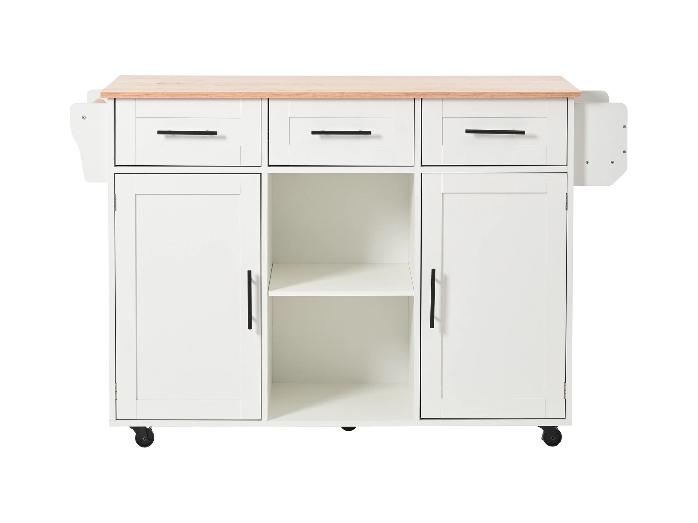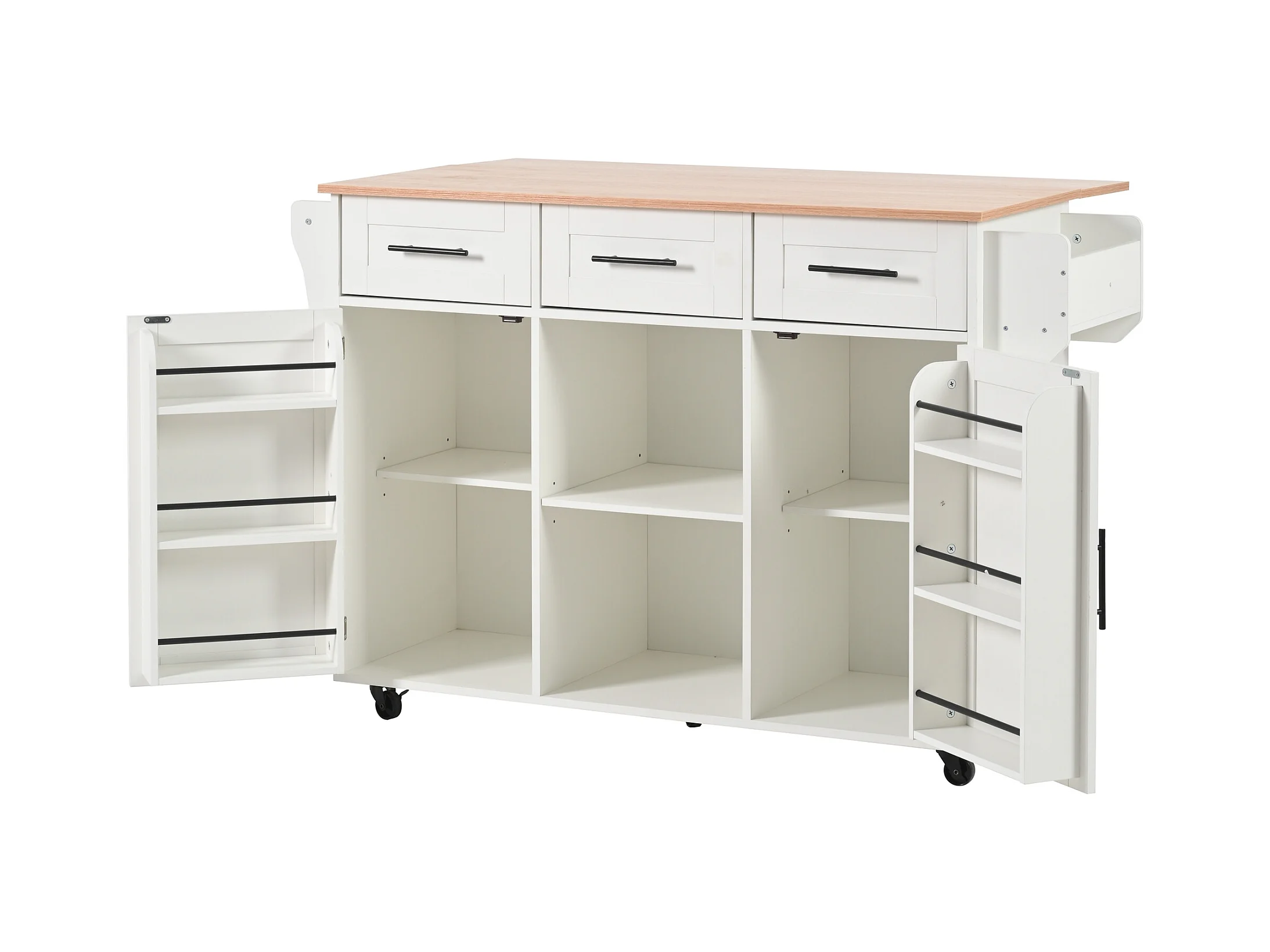 Îlot central mobile avec plateau en bois, 3 portes texturées et étagère à épices - blanc