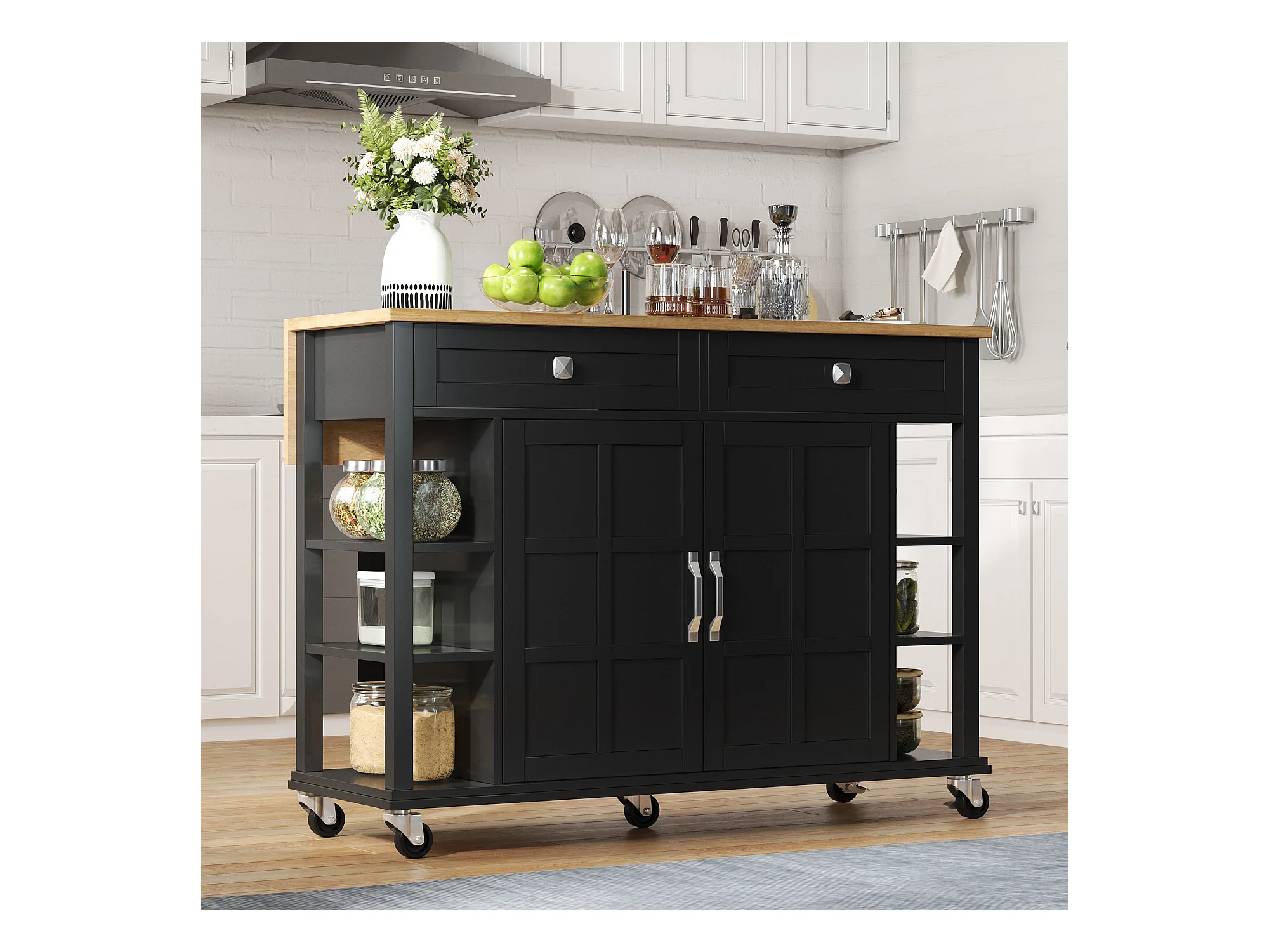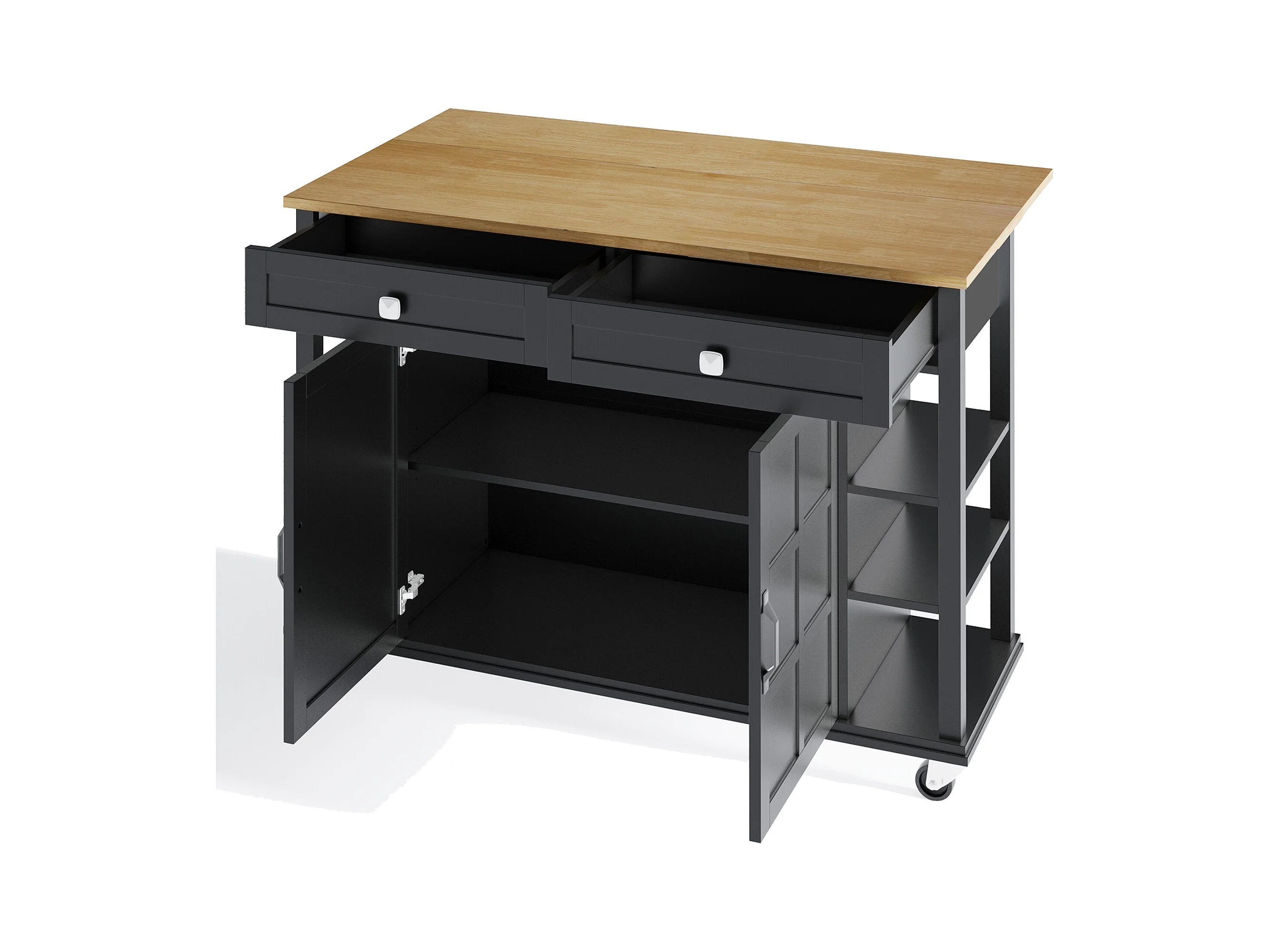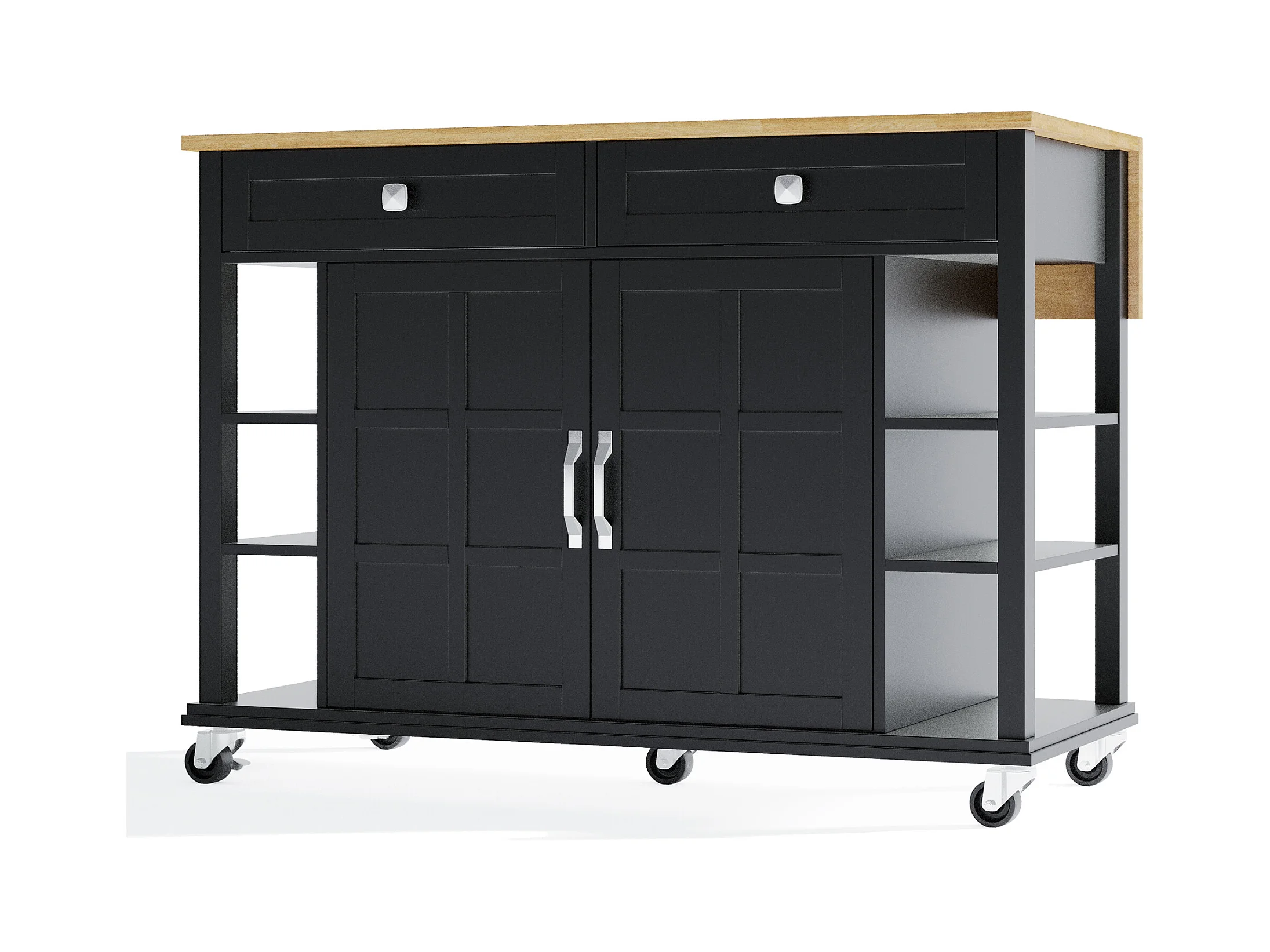 Desserte de cuisine à roulettes avec 2 tiroirs et portes, plateau extensible en finition bois, noir