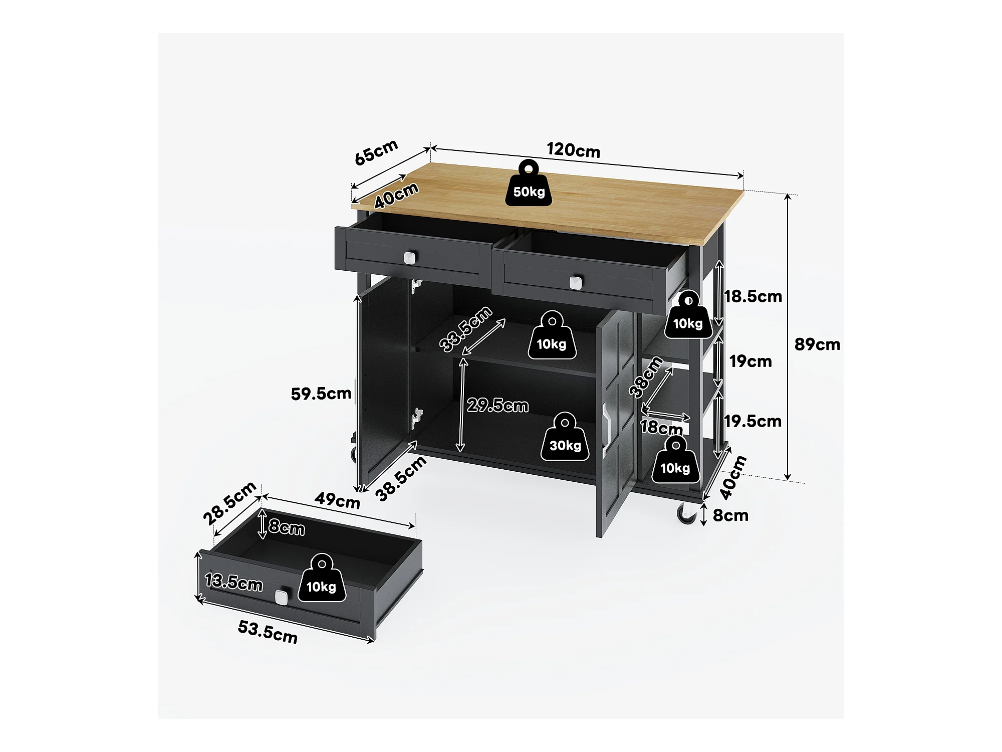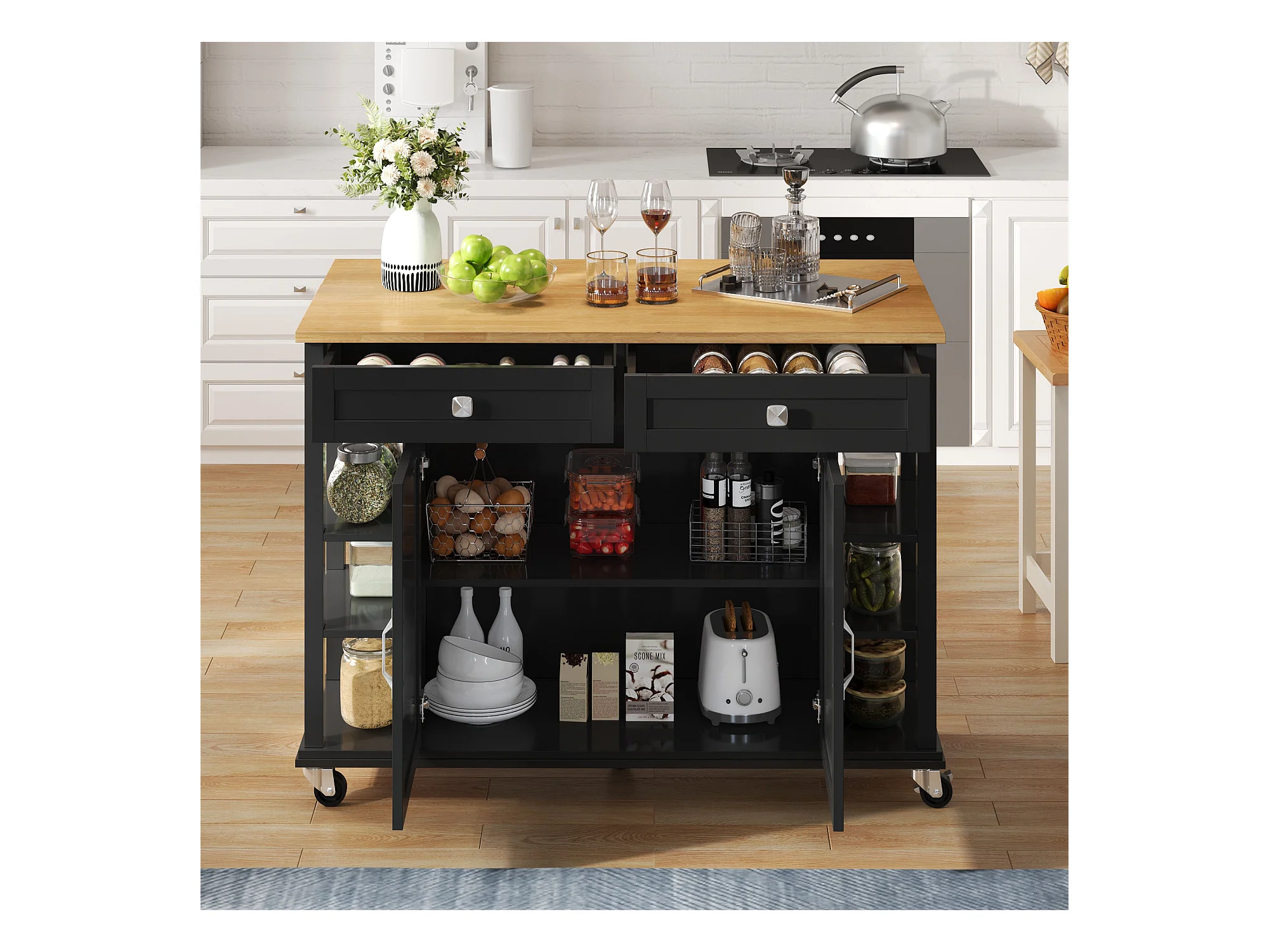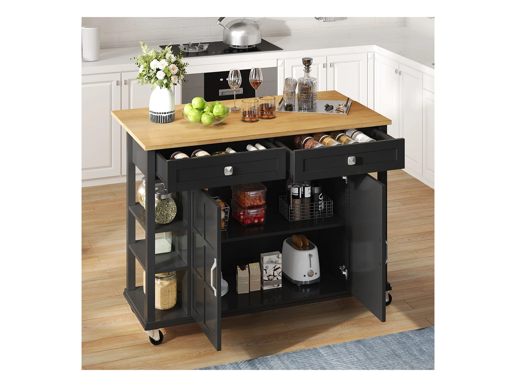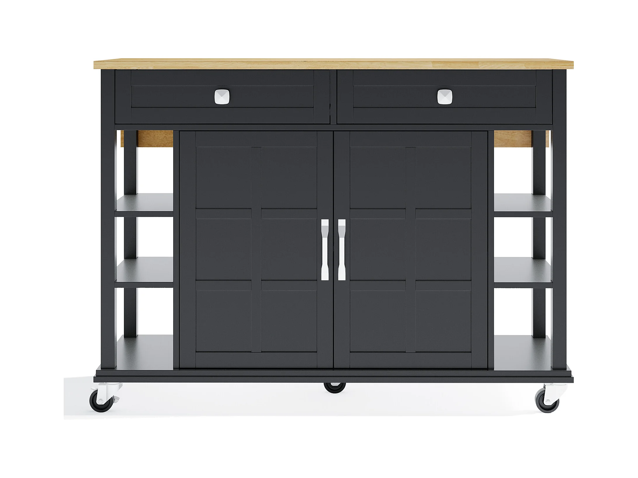 Desserte de cuisine à roulettes avec 2 tiroirs et portes, plateau extensible en finition bois, noir