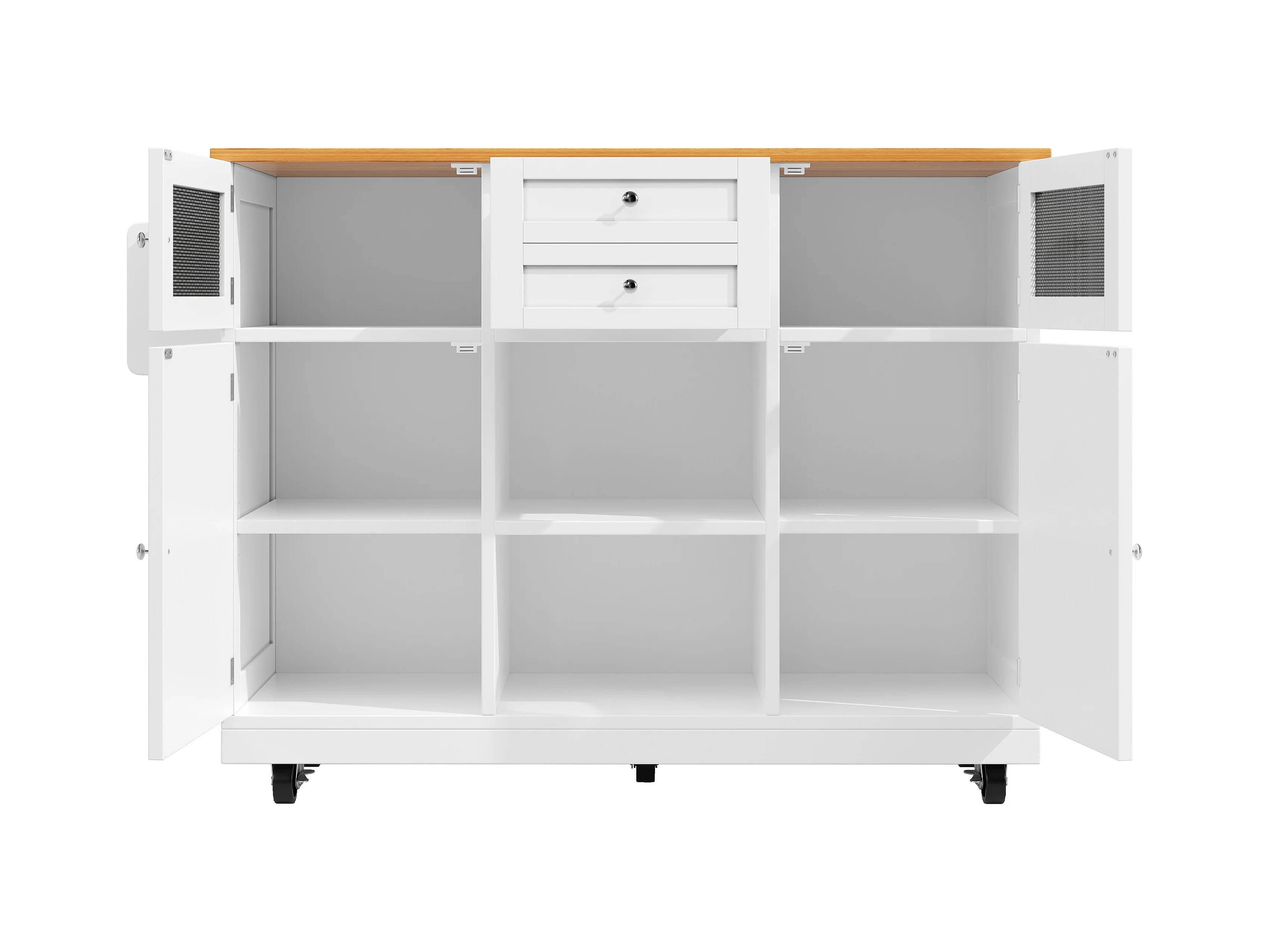 Îlot central de cuisine mobile blanc - Desserte de cuisine avec 4 portes et 2 tiroirs - plateau extensible et étagère à épices