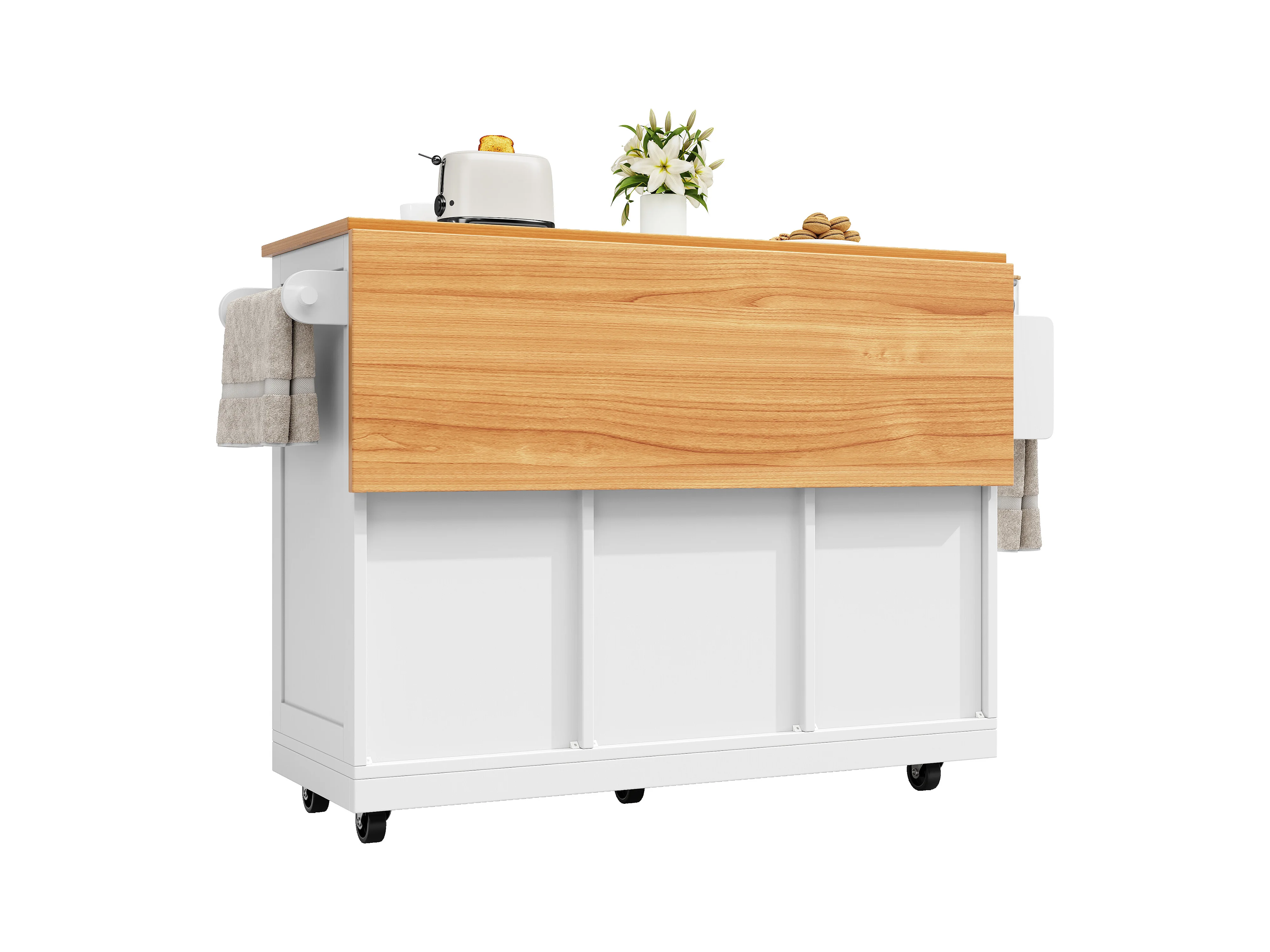 Îlot central de cuisine blanc à 3 portes et 3 tiroirs - Desserte de cuisine avec porte-serviettes et rangement ouvert - plateau pliable