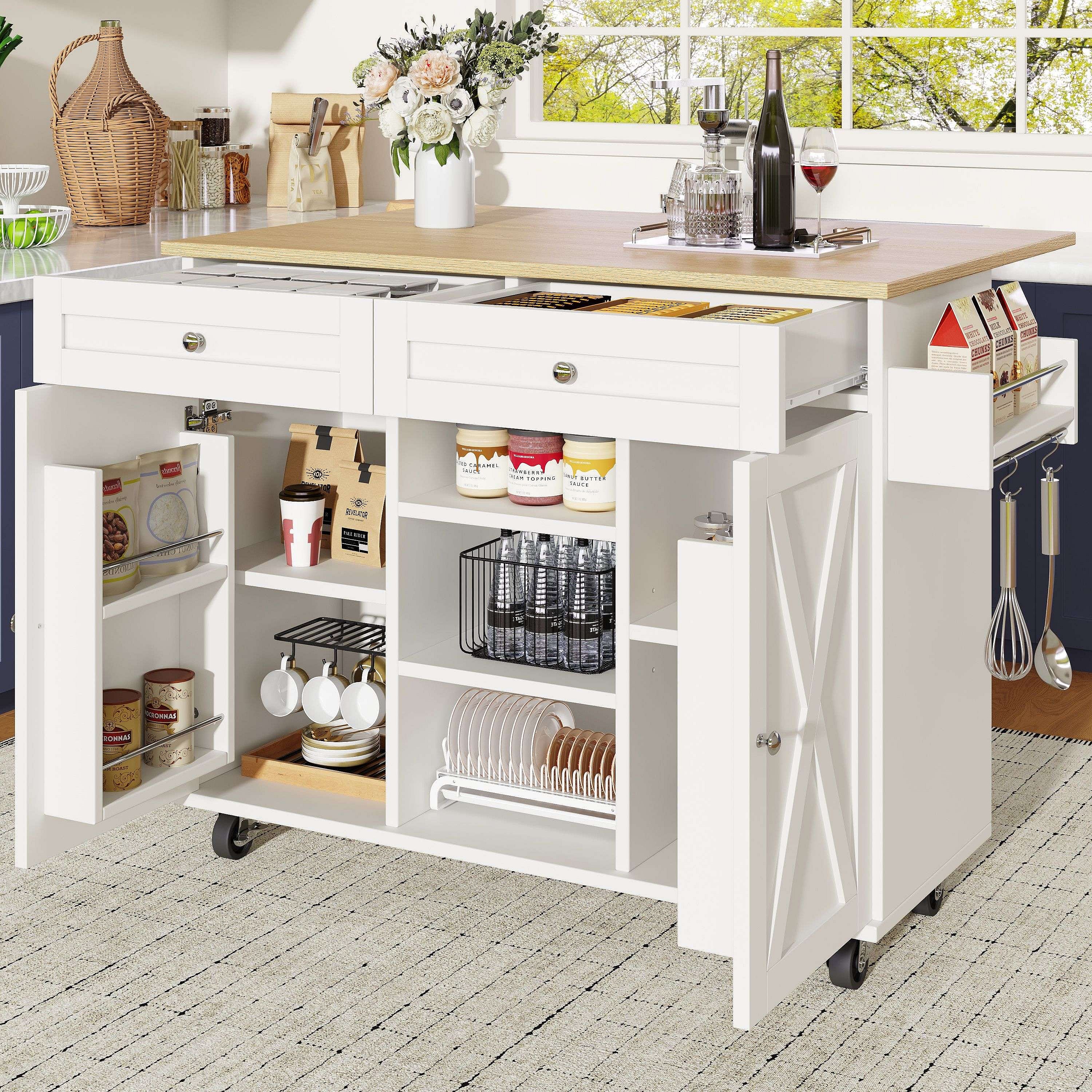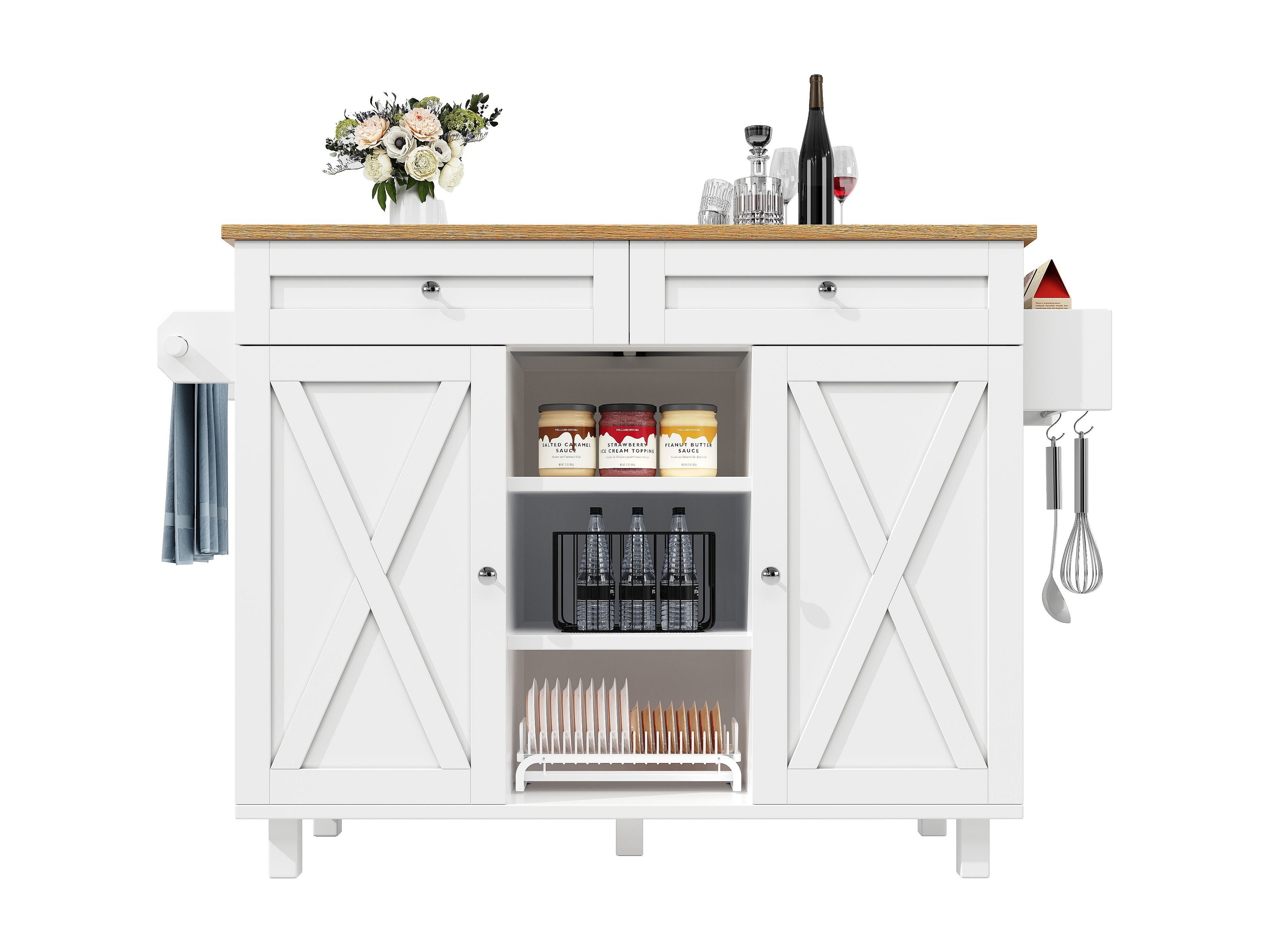 Desserte de cuisine blanche avec 2 tiroirs et 2 portes, plateau en bois - pour salon et cuisine