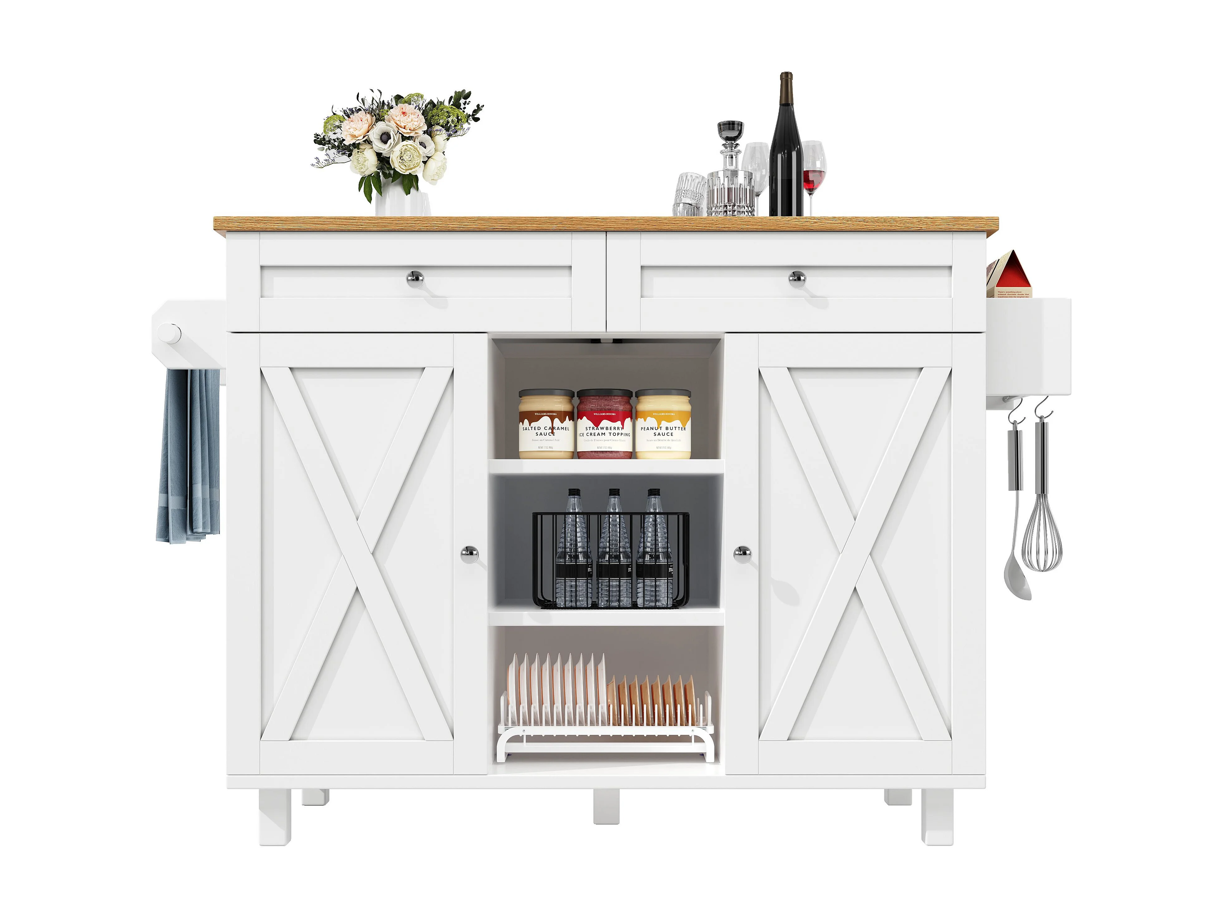Îlot central mobile avec plateau en bois, 3 portes texturées et étagère à épices - blanc