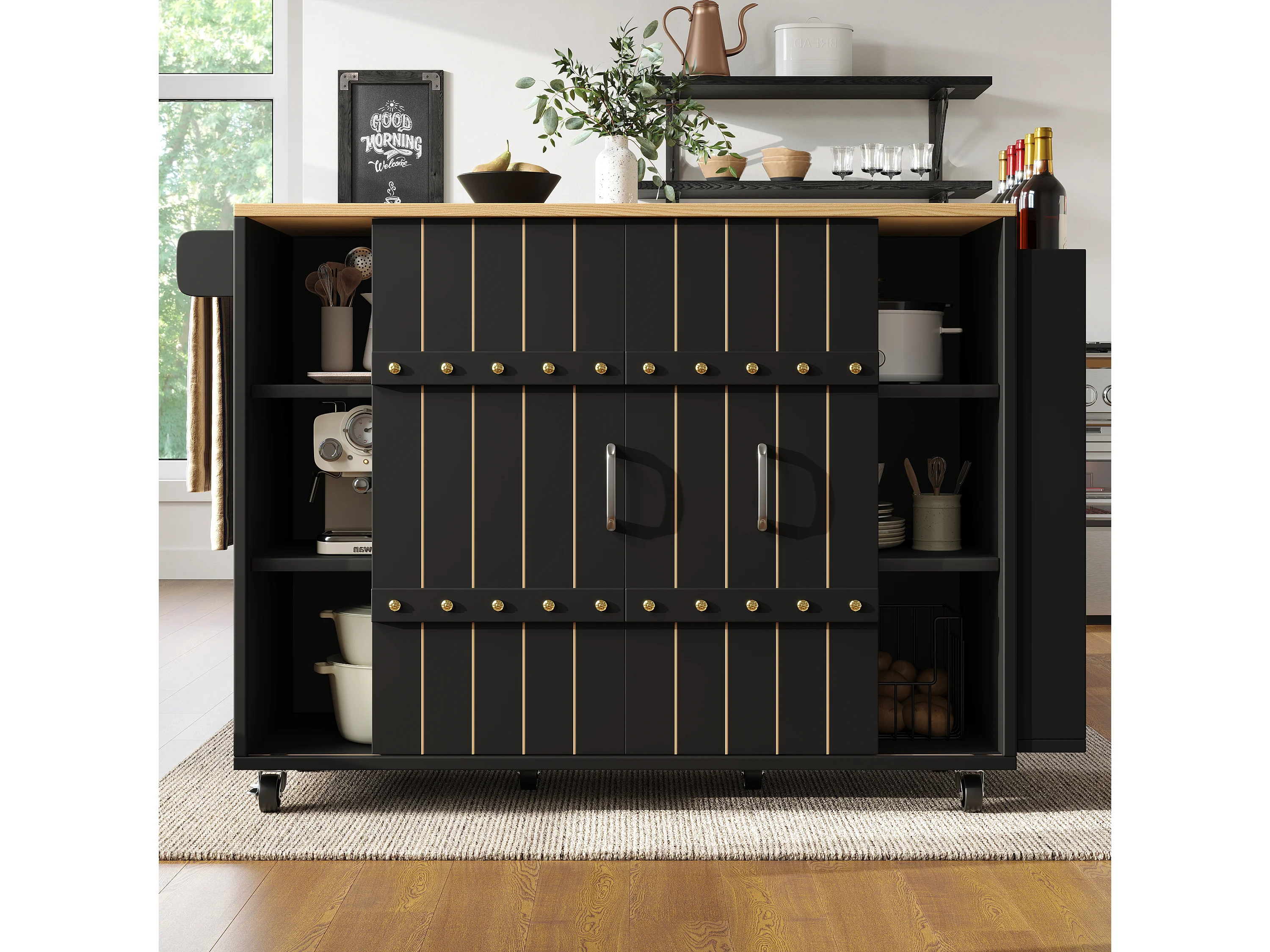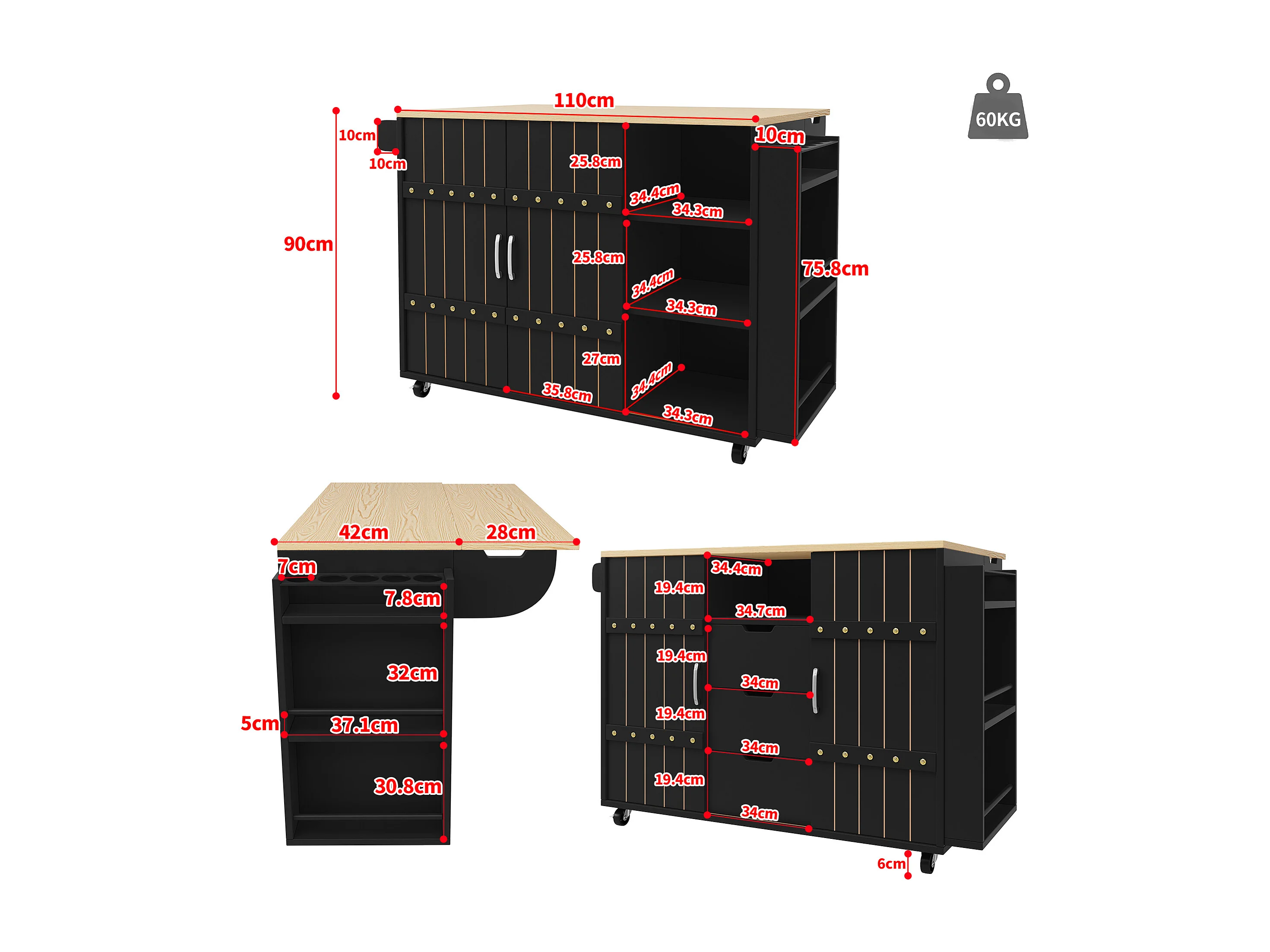 Desserte de cuisine 110x(42-70)x90 cm 2 portes coulissantes et 3 tiroirs Îlot de cuisine avec plateau extensible - noir