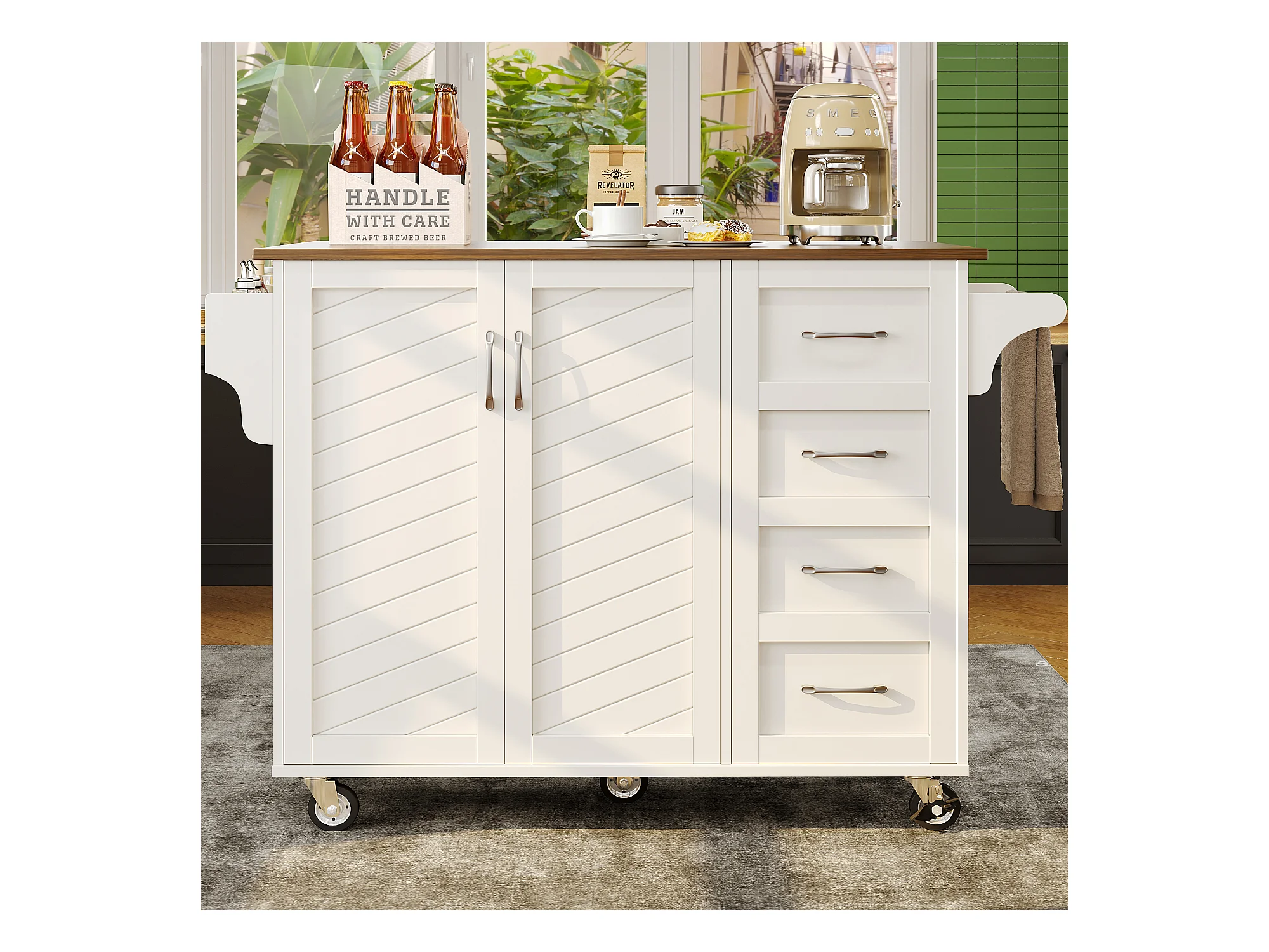 Desserte de cuisine 124x(40-65)x91.5 cm 2 portes et 3 tiroirs Îlot de cuisine avec plateau extensible - blanc