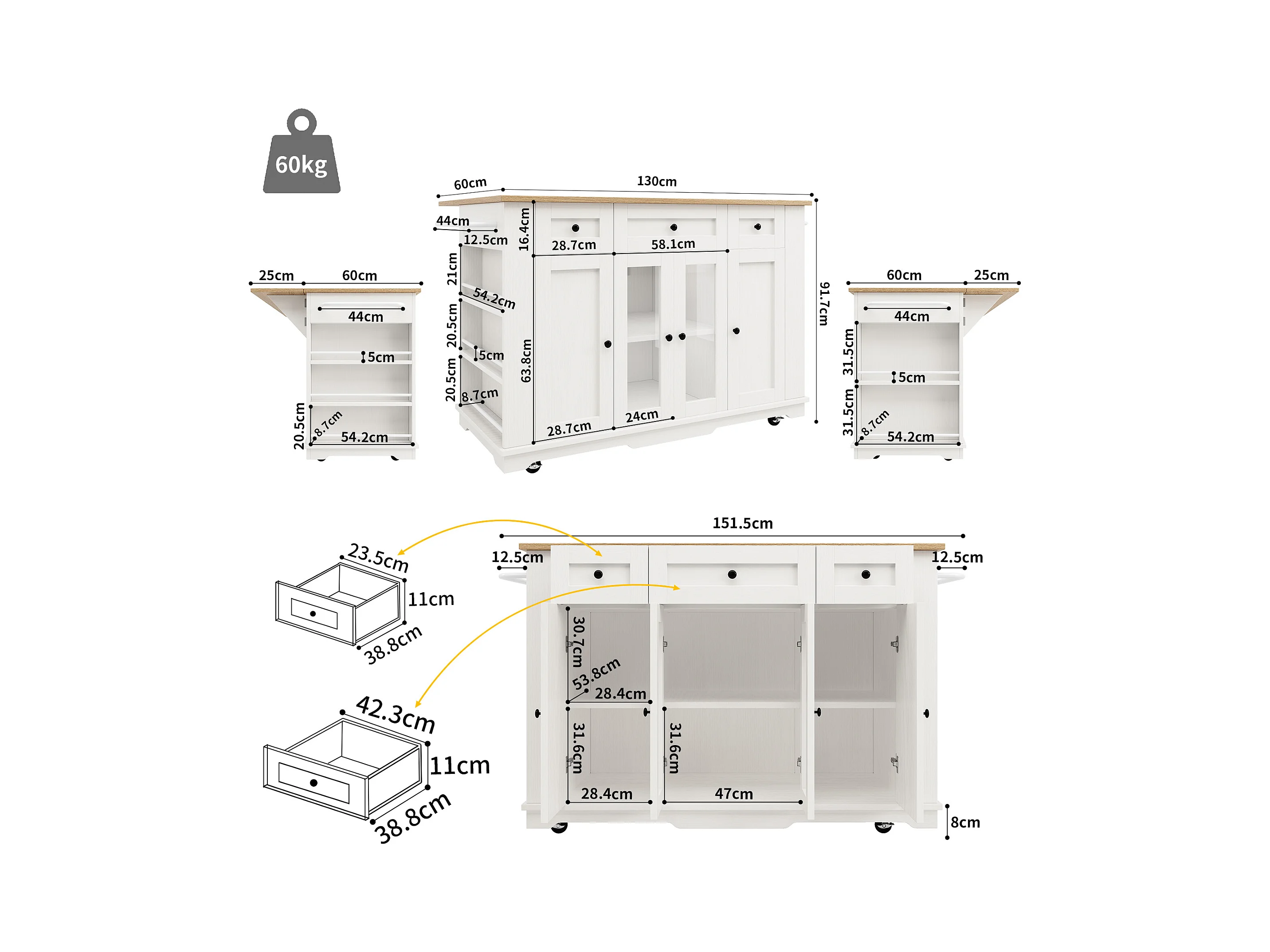 Desserte de cuisine 151.5x(60-85)x91.7 cm 2 portes et 3 tiroirs Îlot de cuisine en bois avec plateau extensible - blanc