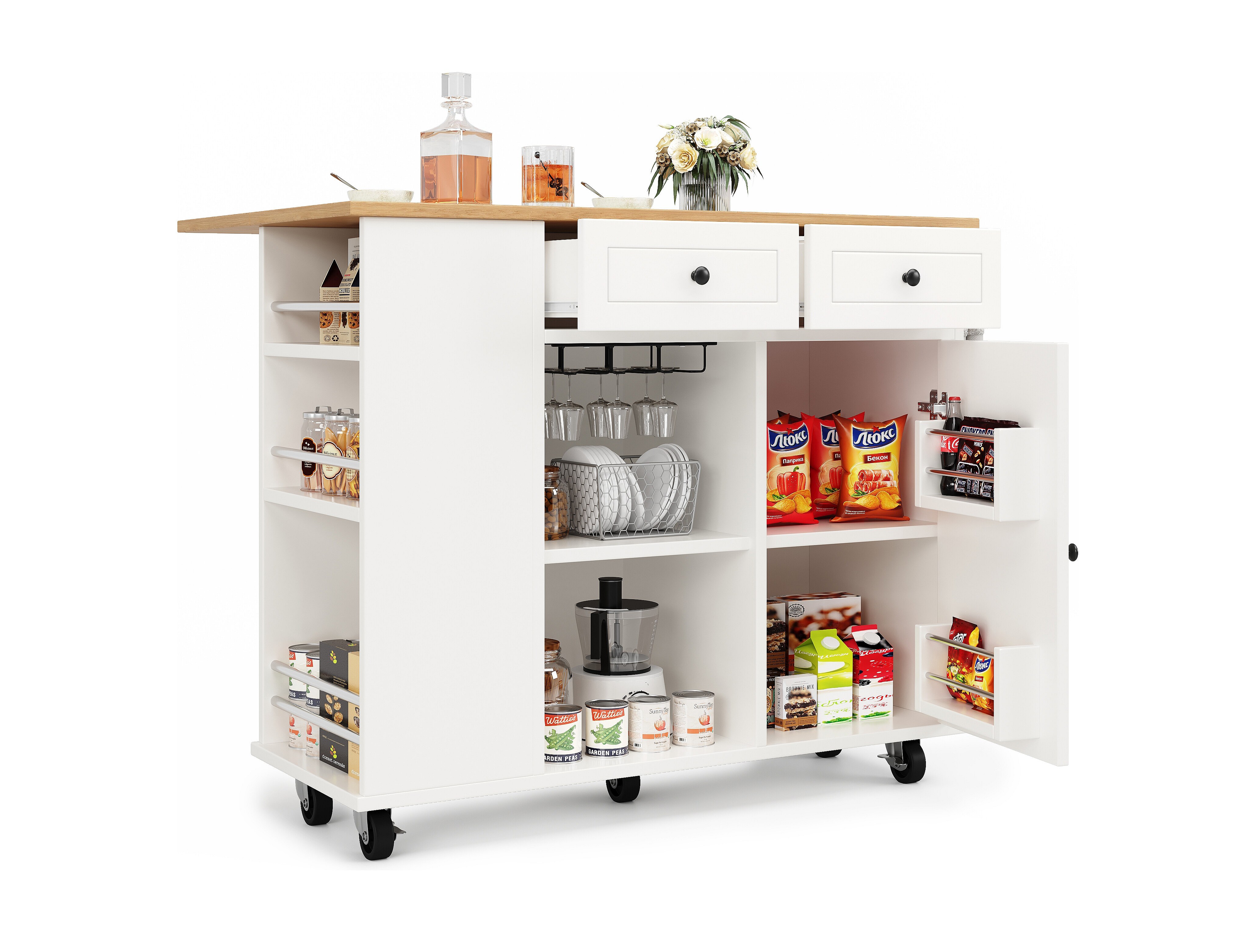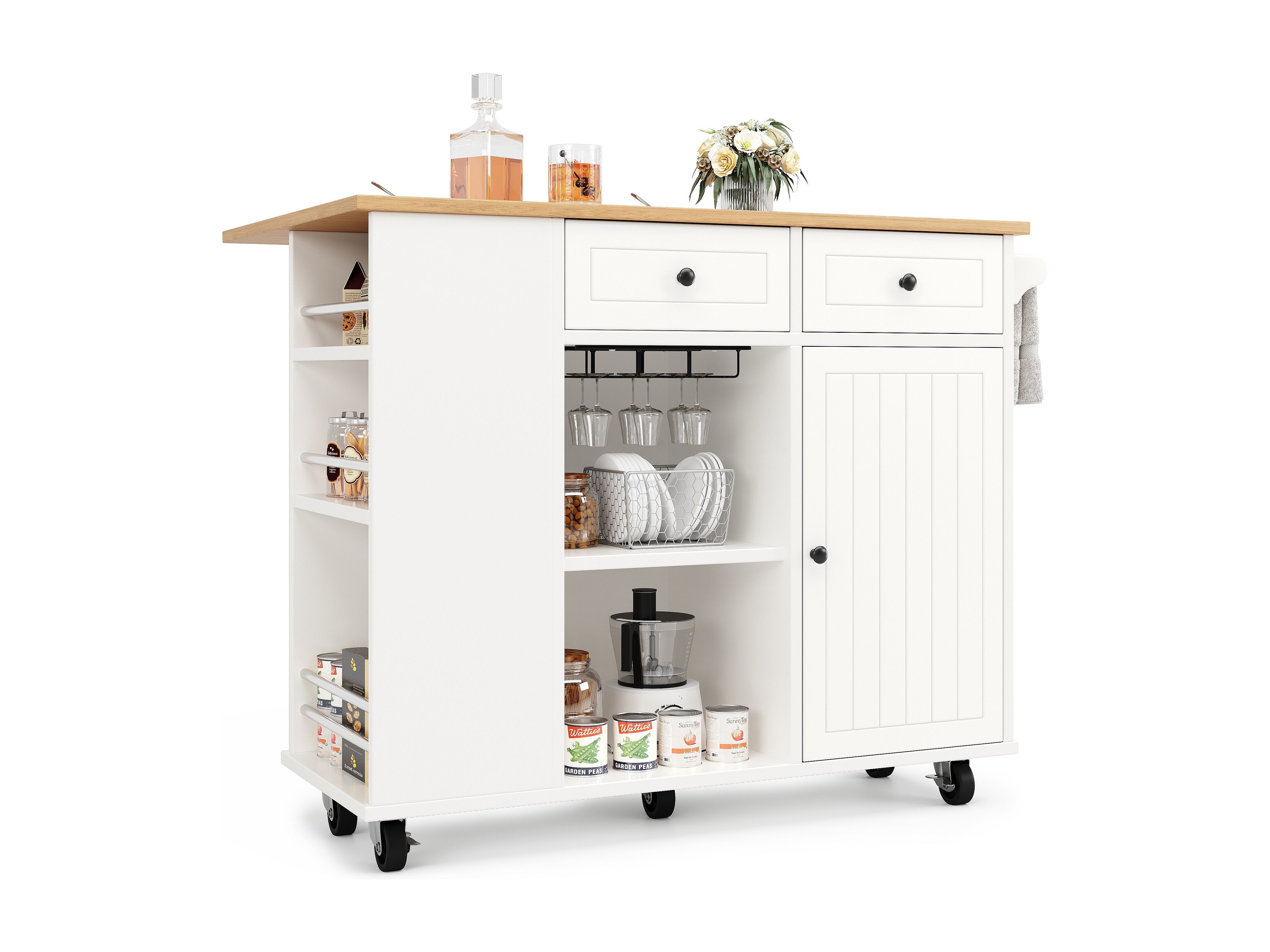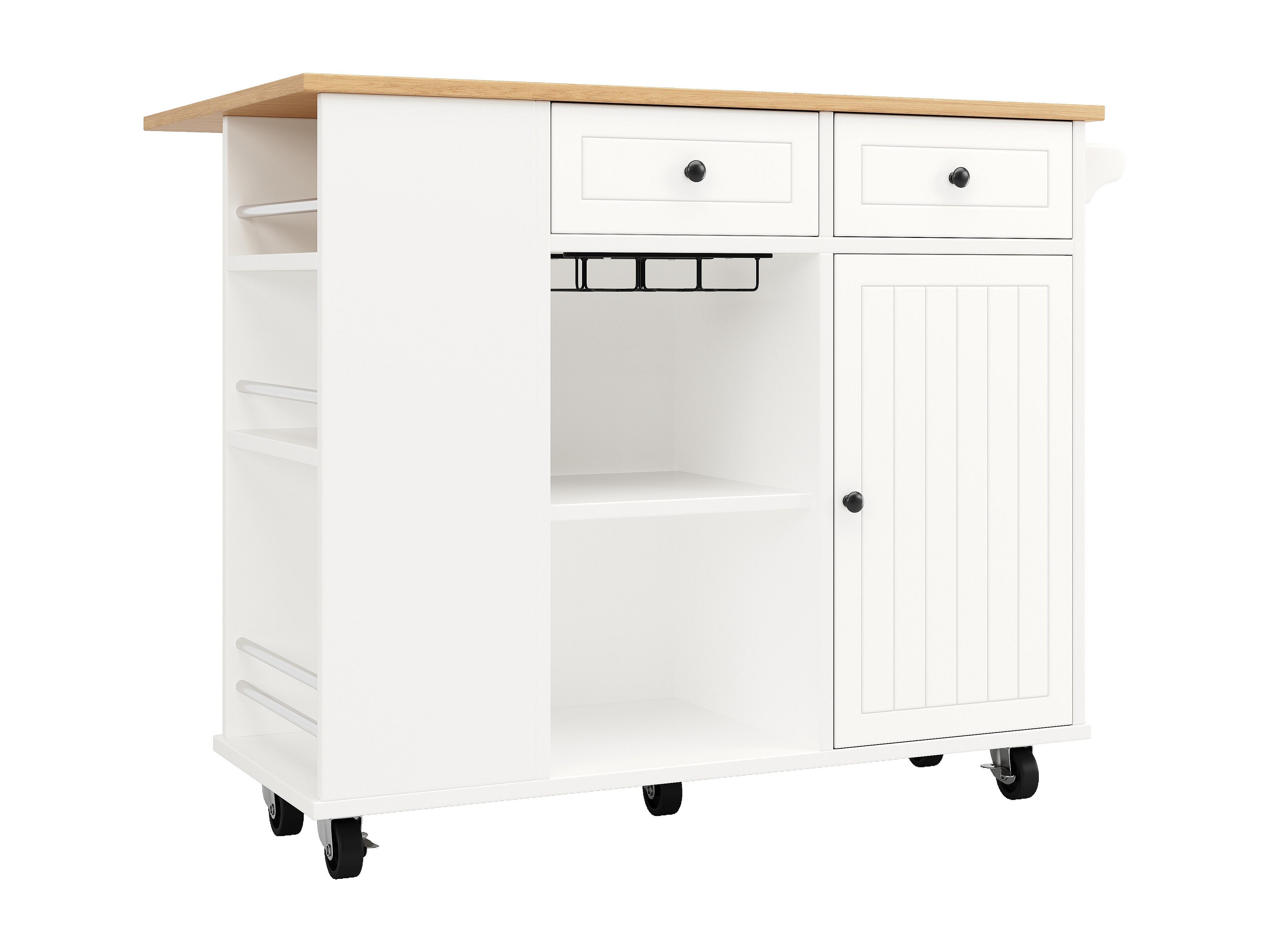 Desserte de cuisine mobile blanc avec porte-serviettes - Îlot central de cuisine avec 2 tiroirs et 1 porte - 5 compartiments de rangement ouverts