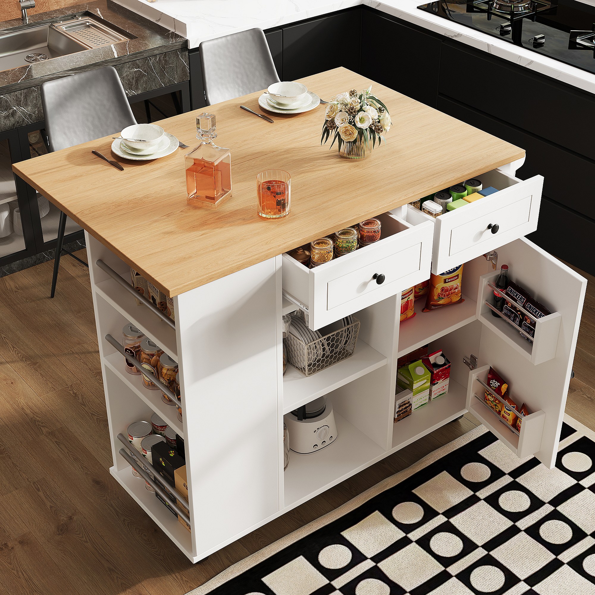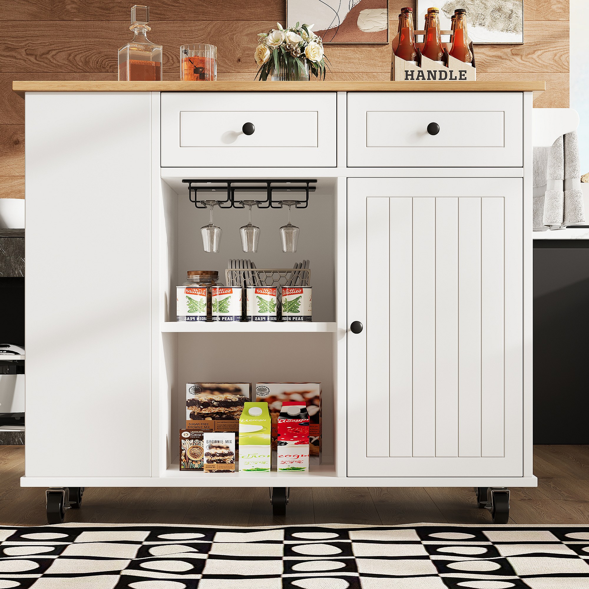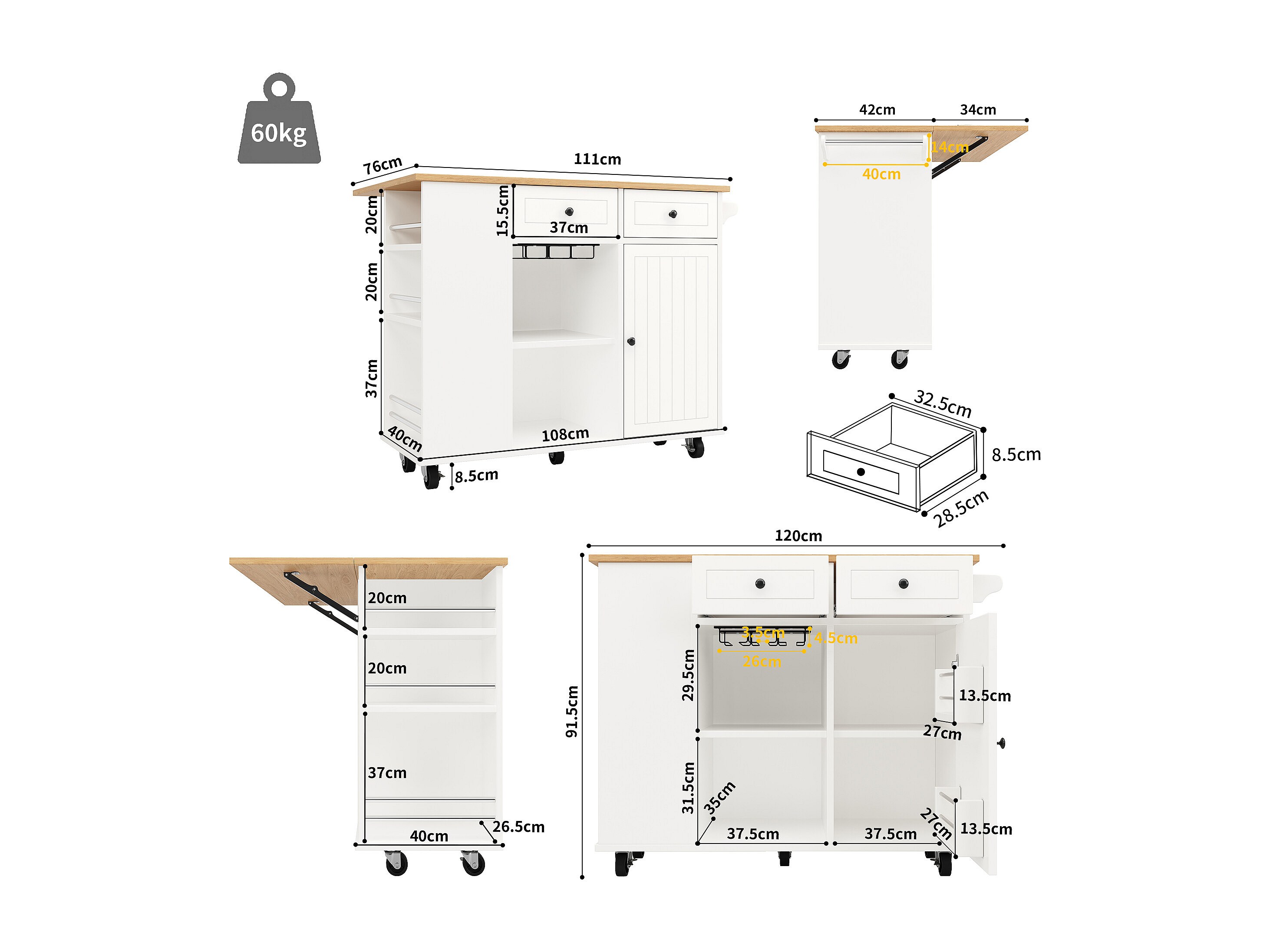 Desserte de cuisine mobile blanc avec porte-serviettes - Îlot central de cuisine avec 2 tiroirs et 1 porte - 5 compartiments de rangement ouverts
