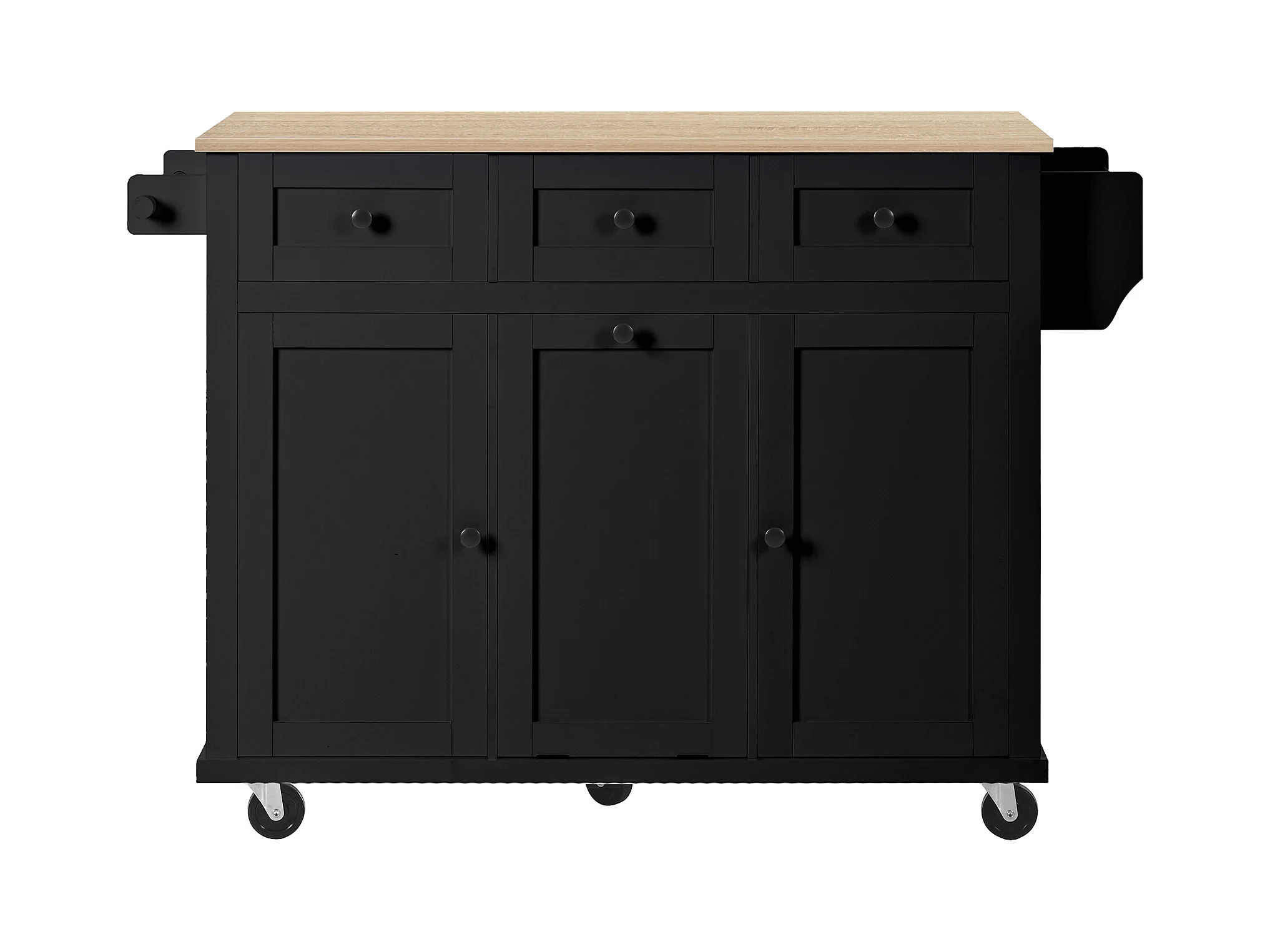 Îlot central mobile avec plateau en bois, 3 portes texturées et étagère à épices - noir