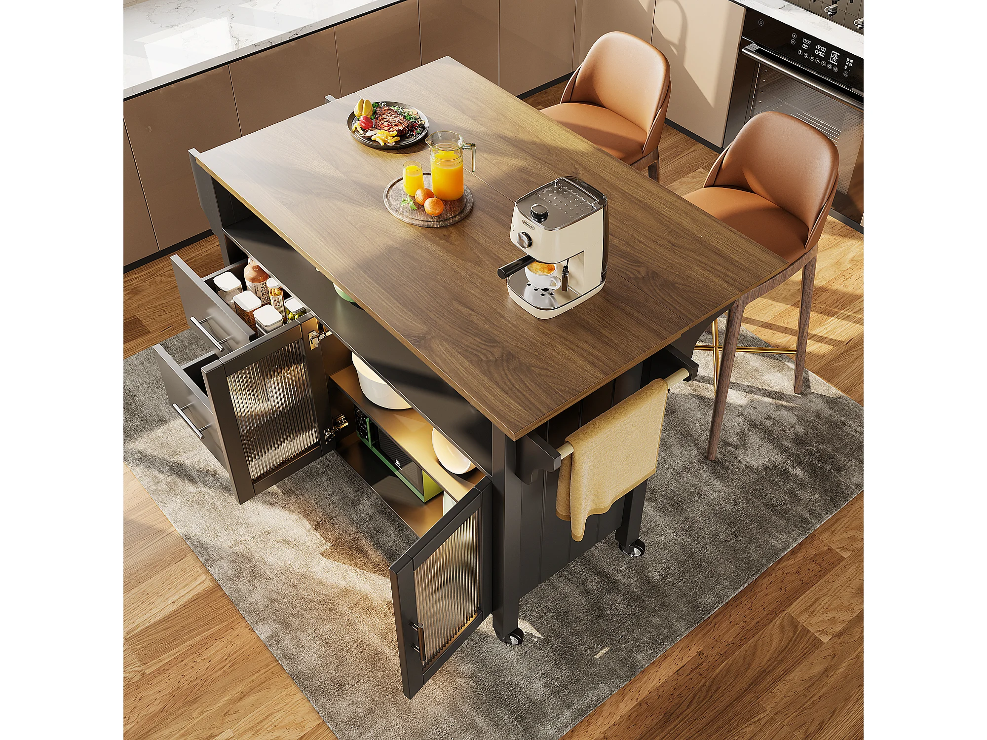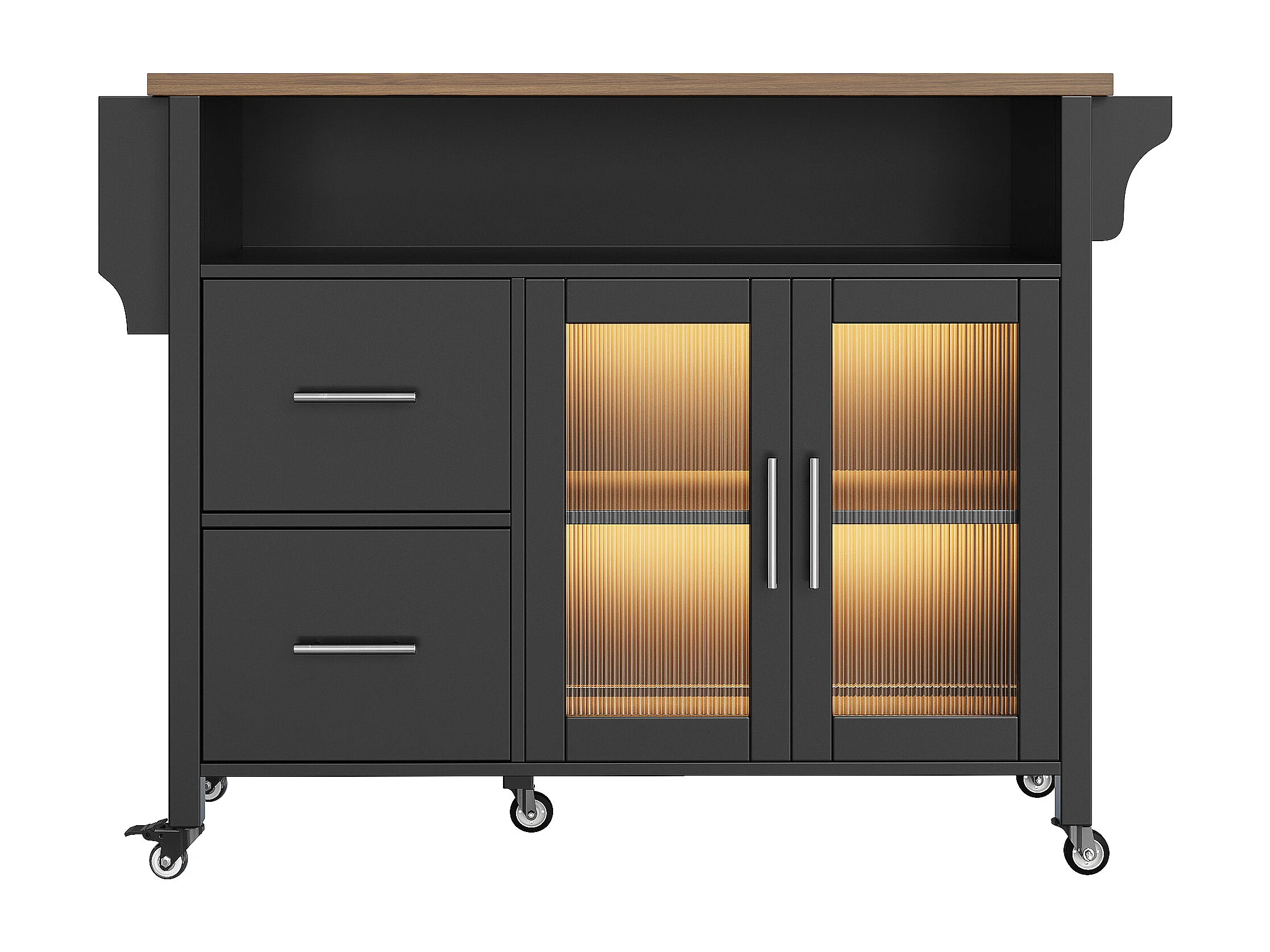 Desserte de cuisine sur roulettes avec plateau extensible, 2 portes en verre, 2 tiroirs et 1 niches, LED inclus, noir - 139x65x94cm