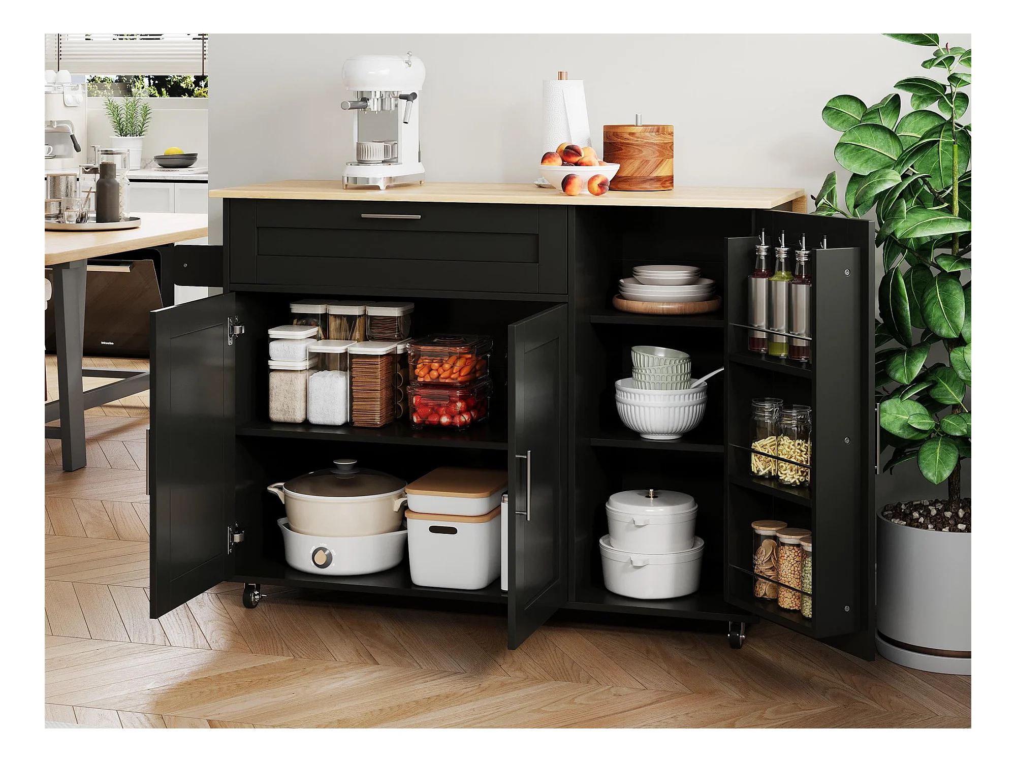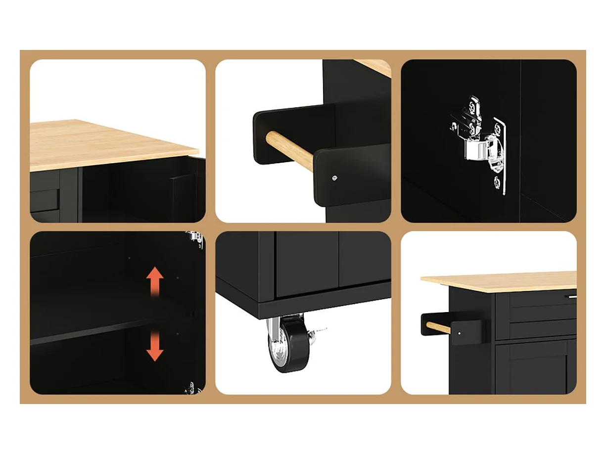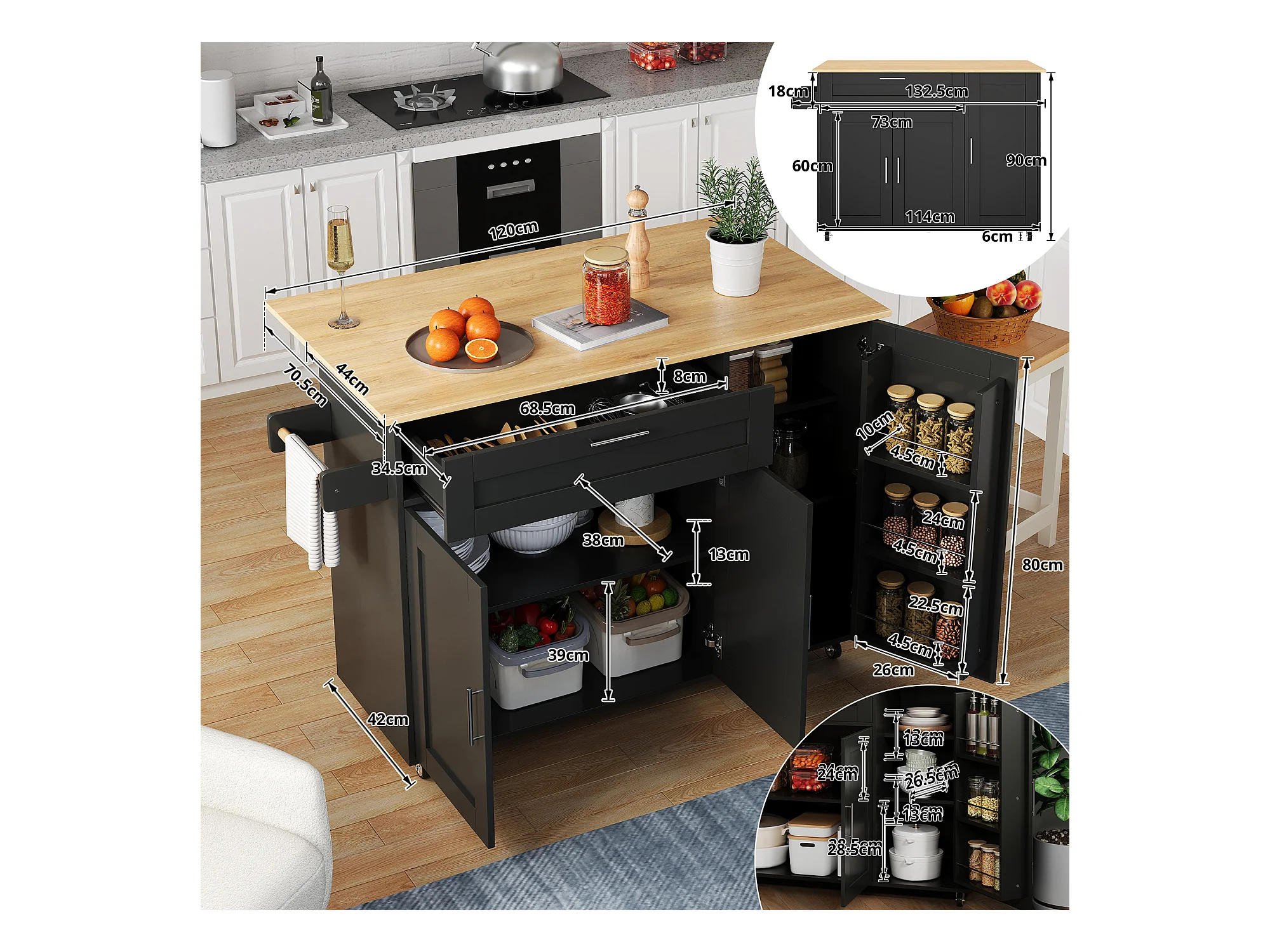 Ilot central de cuisine - chariot à roulette avec plateau extensible - 2 tiroirs et 4 portes - Noir