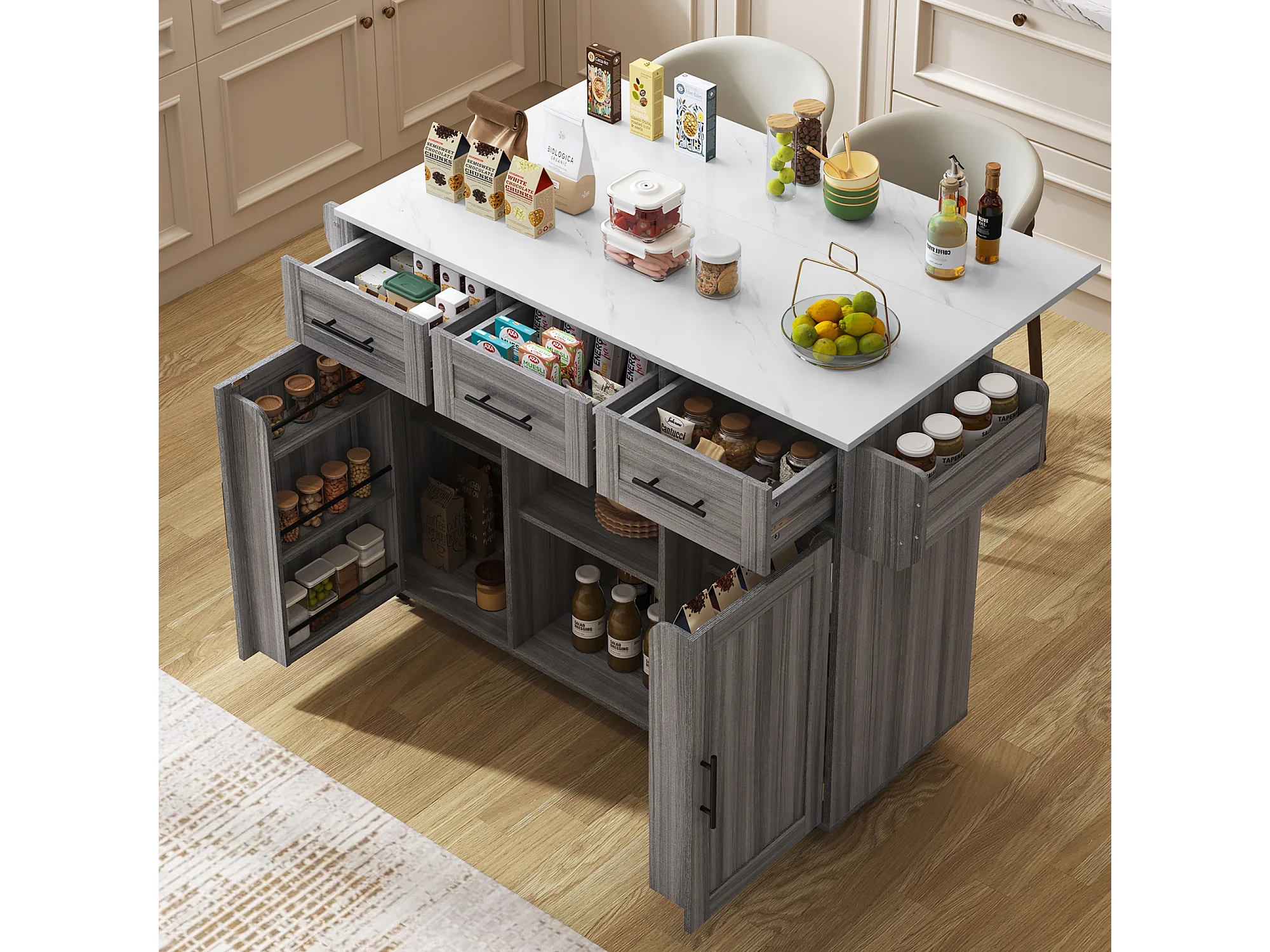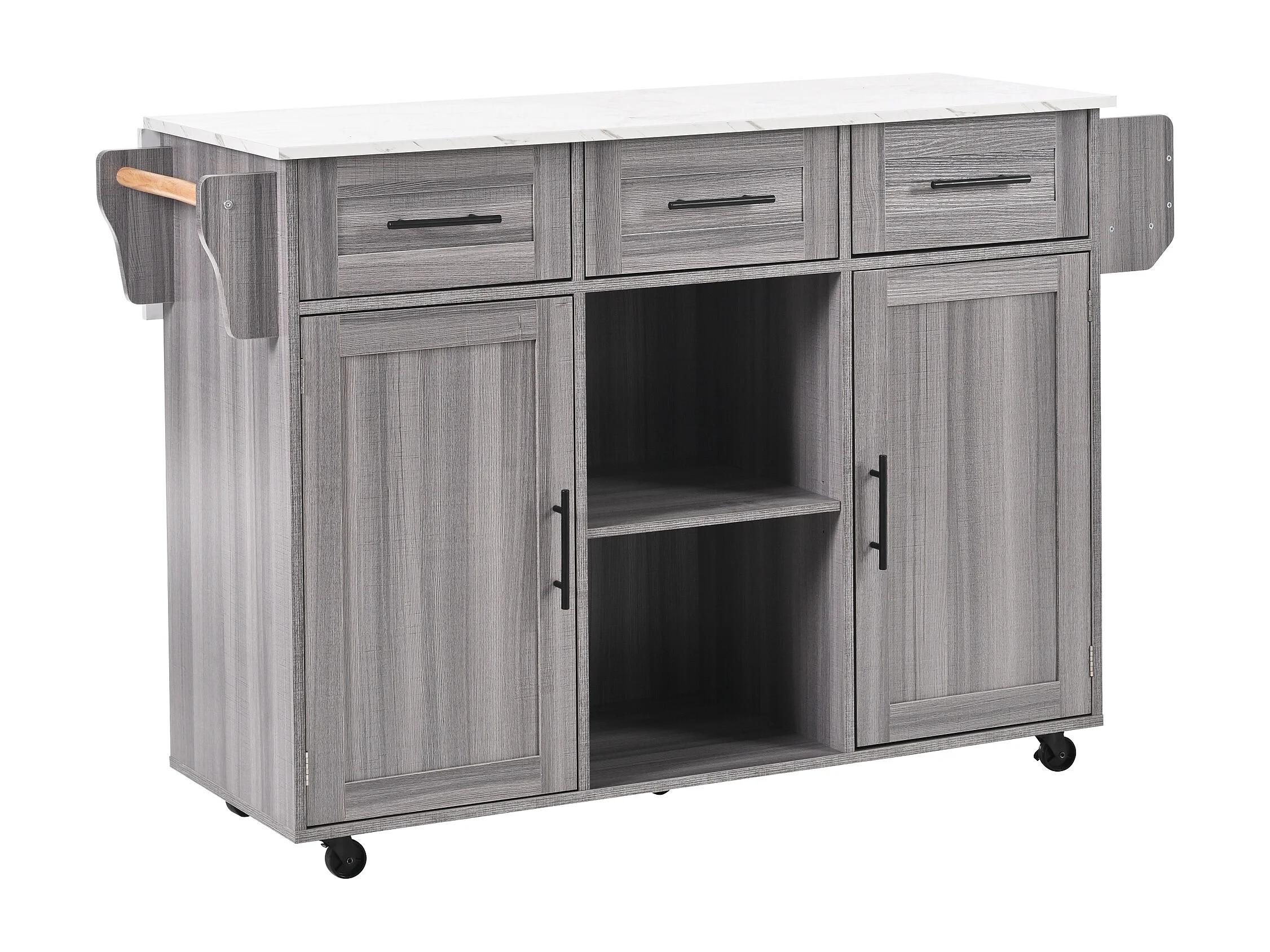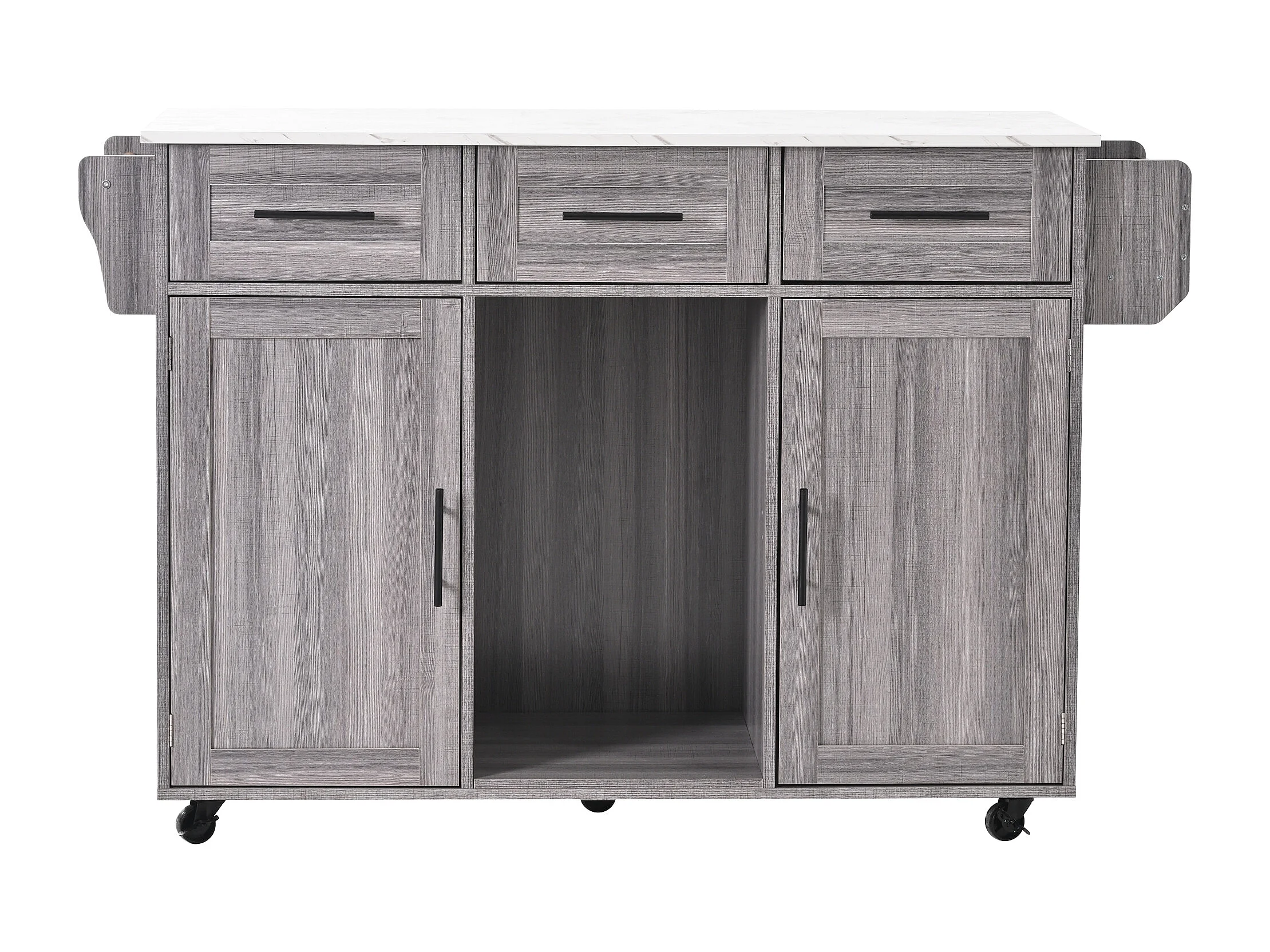 Îlot central de cuisine gris à 3 portes et 3 tiroirs - Desserte de cuisine avec porte-serviettes et rangement ouvert - plateau pliable